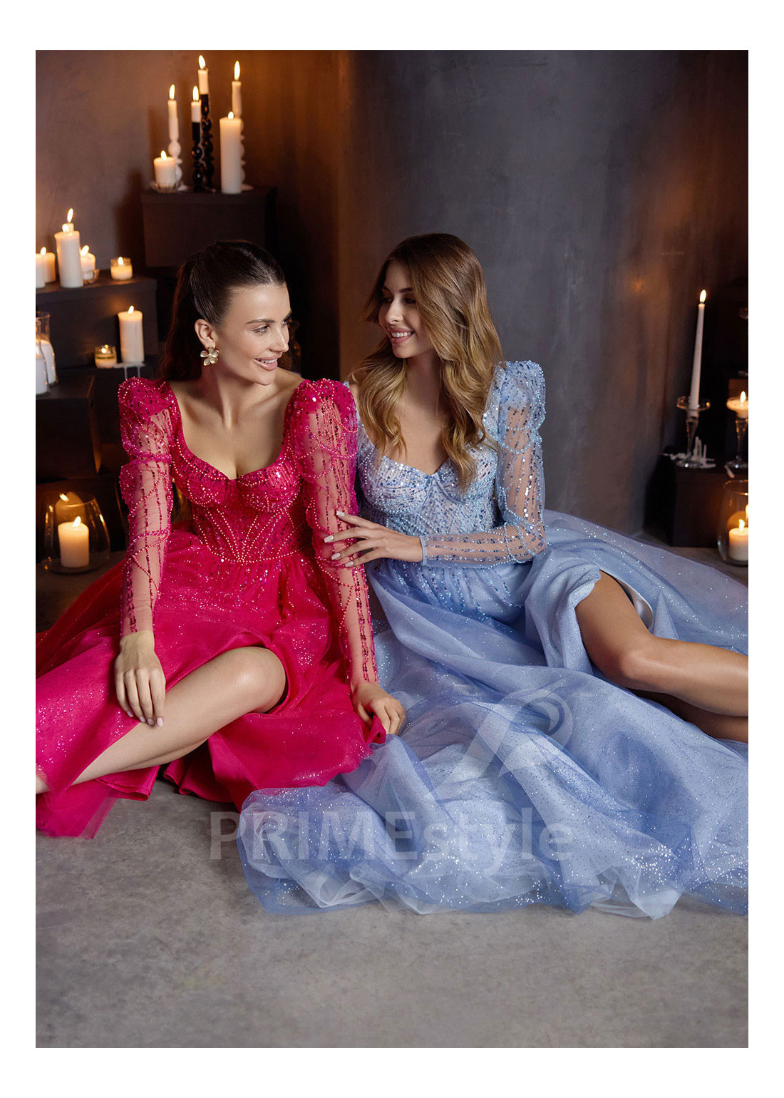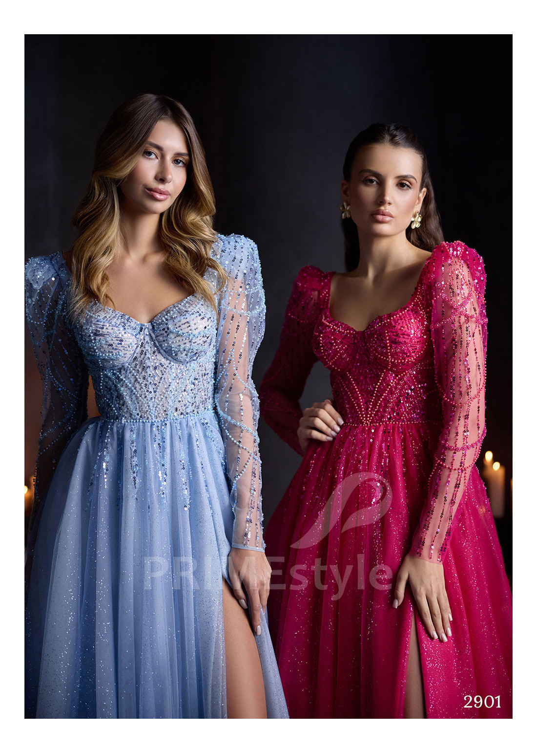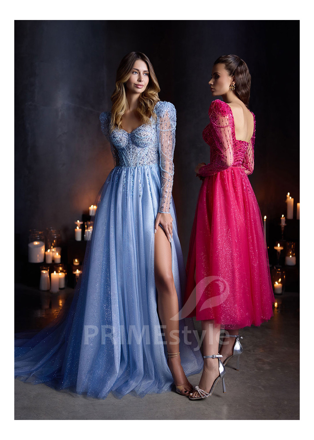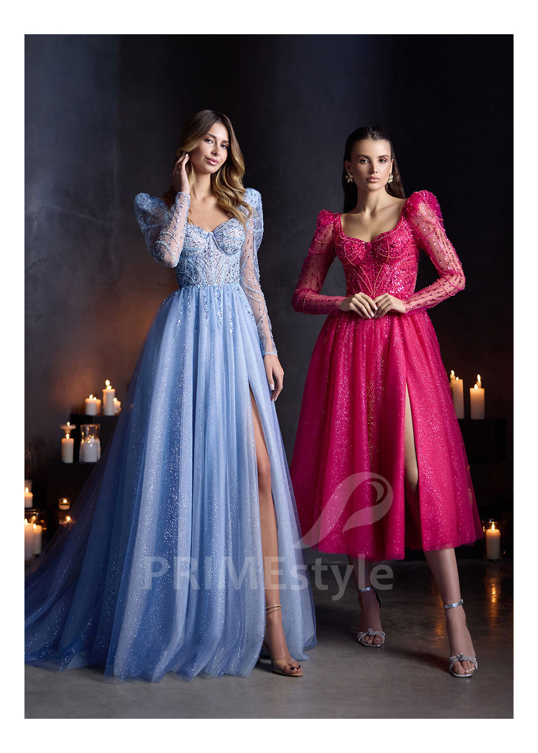 PRIMEstyle®Trblietavé spoločenské šaty s dlhým rukávom, otvoreným dekoltom, výstrihom do V-čka, odhaleným chrbtom a pekne tvarovanou padavou tylovou sukňou s rozparkom. Korzet a horná časť sukne sú zdobené bohatou vyšívanou čipkou. Možnosť ušitia s midi alebo maxi sukňou. Vhodné ako šaty na ples, večerné šaty a luxusné šaty na stužkovú.
