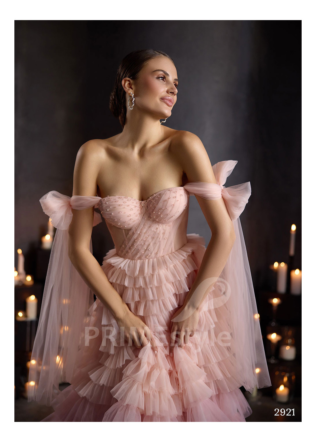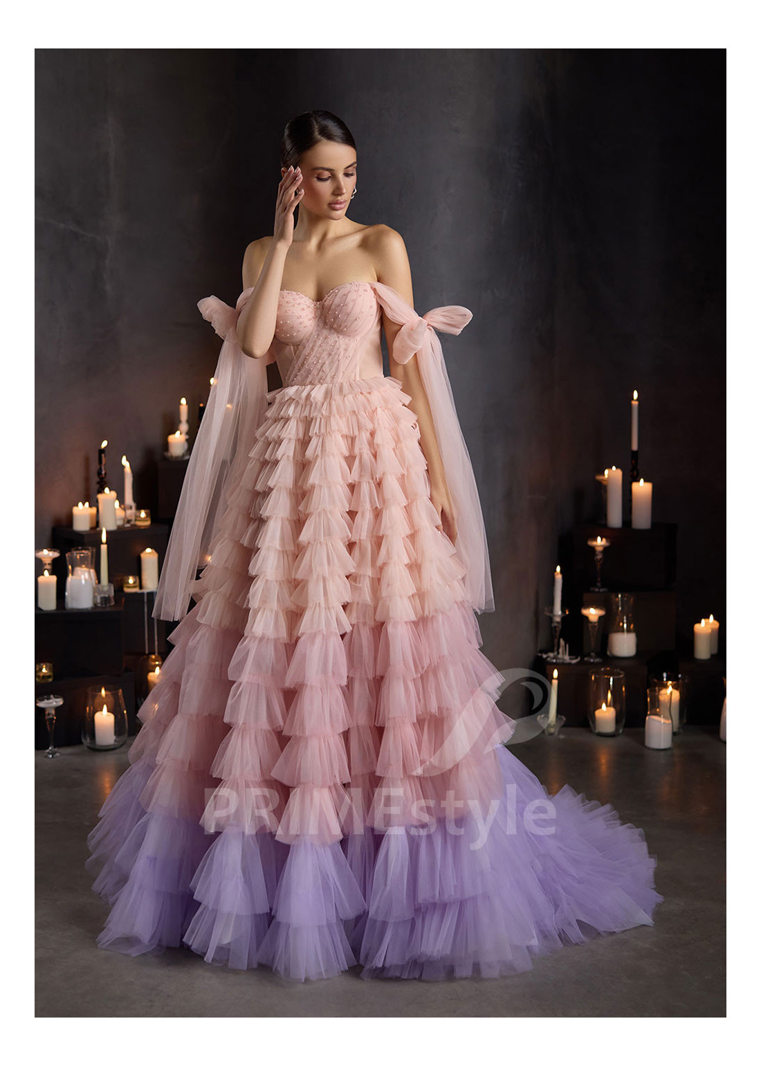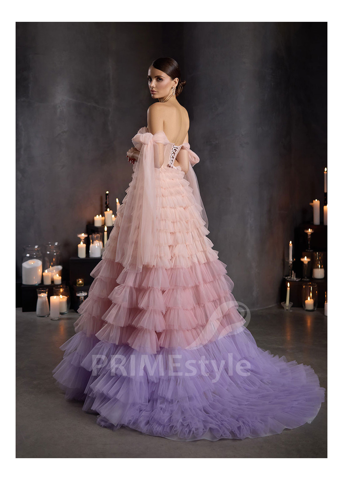 PRIMEstyle®Exkluzívne tylové spoločenské šaty s padnutými ramienkami, otvoreným dekoltom, odhaleným chrbtom a rozkošnou vrstvenou viacfarebnou sukňou. Vhodné aj ako luxusné večerné šaty.