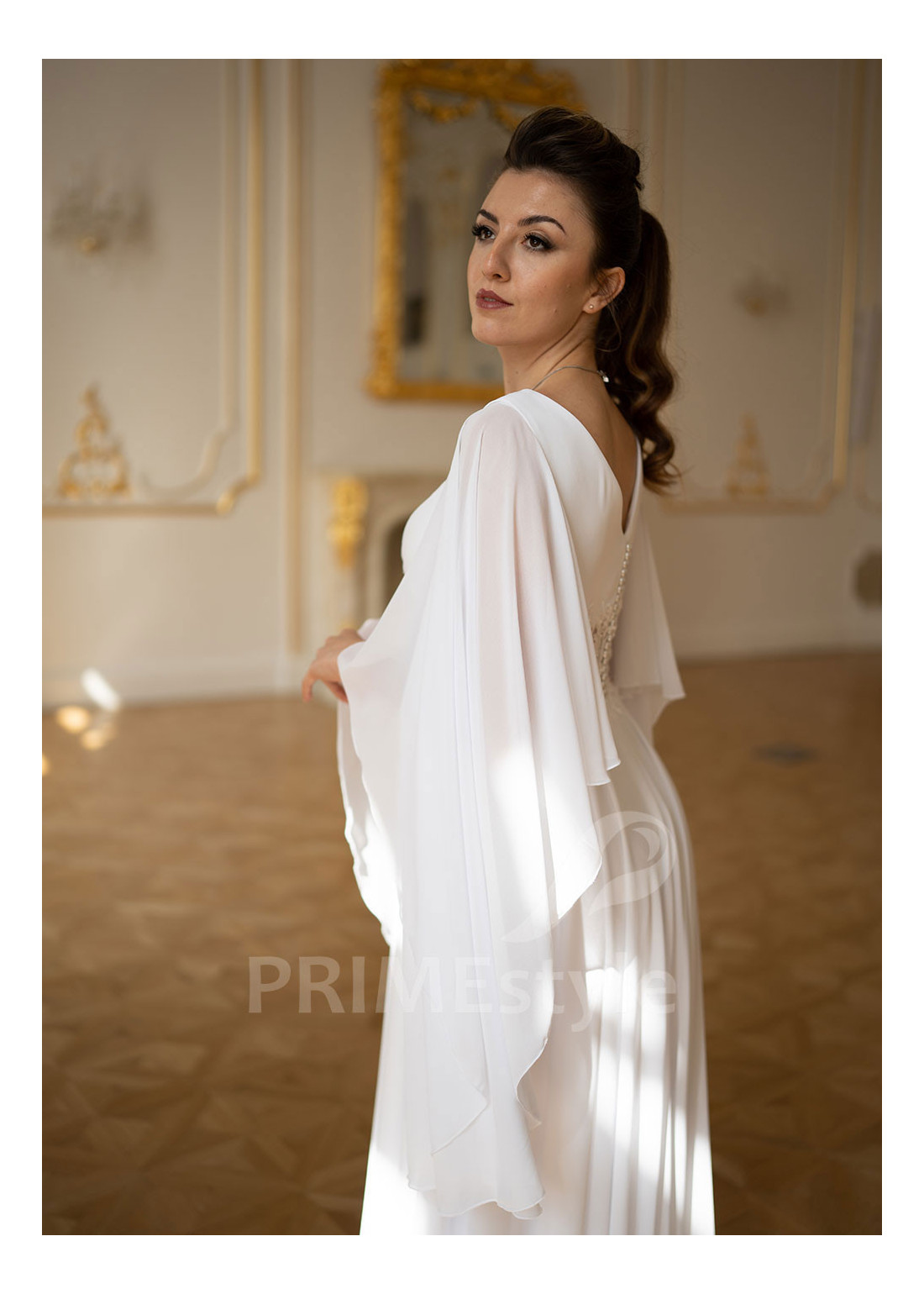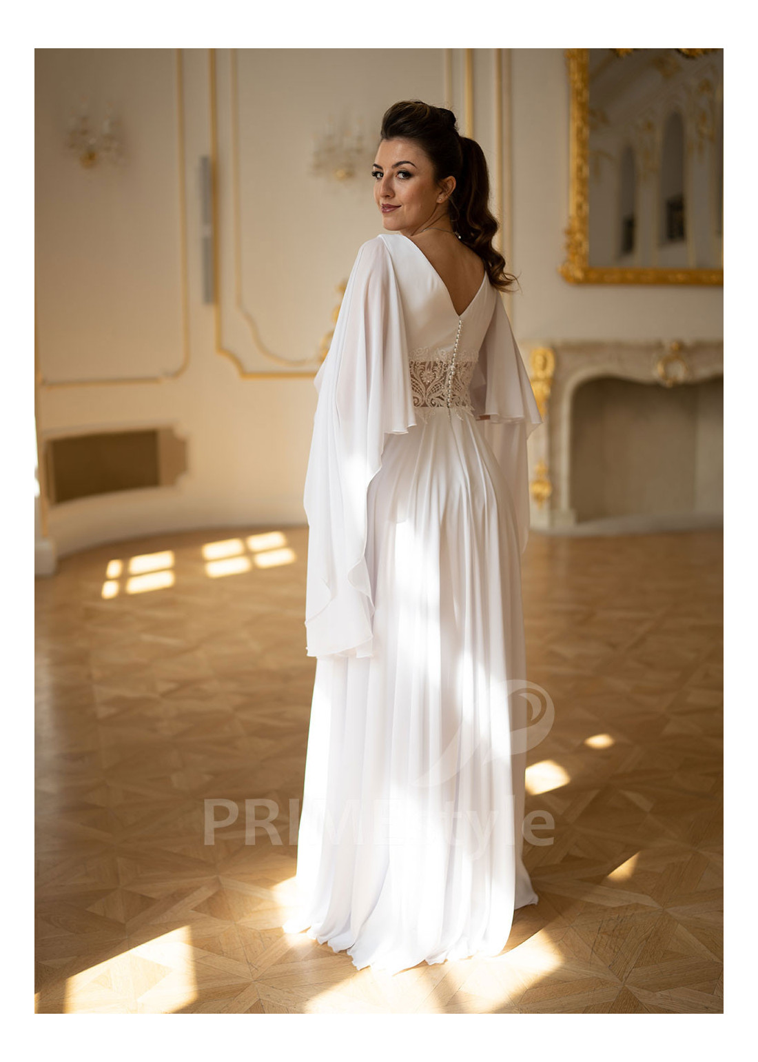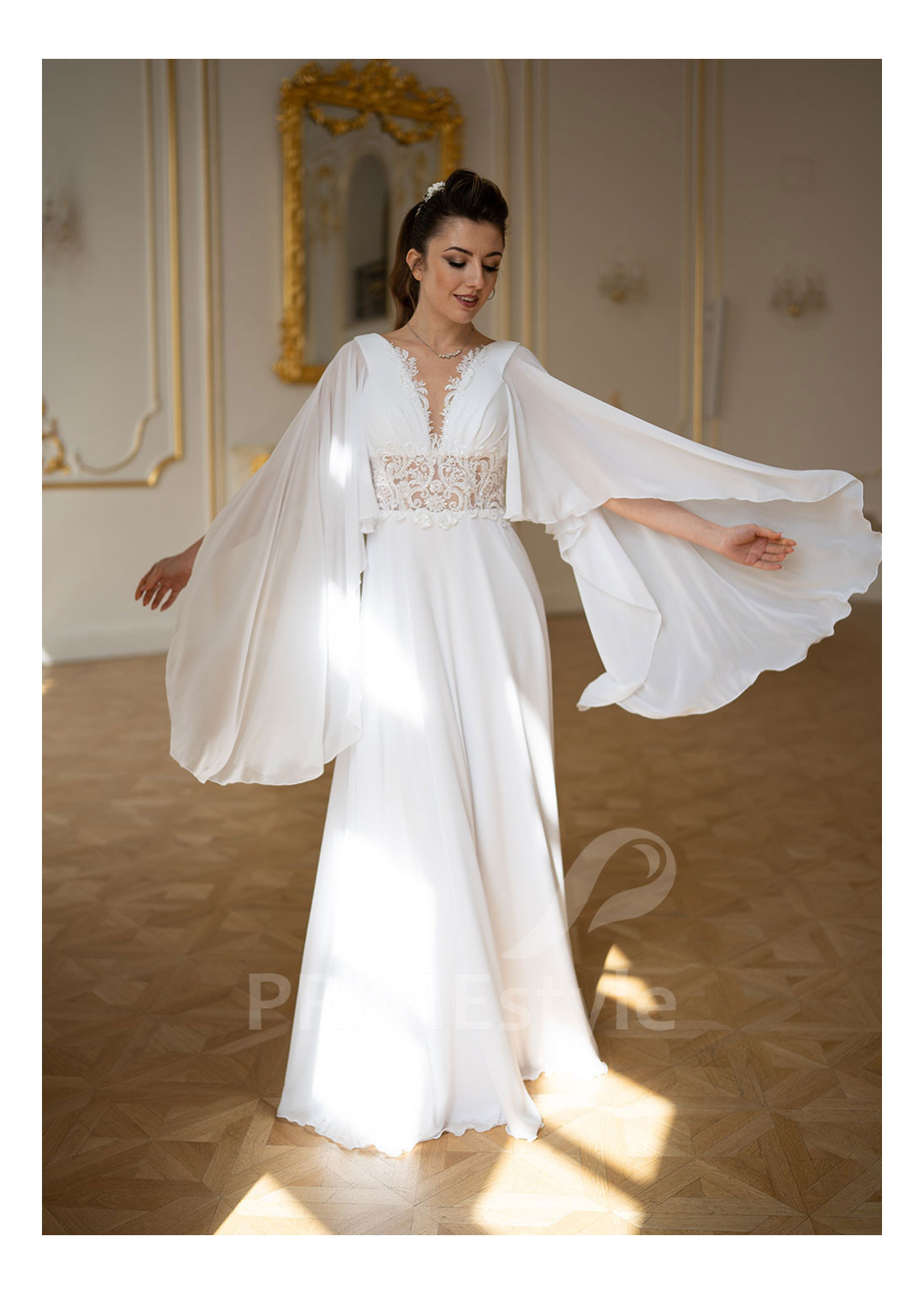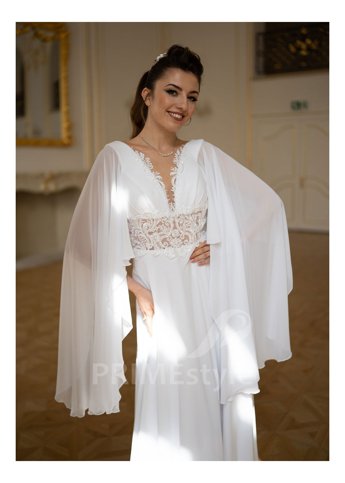 Rozkošné boho svadobné šaty s hlbokým výstrihom v tvare V, voľnými prehozovými rukávmi, mierne otvoreným chrbtom a padavou krásne tvarovanou šifónovou sukňou. Pás a okraje korzetu sú zdobené bohatou vyšívanou čipkou. Vhodné ako svadobné šaty pre moletky a ako svadobné šaty pre staršie nevesty.
