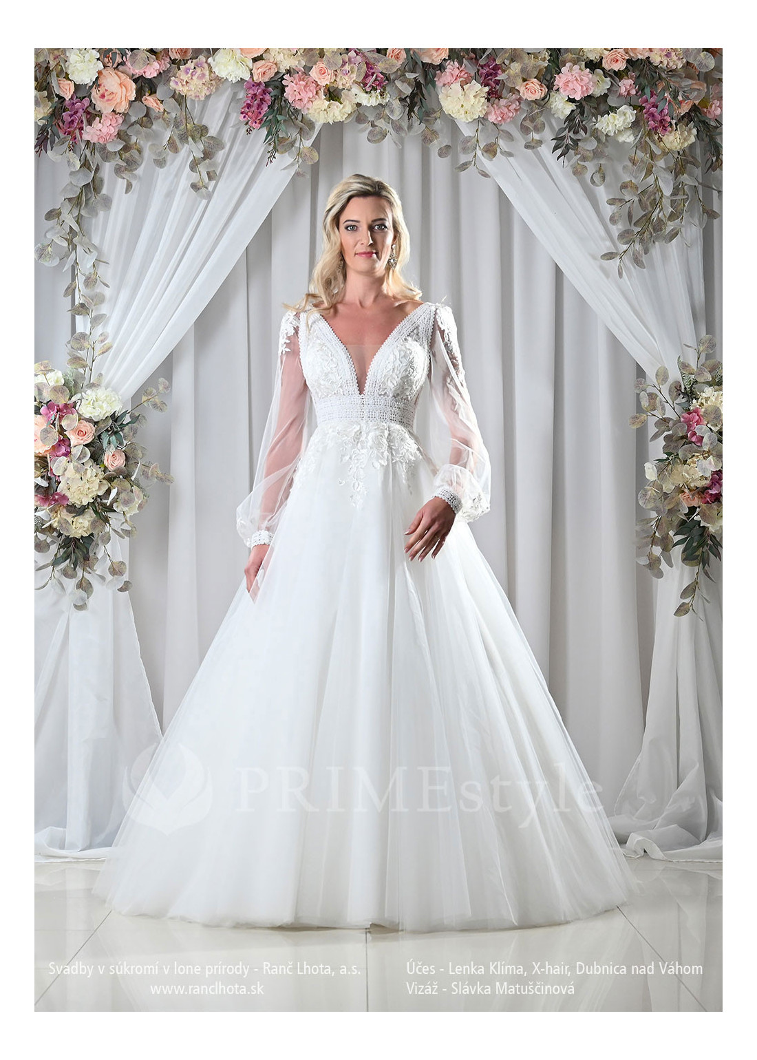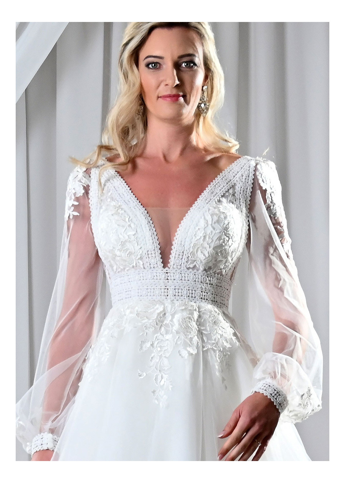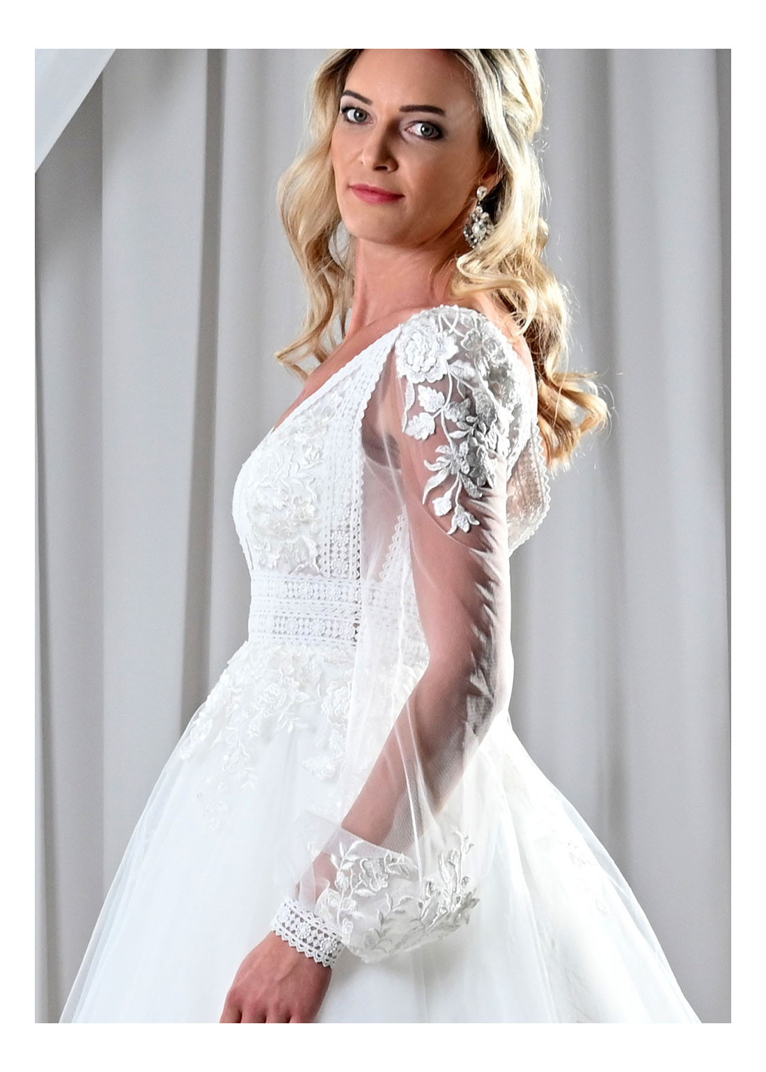 Decentné svadobné šaty, zdobené kombinovanou čipkou, s hlbokým V-výstrihom, čipkovanými balónovými rukávmi a vzdušnou tylovou sukňou. Vhodné aj ako svadobné šaty pre staršie nevesty.