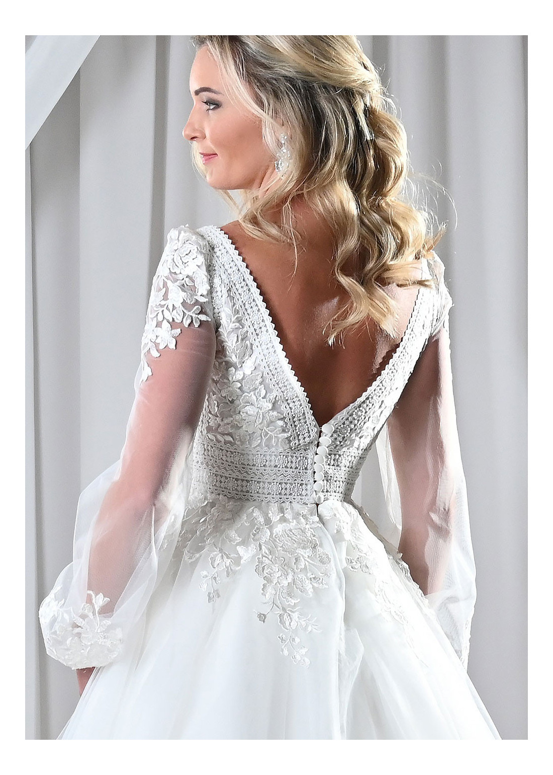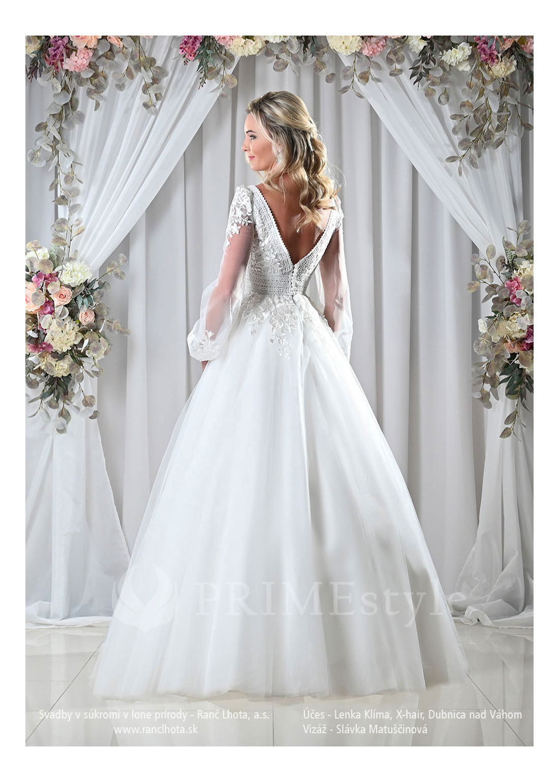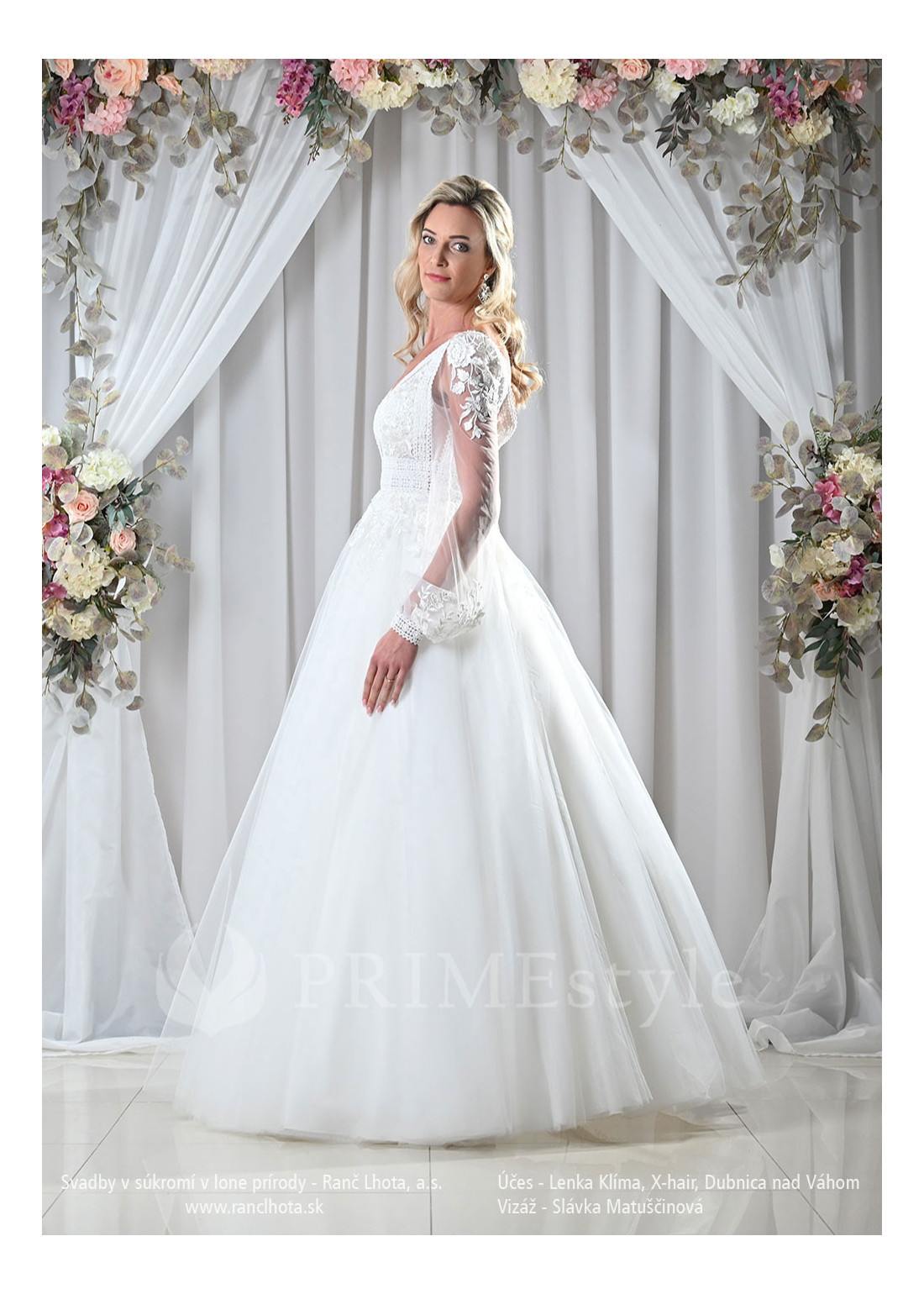 Decentné svadobné šaty, zdobené kombinovanou čipkou, s hlbokým V-výstrihom, čipkovanými balónovými rukávmi a vzdušnou tylovou sukňou. Vhodné aj ako svadobné šaty pre staršie nevesty.