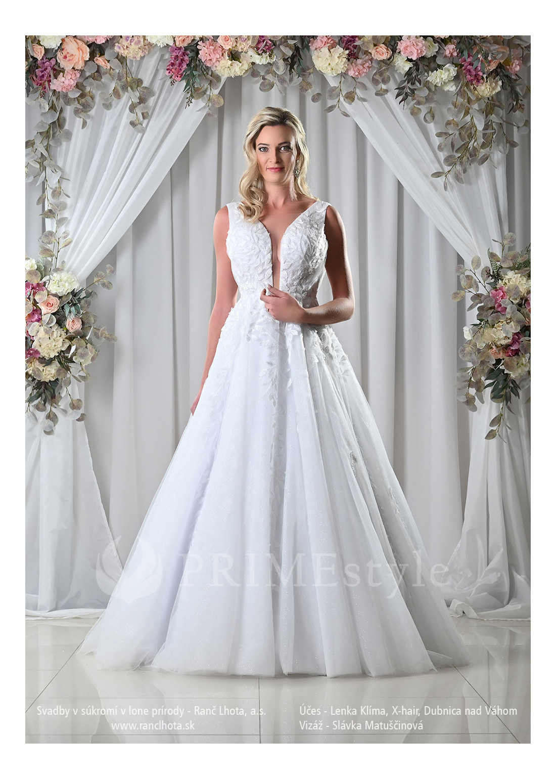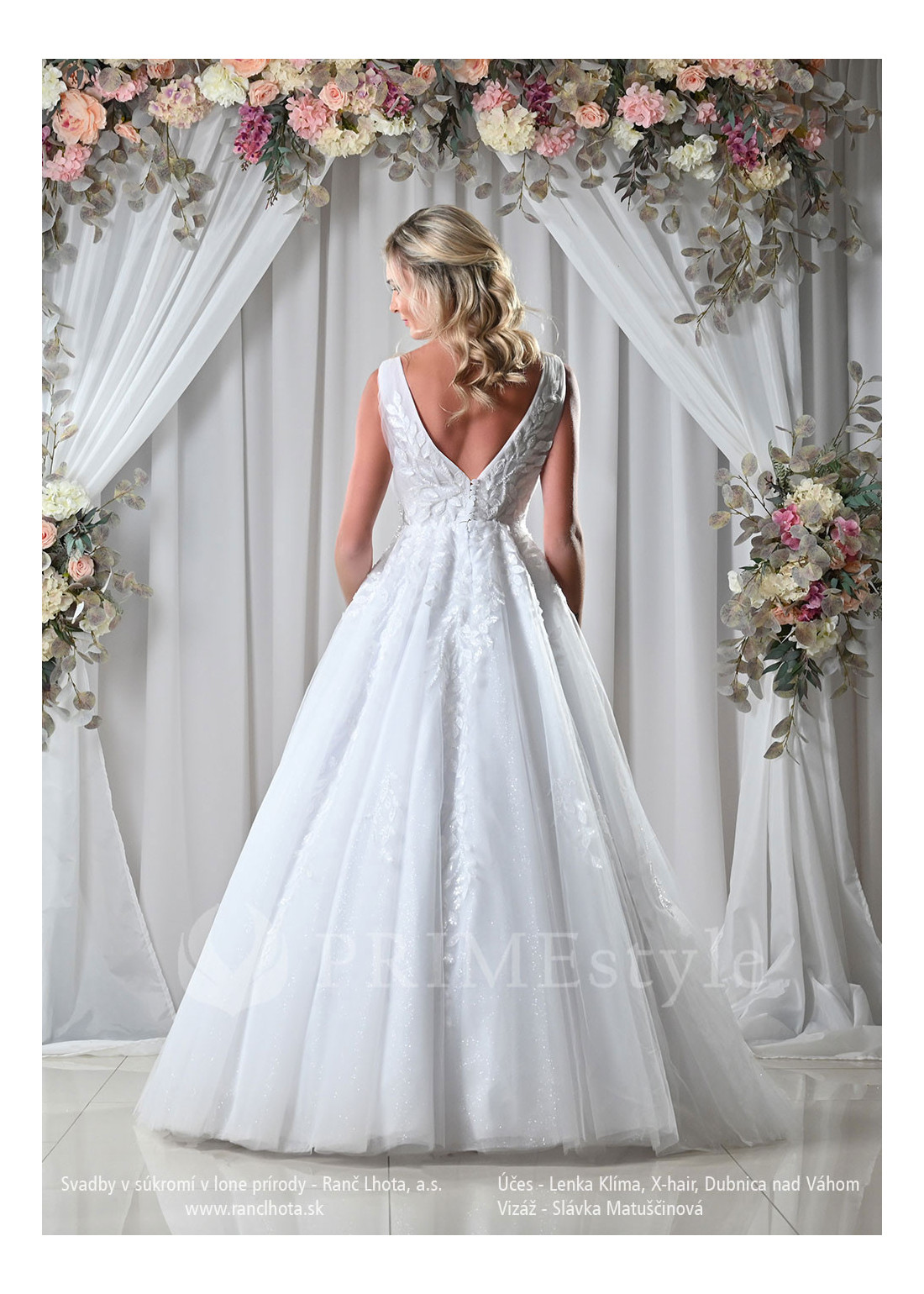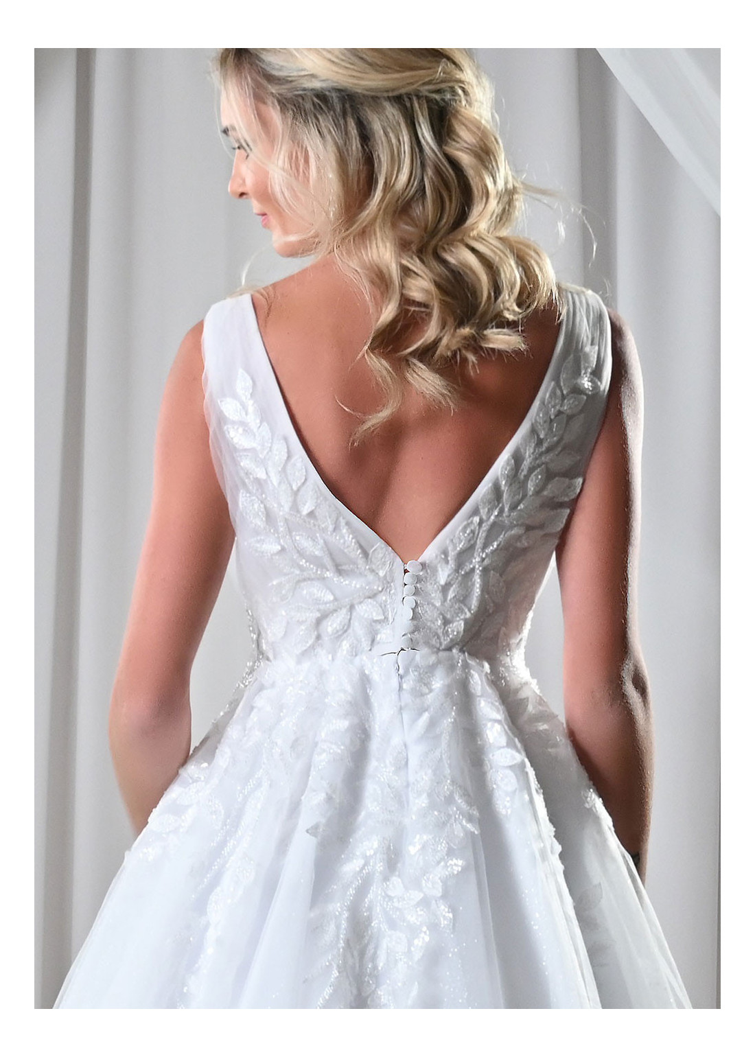 Tylové svadobné šaty zdobené vyšívanou modernou čipkou v tvare lístkov, s hlbokým extravagantným výstrihom a odhaleným chrbtom.