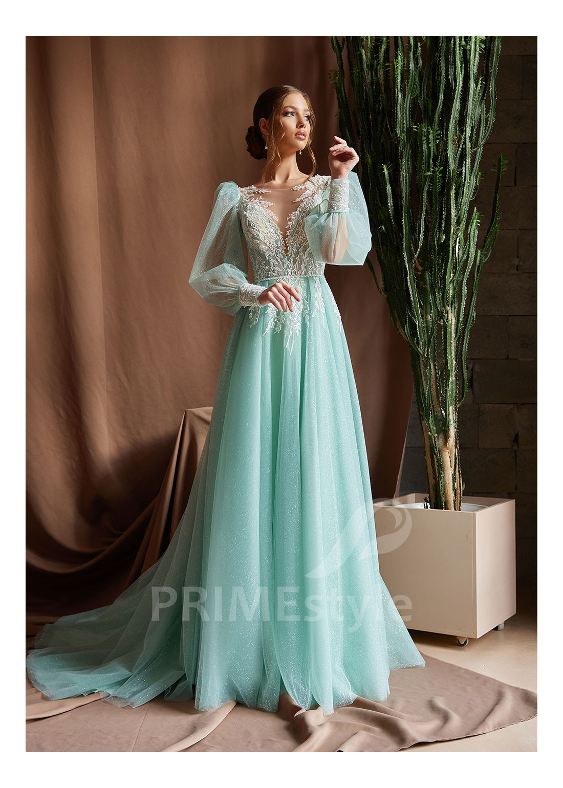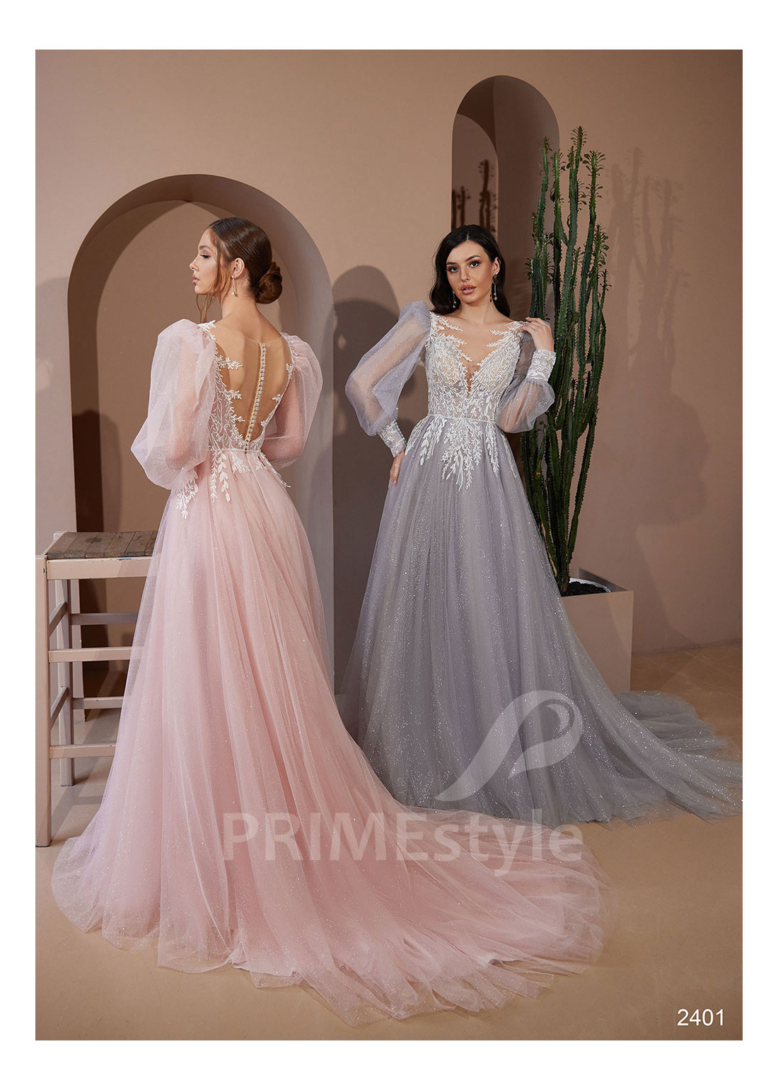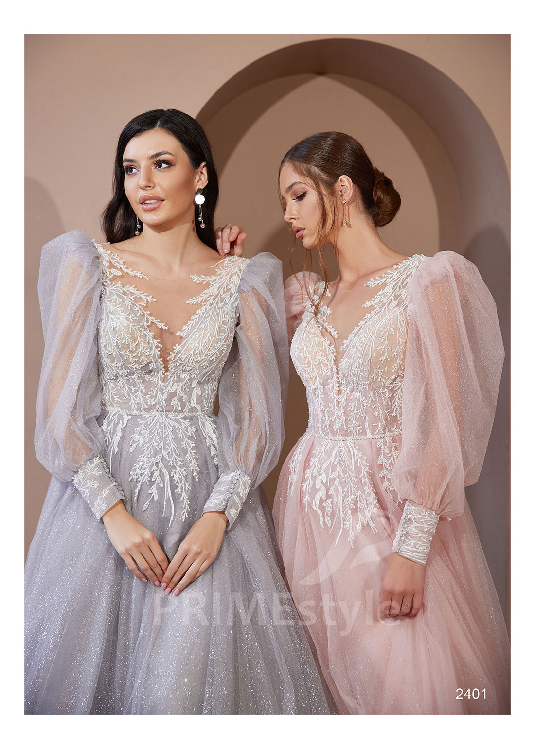 Trblietavé spoločenské šaty s V-výstrihom na hrudi a objemnými balónovými rukávmi. Korzet a horná časť sukne sú zdobené bohatou vyšívanou čipkou. Vhodné aj ako šaty na ples alebo šaty pre svadobné mamy.