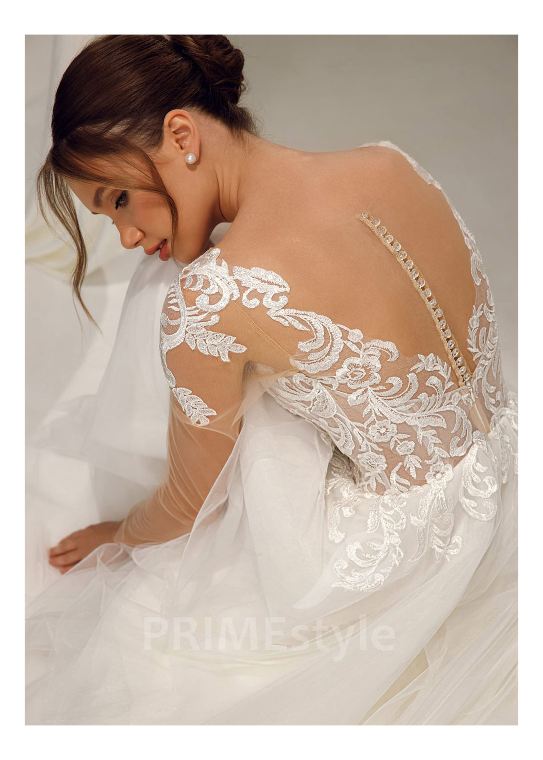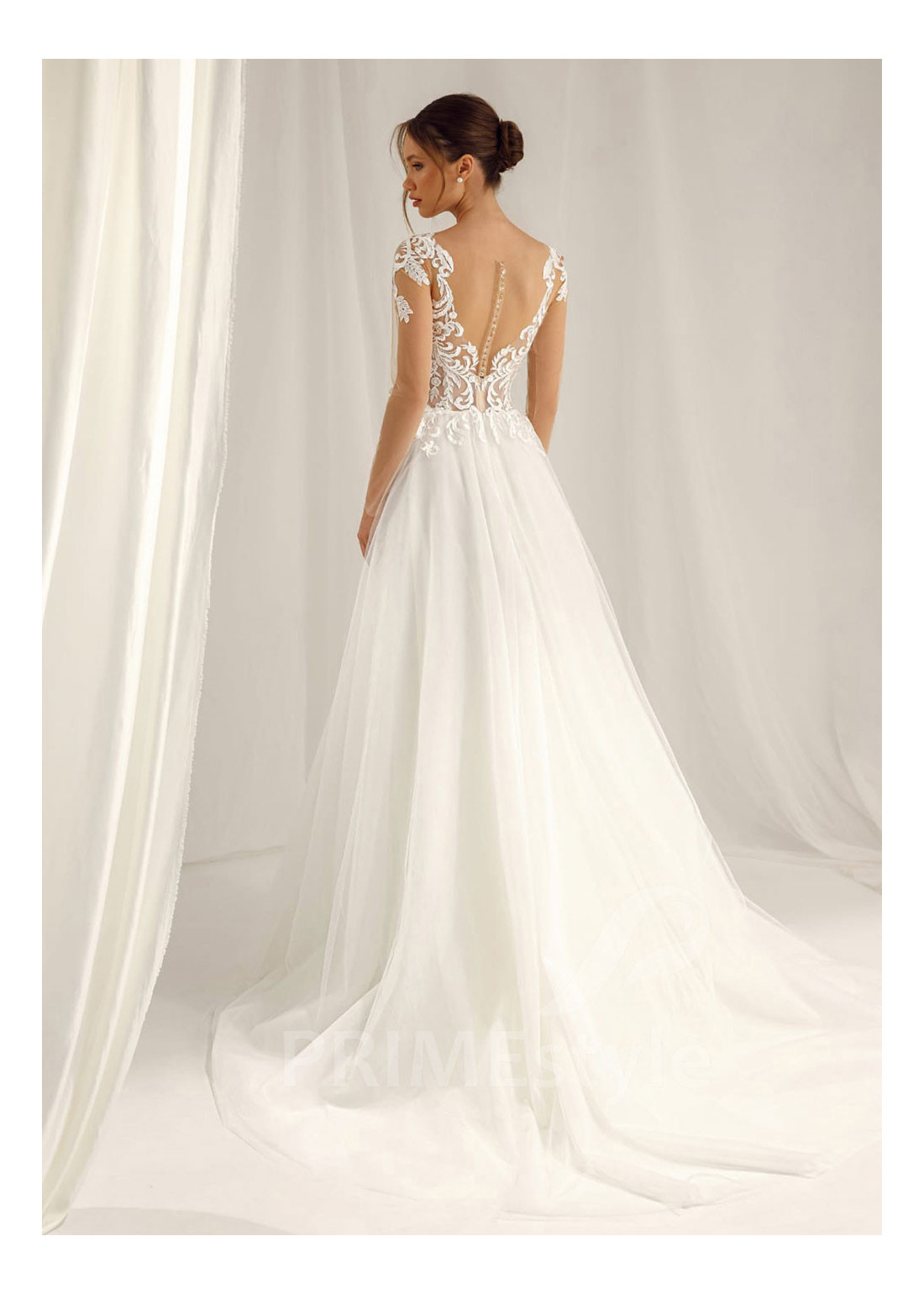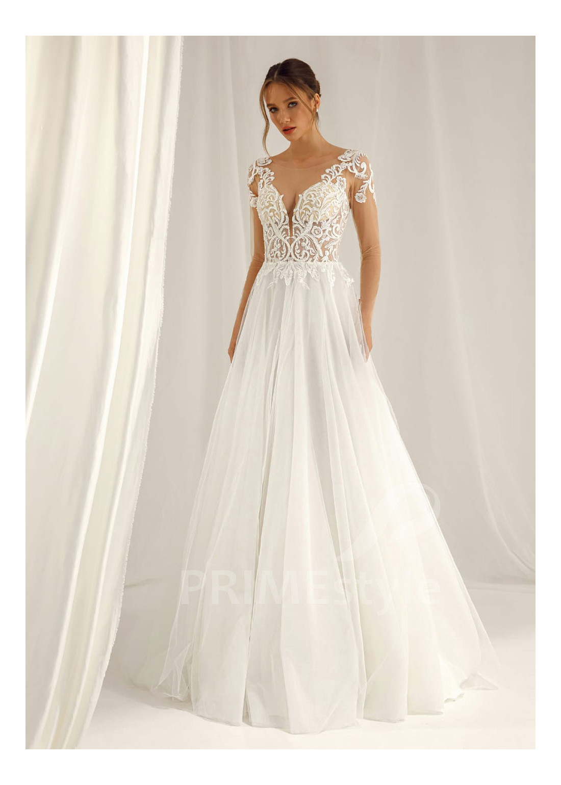Decentné minimalistické svadobné šaty s dlhým rukávom, trendovým hlbokým výstrihom do V-čka, odhaleným chrbtom a vzdušnou tylovou sukňou. Korzet, rukávy a horná časť sukne sú zdobené bohatou vyšívanou čipkou.