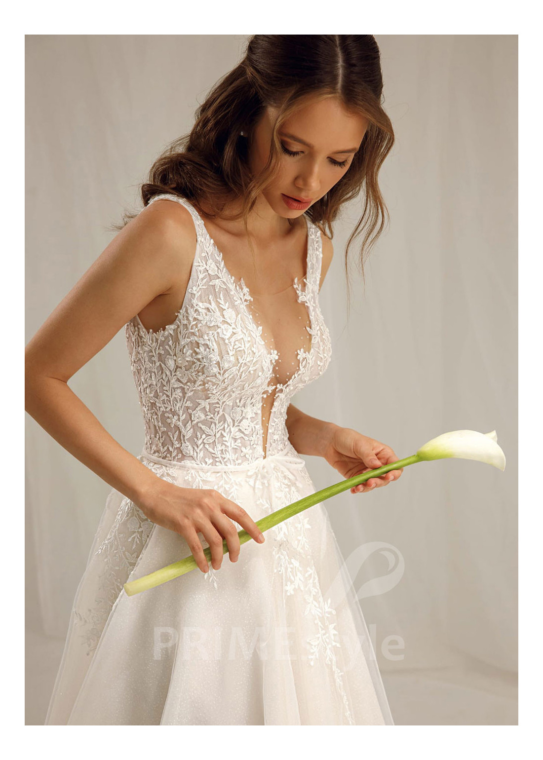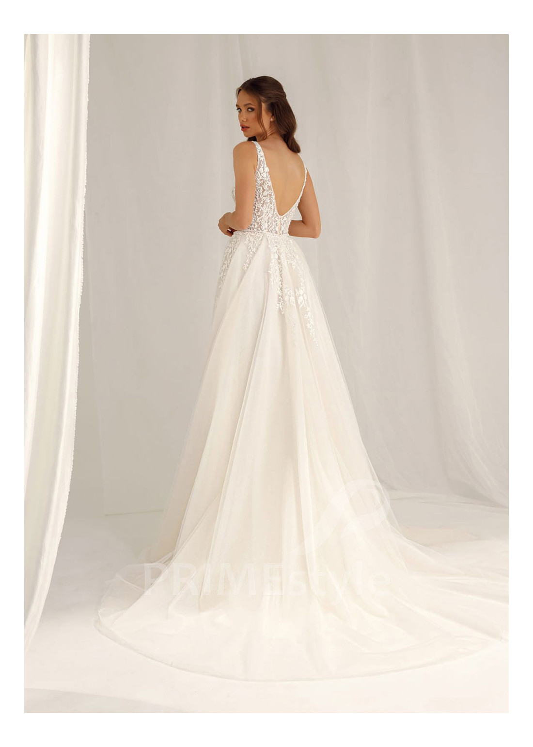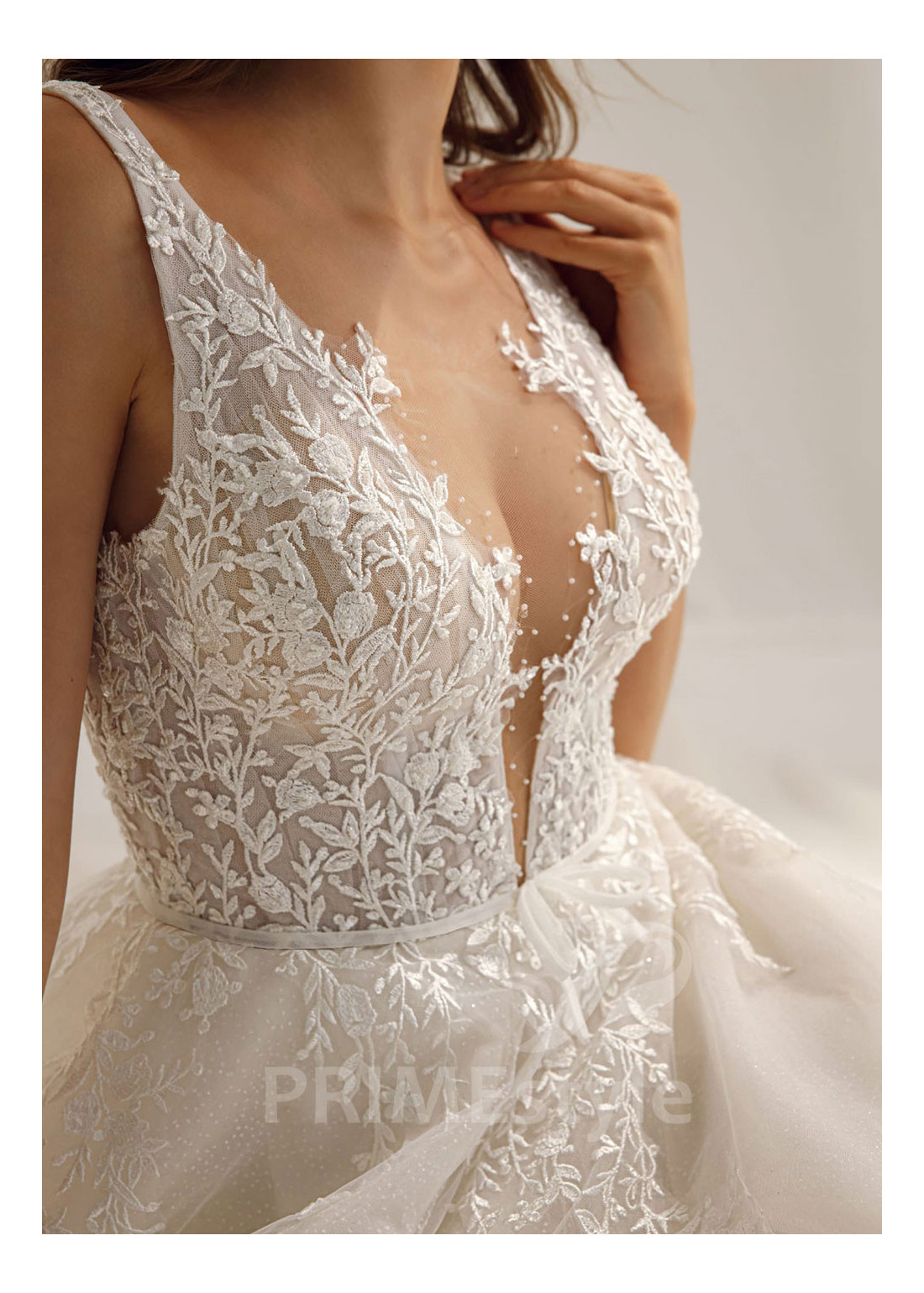 Moderné extravagantné svadobné šaty s otvoreným dekoltom, hlbokým V-výstrihom na hrudi a ľahkou padavou tylovou sukňou. Korzet a horná časť sukne sú zdobené bohatou vyšívanou čipkou.