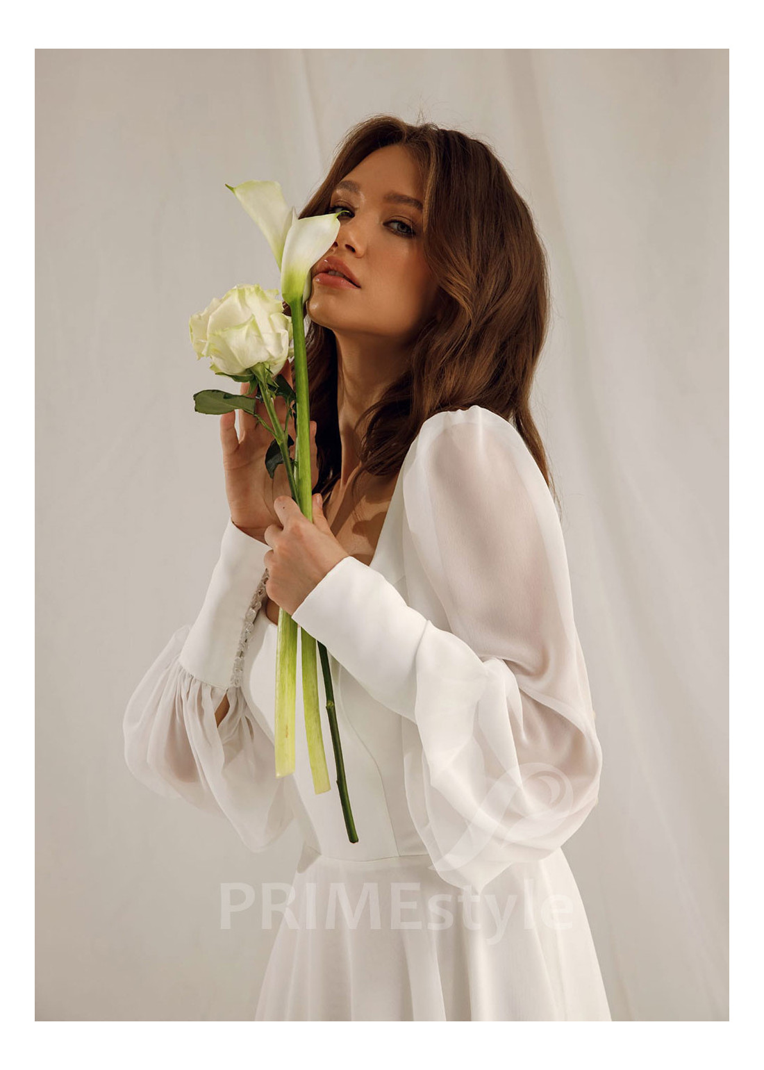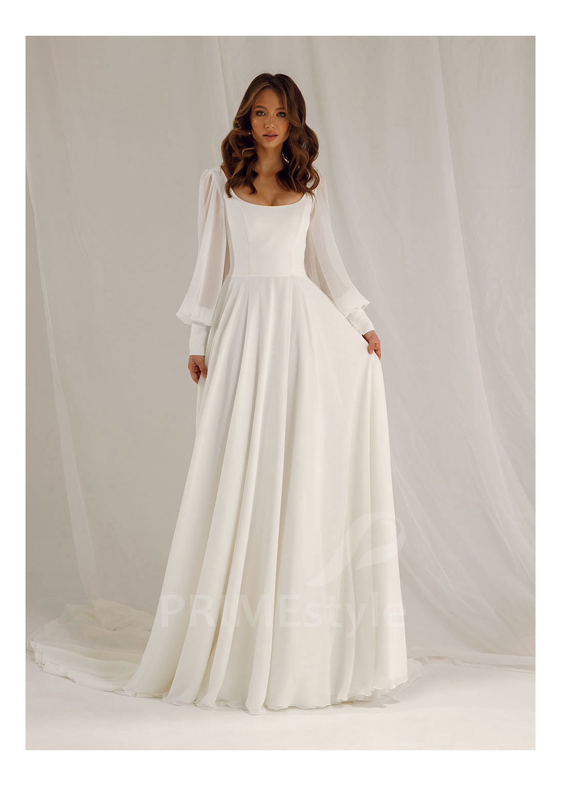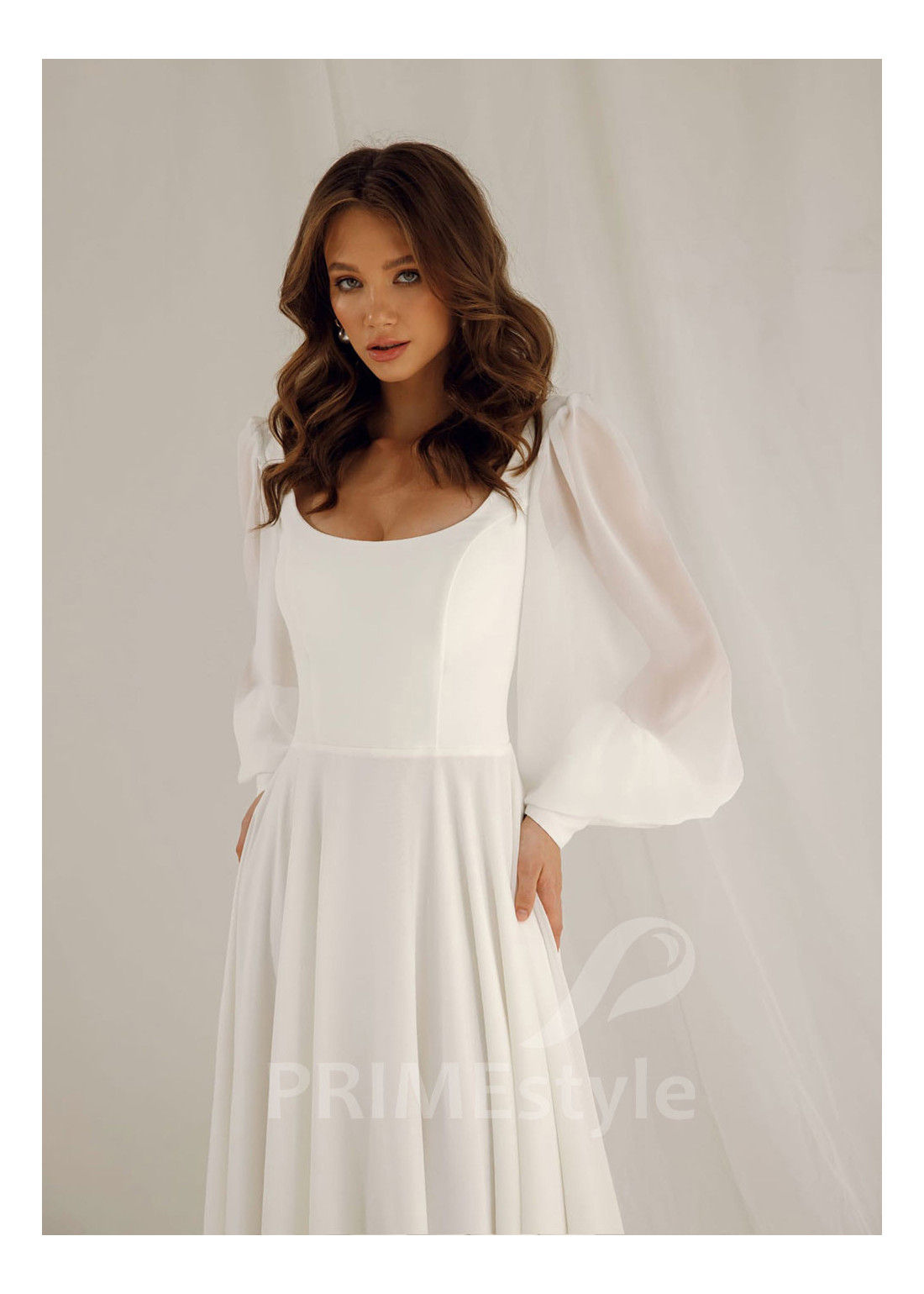 Šifónové minimalistické svadobné šaty s dlhým balónovým rukávom, trendovým okruhlým výstrihom na hrudi, mierne odhaleným chrbtom a pekne tvarovanou padavou sukňou. Vhodné aj ako svadobné šaty pre staršie nevesty.