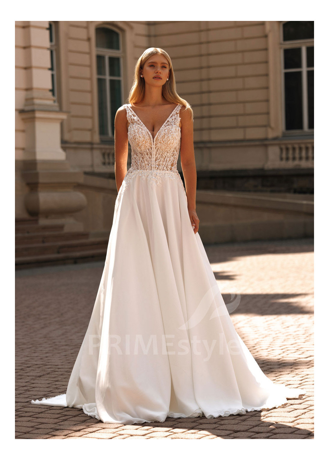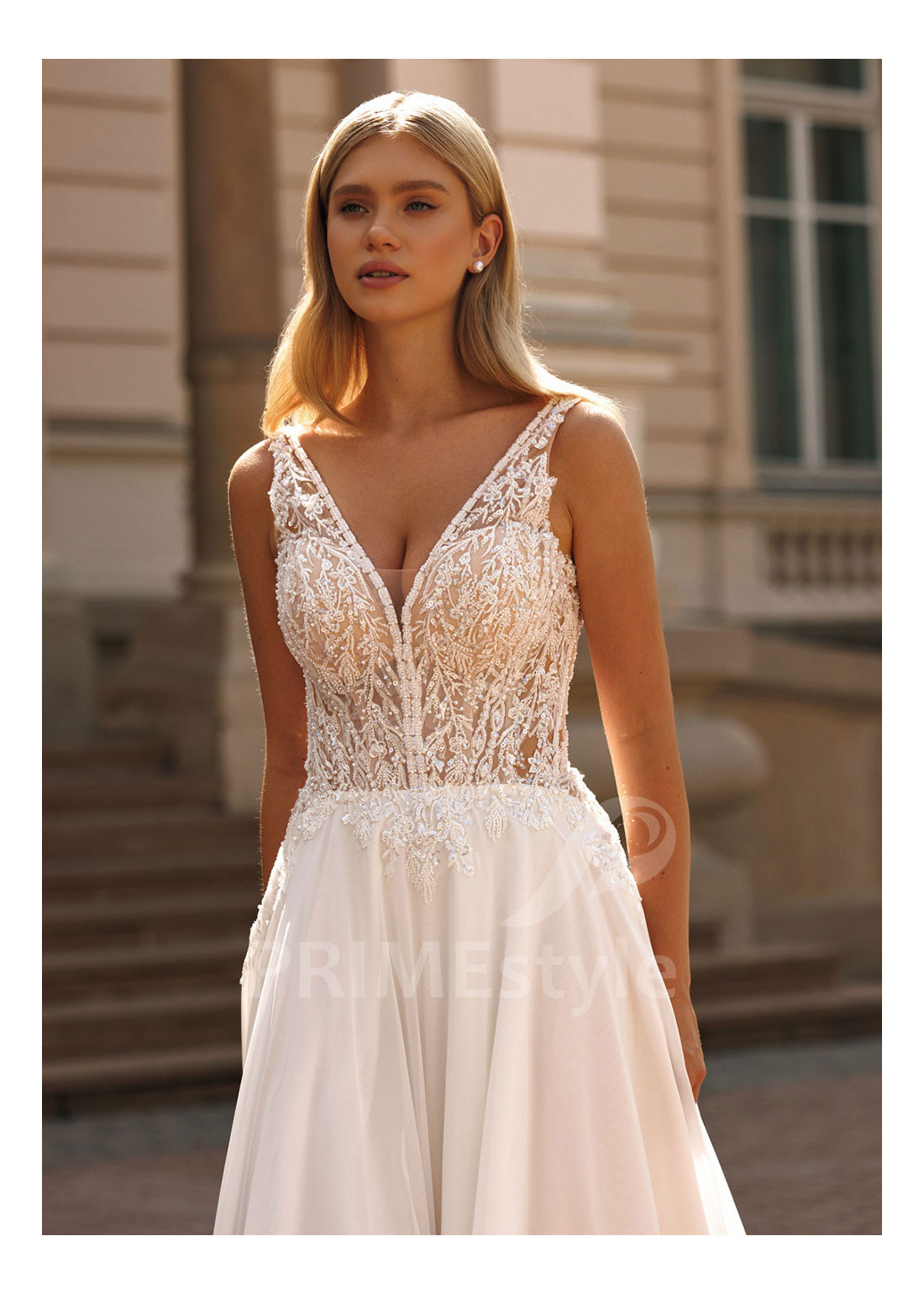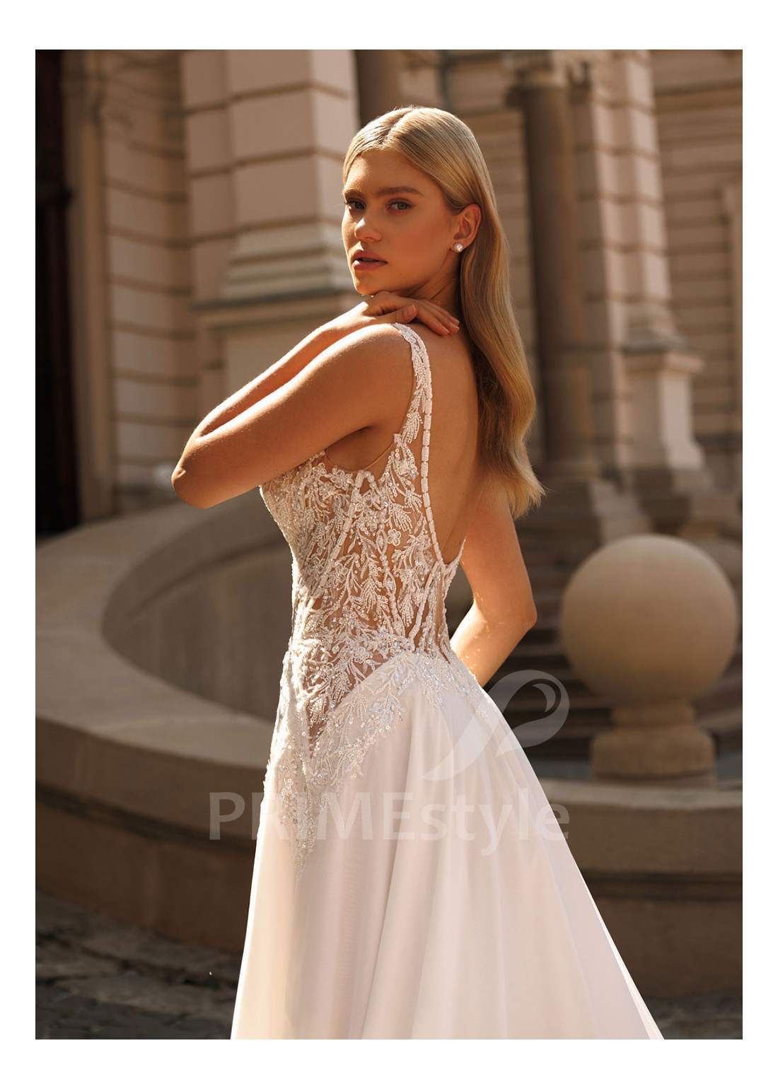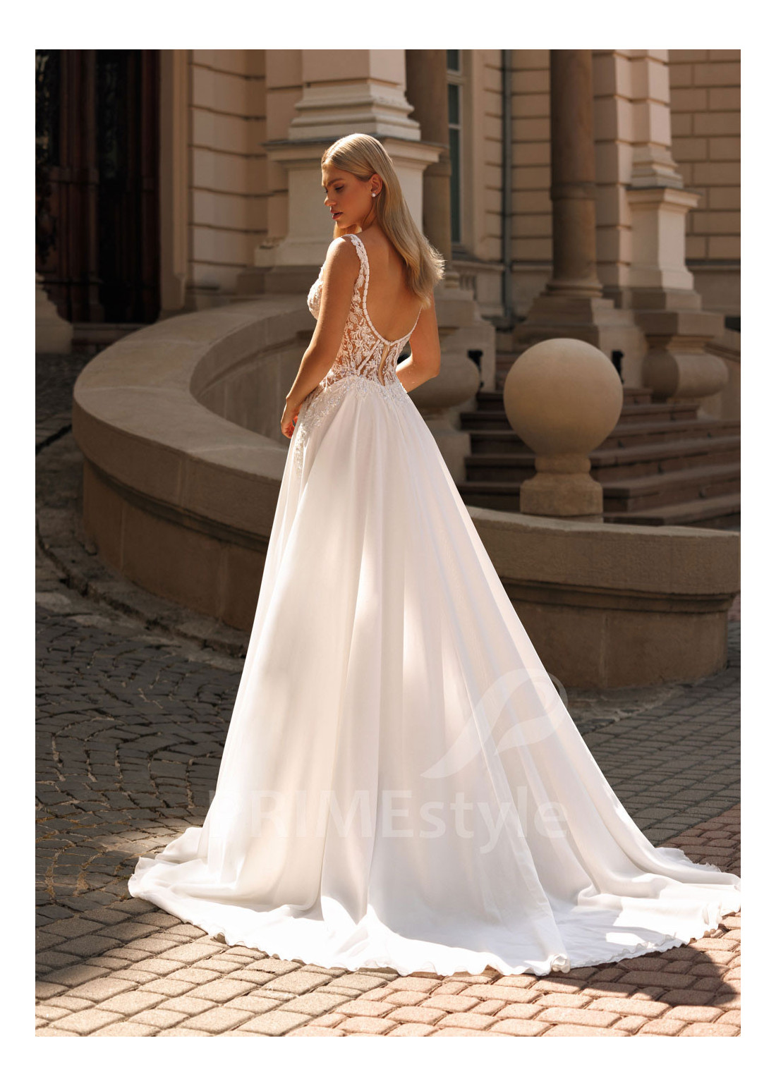 Originálne čipkované svadobné šaty s otvoreným dekoltom, výstrihom do V-čka, odhaleným chrbtom a efektne tvarovanou padavou šifónovou sukňou. Korzet a horná časť sukne sú zdobené rozkošnou vyšívanou čipkou.