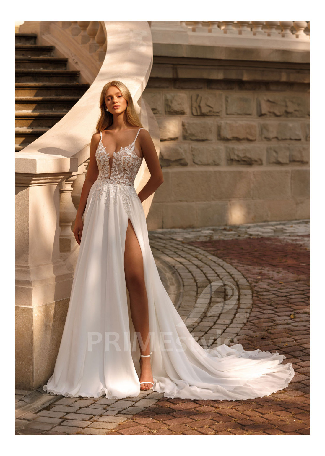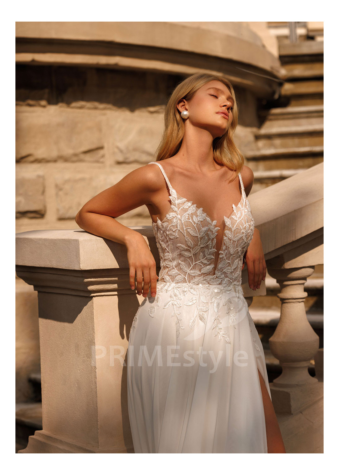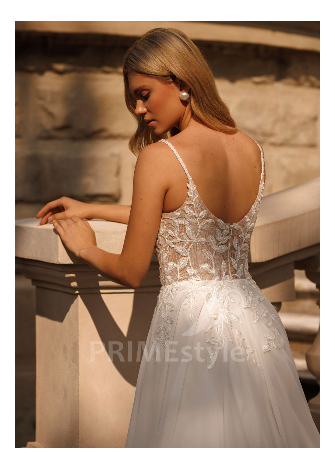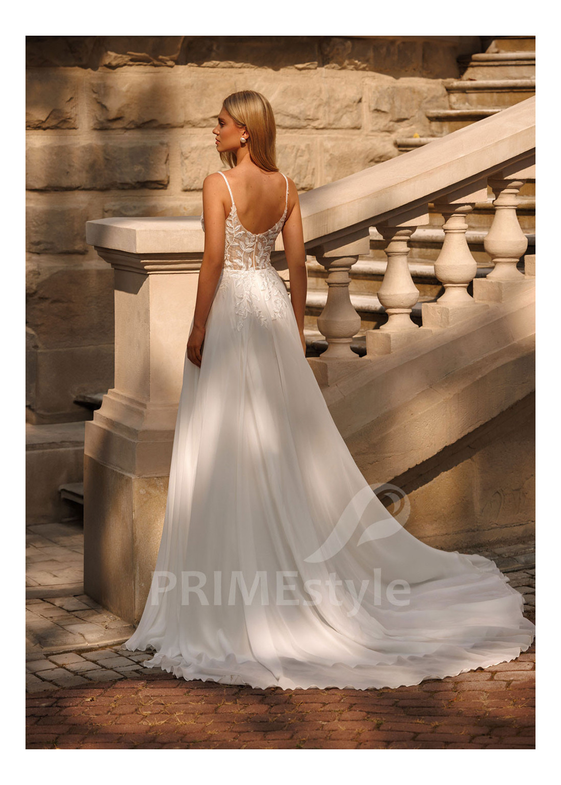 Jednoduché minimalistické svadobné šaty na tenké ramienka s otvoreným dekoltom, hlbokým V-výstrihom na hrudi, odhaleným chrbtom a ľahkou padavou tylovou sukňou s rozparkom. Korzet a horná časť sukne sú zdobené rozkošnou vyšívanou čipkou.