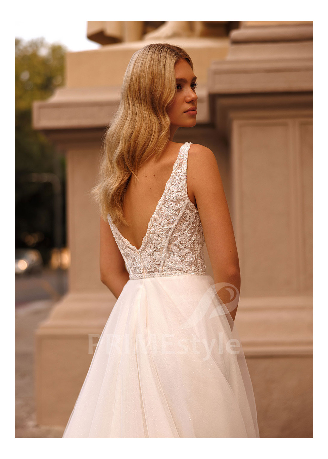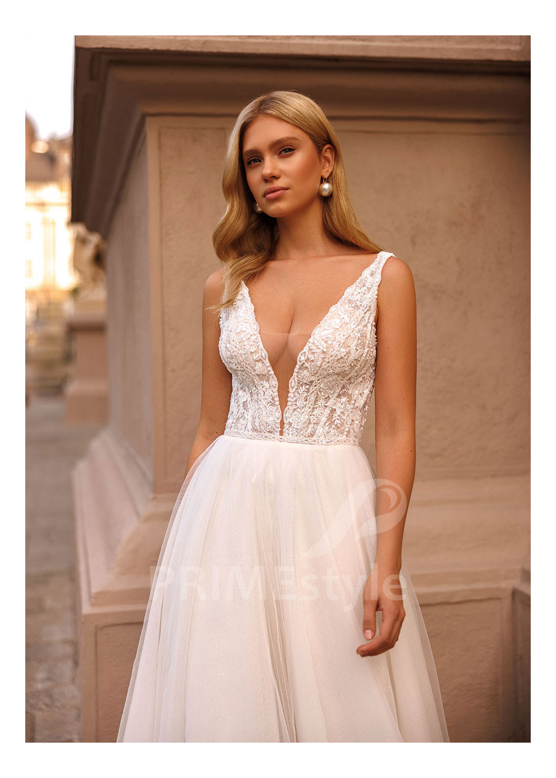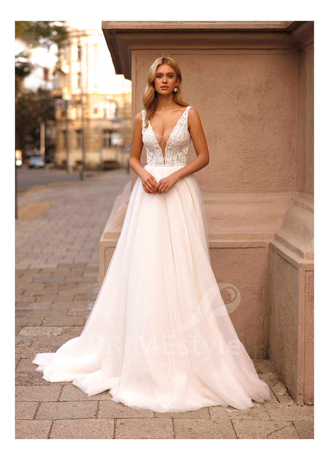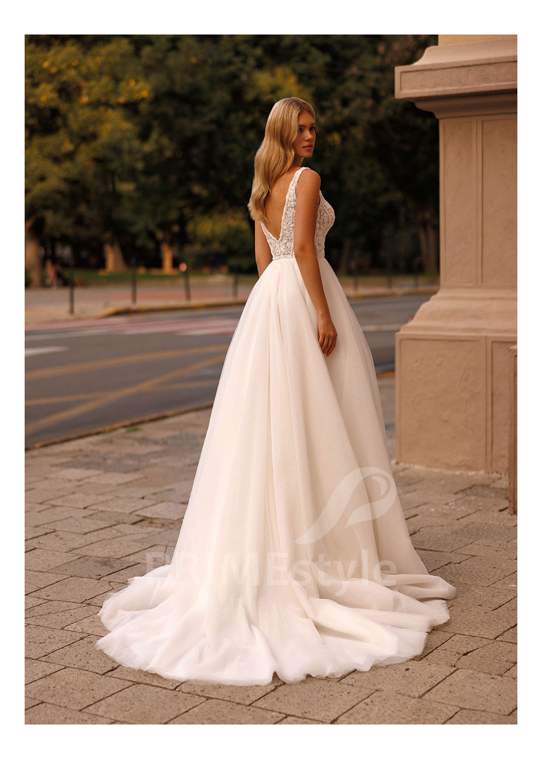 Nežné tylové svadobné šaty s otvoreným dekoltom, hlbokým V-výstrihom na hrudi, odhaleným chrbtom a ľahkou tylovou sukňou. Korzet je zdobený rozkošnou vyšívanou čipkou.