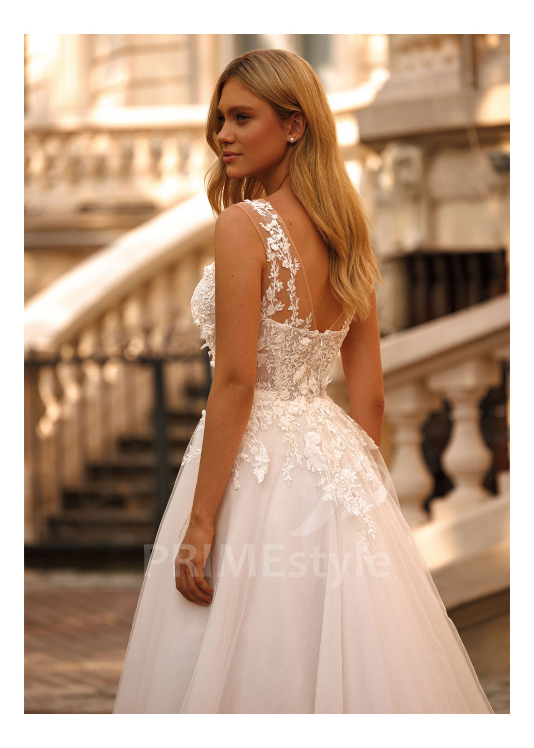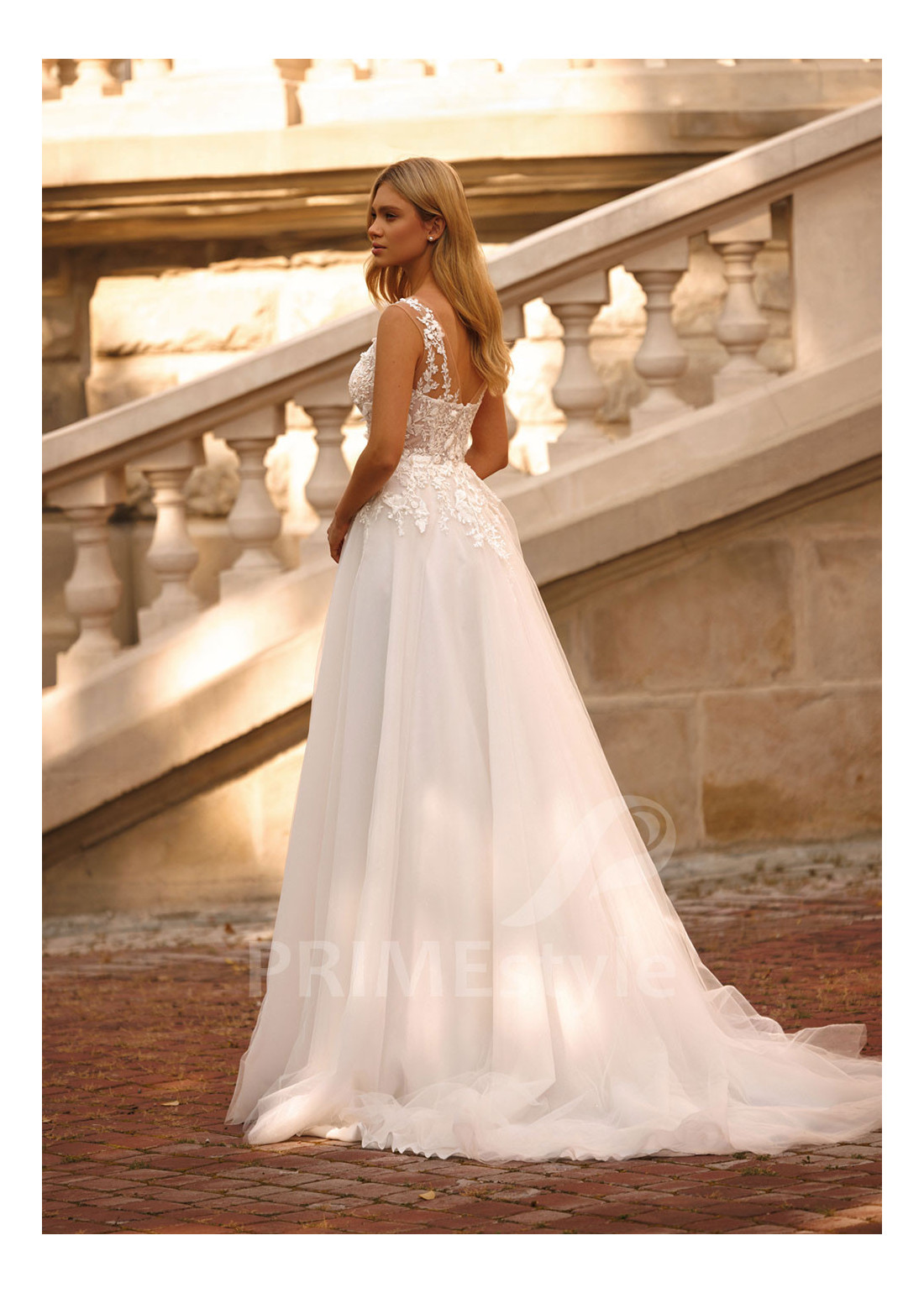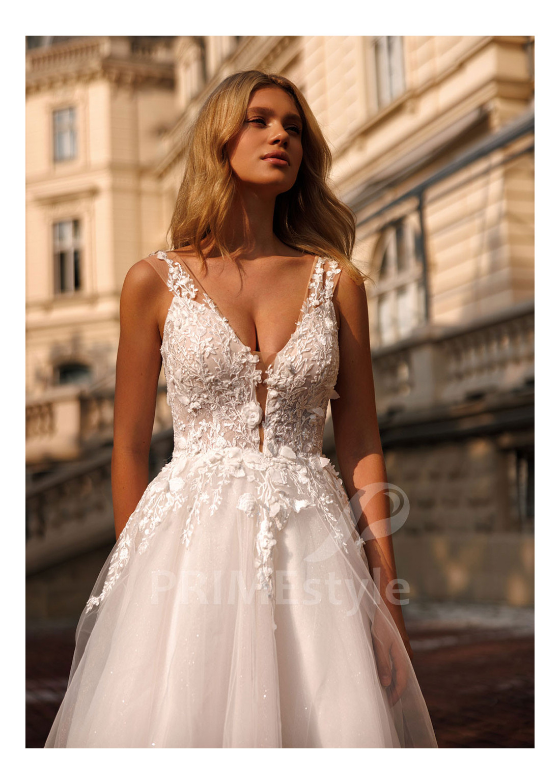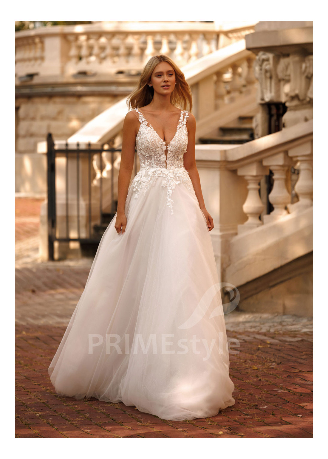 Honosné svadobné šaty na širšie ramienka s otvoreným dekoltom, hlbokým výstrihom do V-čka, odhaleným chrbtom a objemnou padavou tylovou sukňou. Korzet a horná časť sukne sú zdobené rozkošnou vyšívanou čipkou s 3D kvetmi.