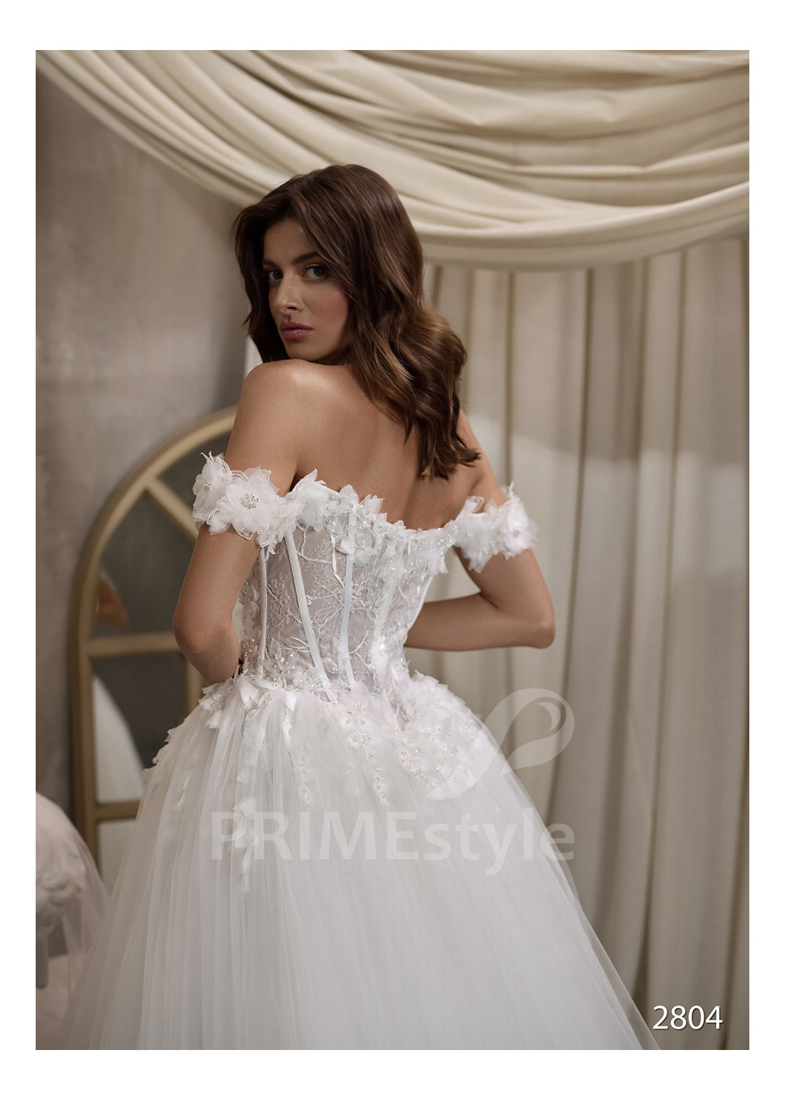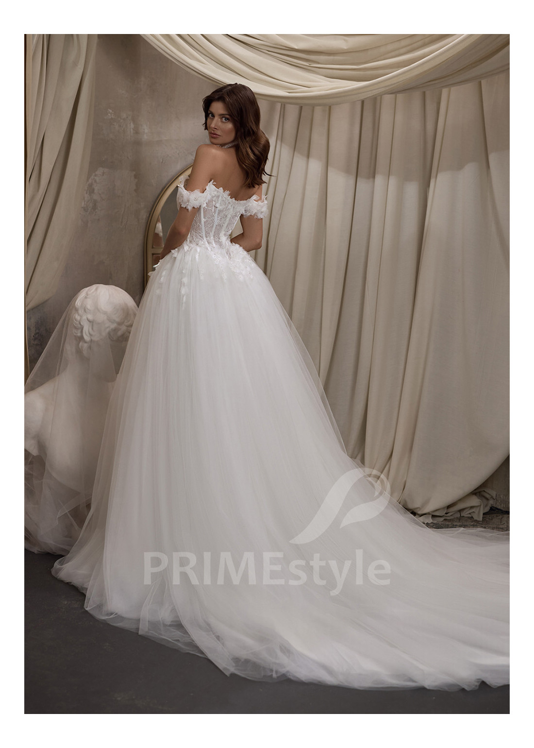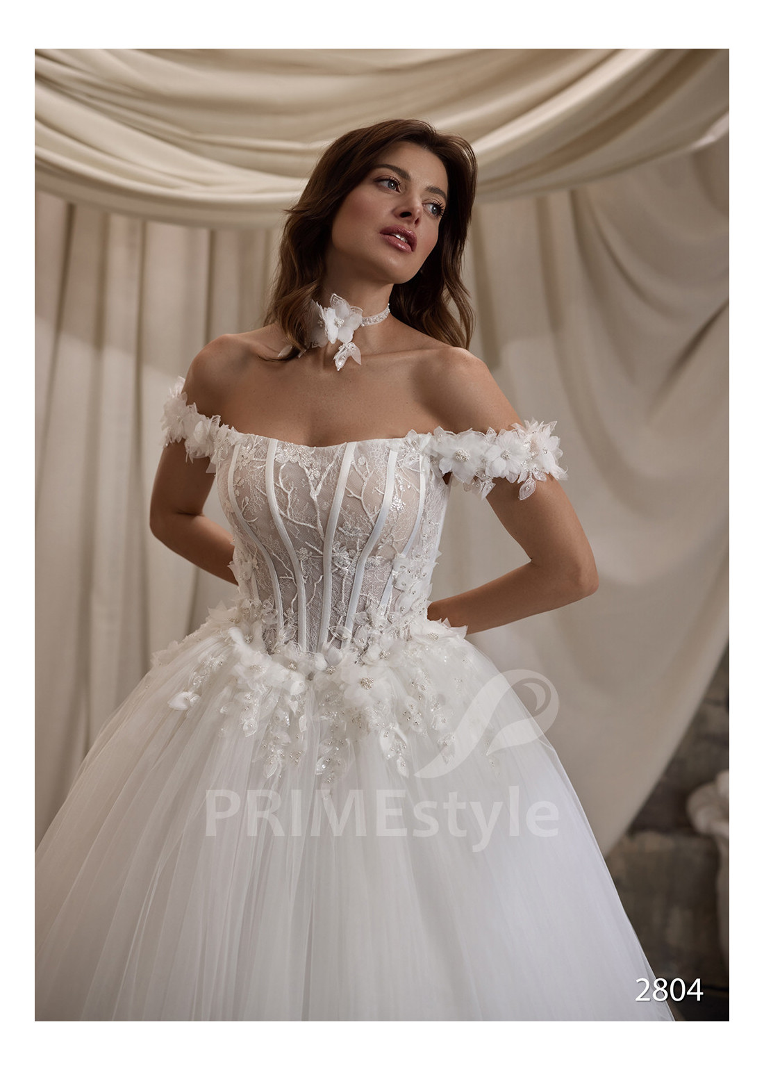 Honosné svadobné šaty s padnutými ramienkami s otvoreným dekoltom, trendovým rovným výstrihom na hrudi, odhaleným chrbtom a rozkošnou objemnou tylovou sukňou. Korzet, ramienka a horná časť sukne sú zdobené rozkošnou vyšívanou čipkou s 3D kvetmi.