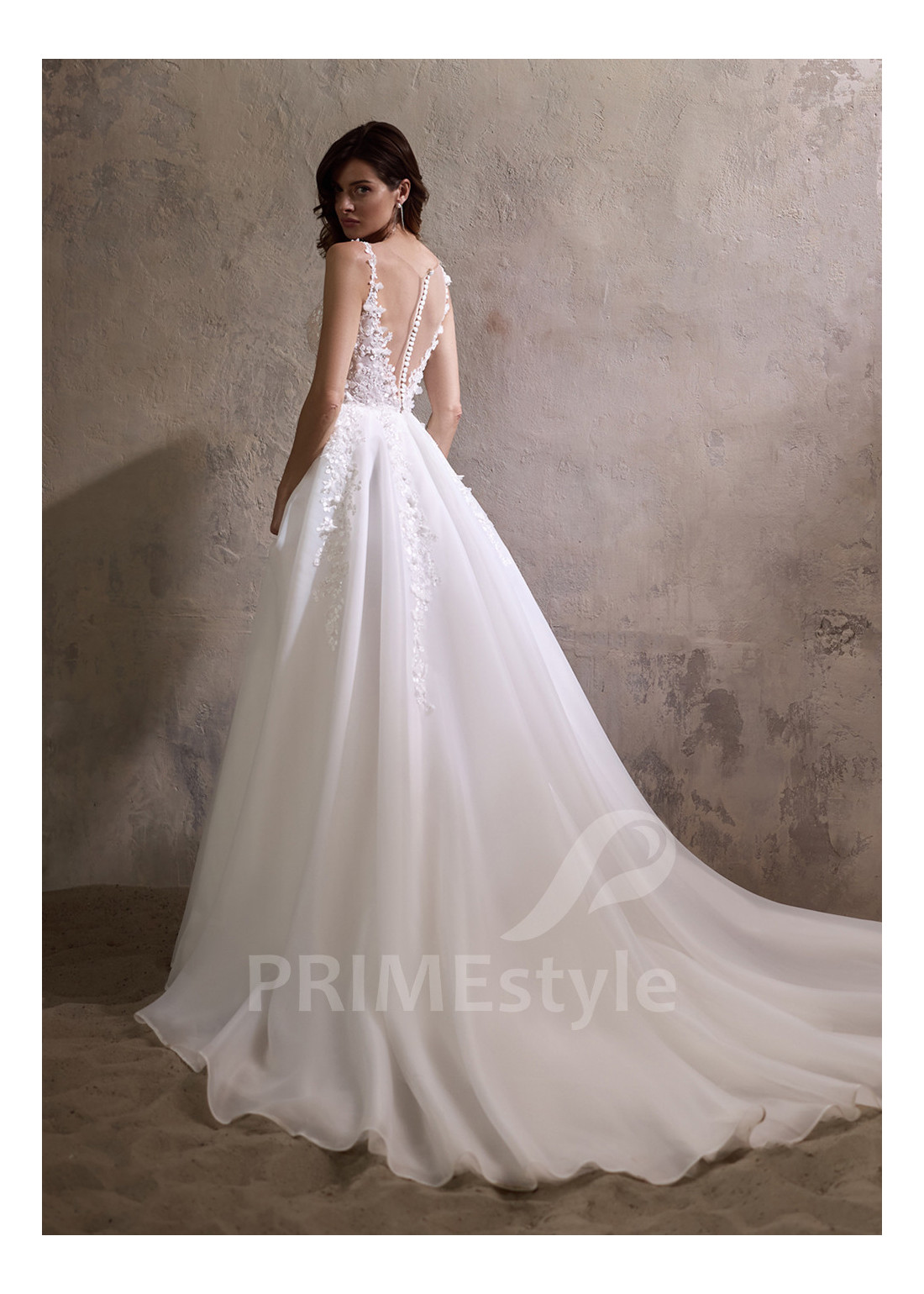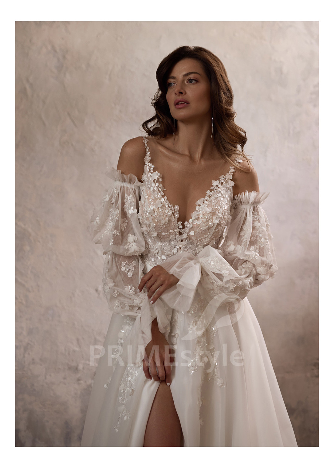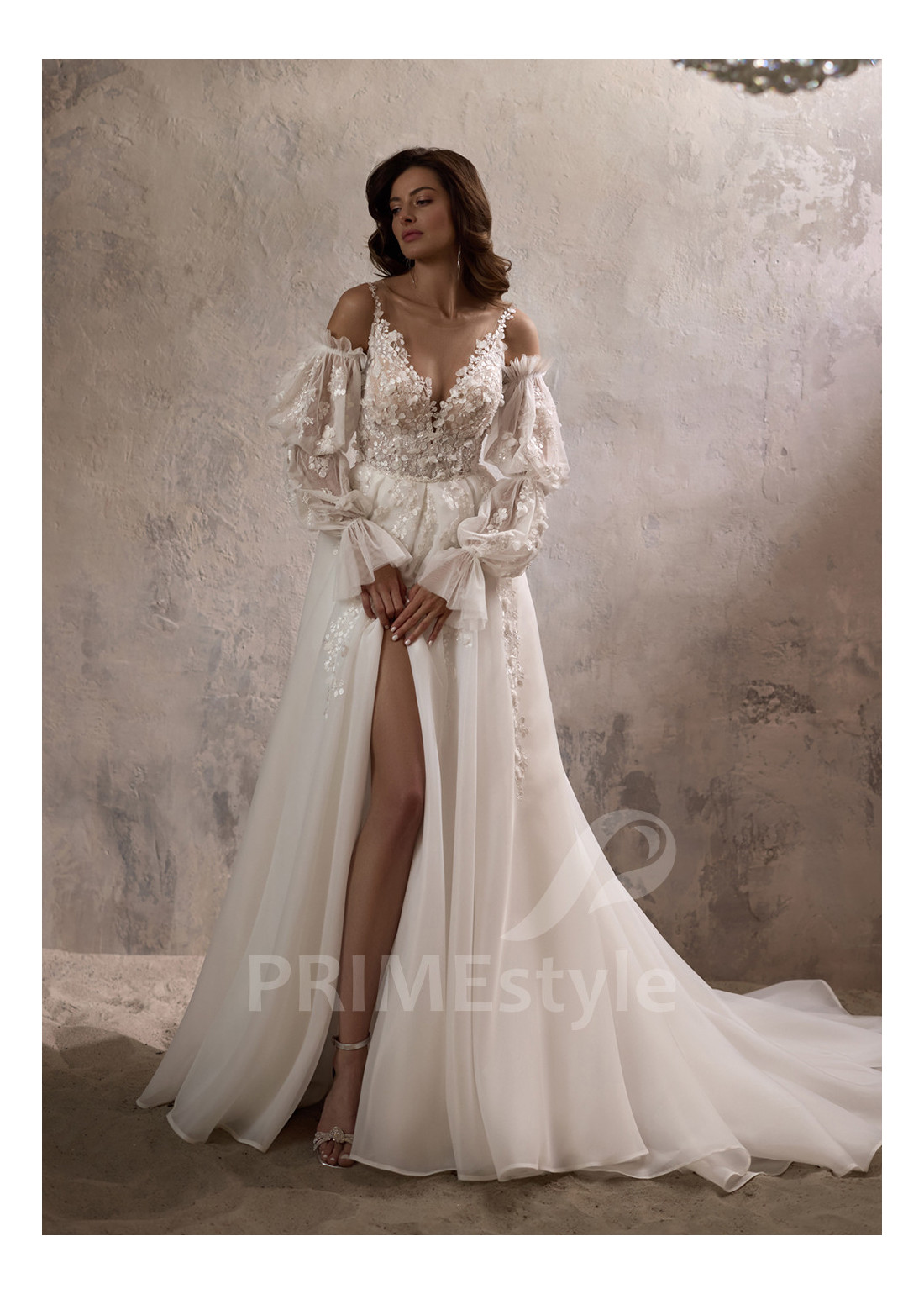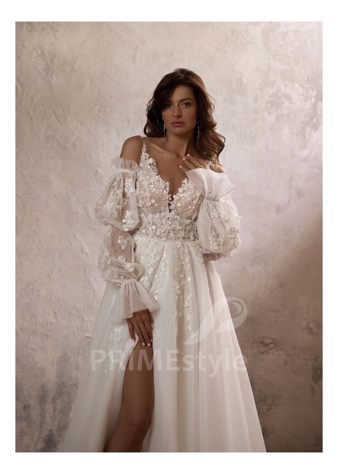 Extravagantne svadobné šaty so samostatnými balónovými rukávmi, otvoreným dekoltom, výstrihom do V-čka, priesvitmým chrbtom a objemnou pekne tvarovanou tylovou sukňou. Korzet, rukávy a horná časť sukne sú zdobené rozkošnou vyšívanou čipkou s 3D kvetmi.