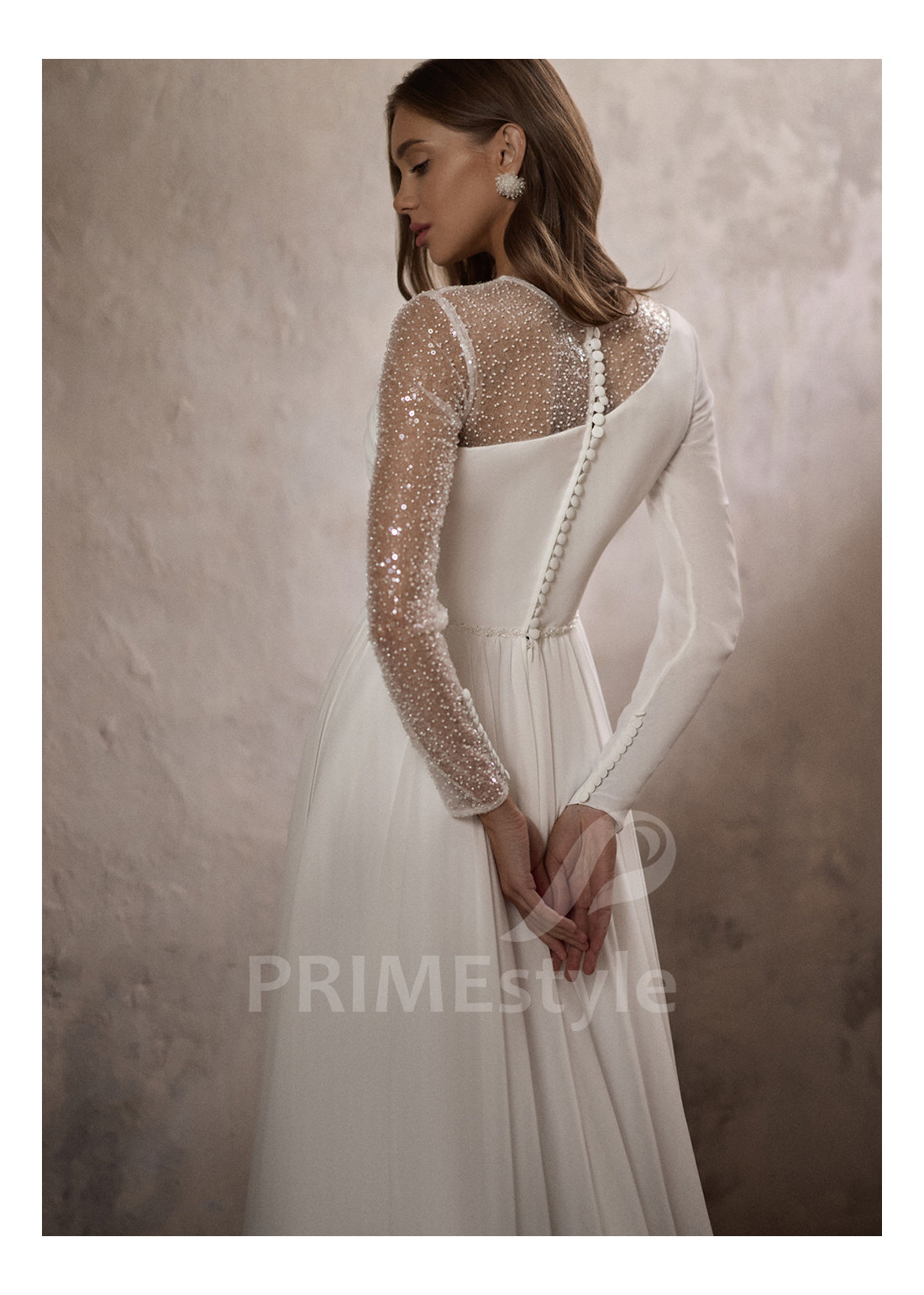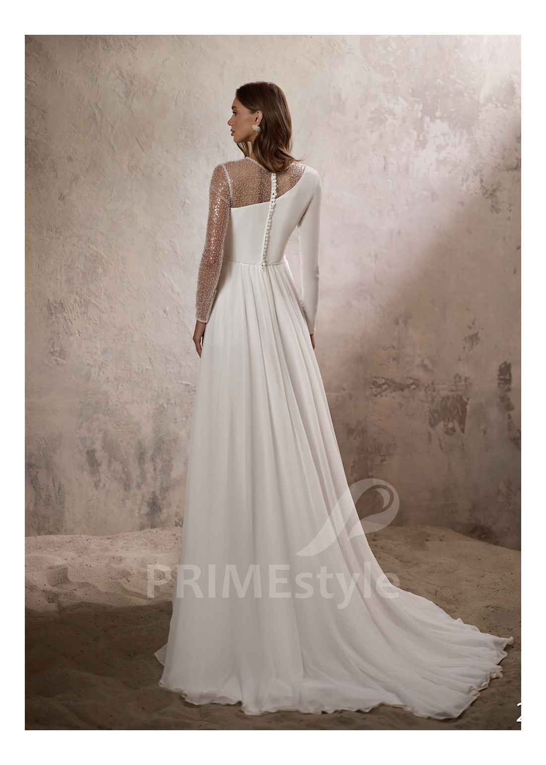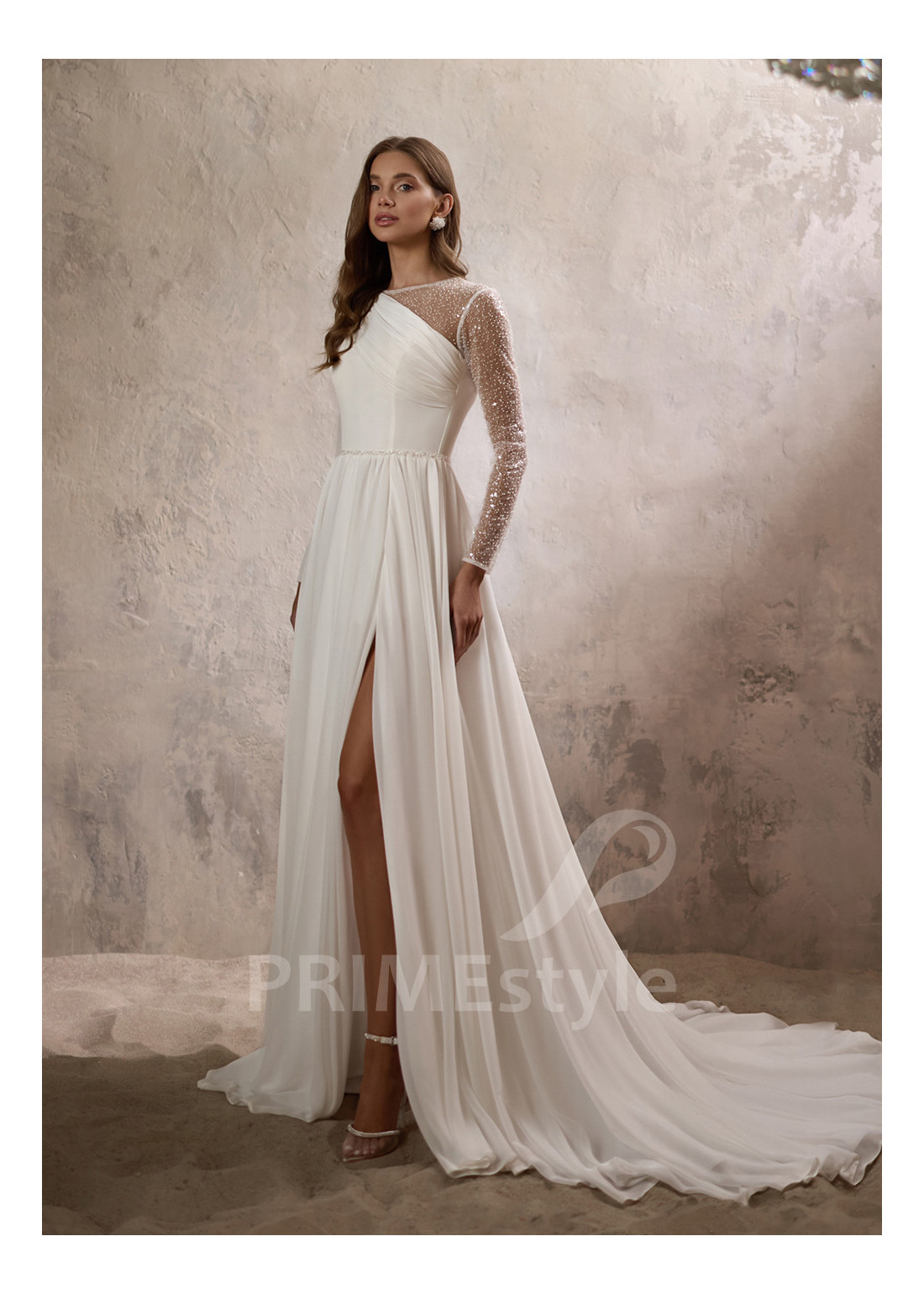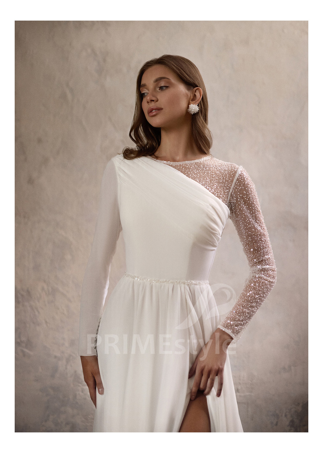 Elegantné asymetrické svadobné šaty s dlhým rukávom, prekrytým dekoltom, okrúhlym výstrihom a padavou pekne tvarovanou A-čkovou sukňou s rozparkom. Vhodné ako svadobné šaty pre staršie nevesty.