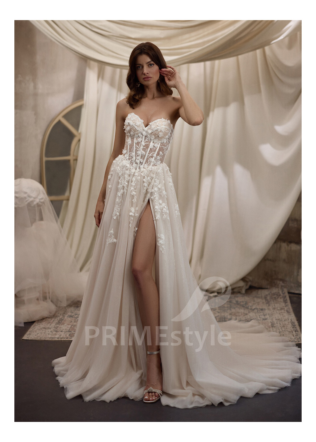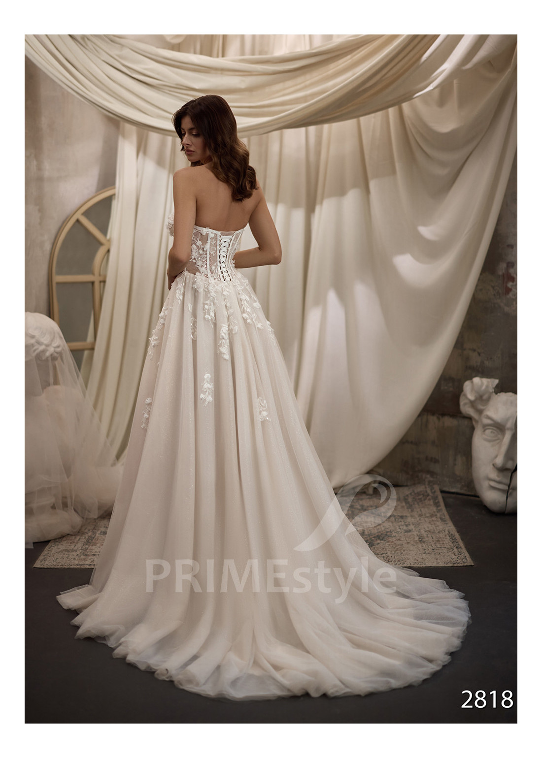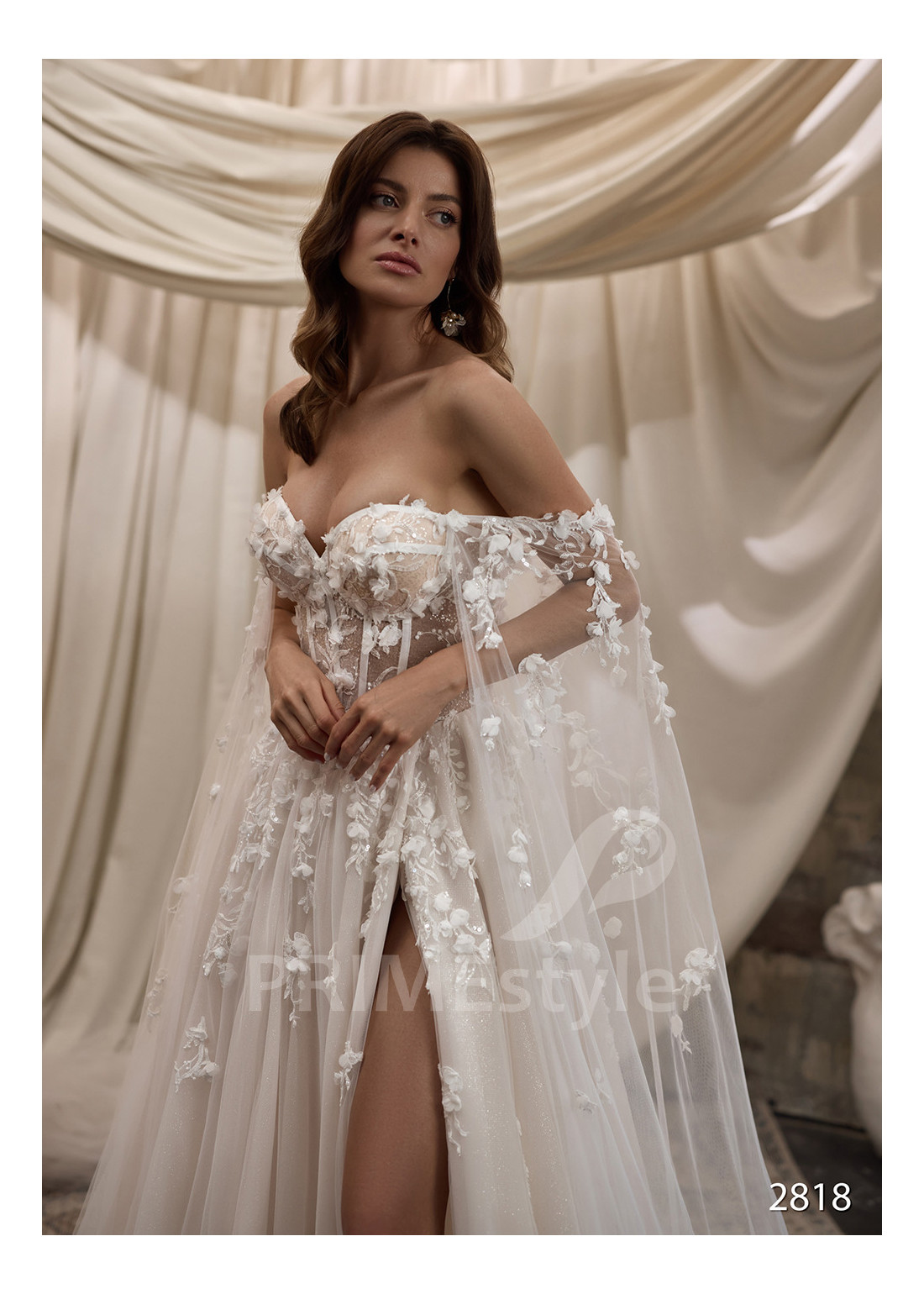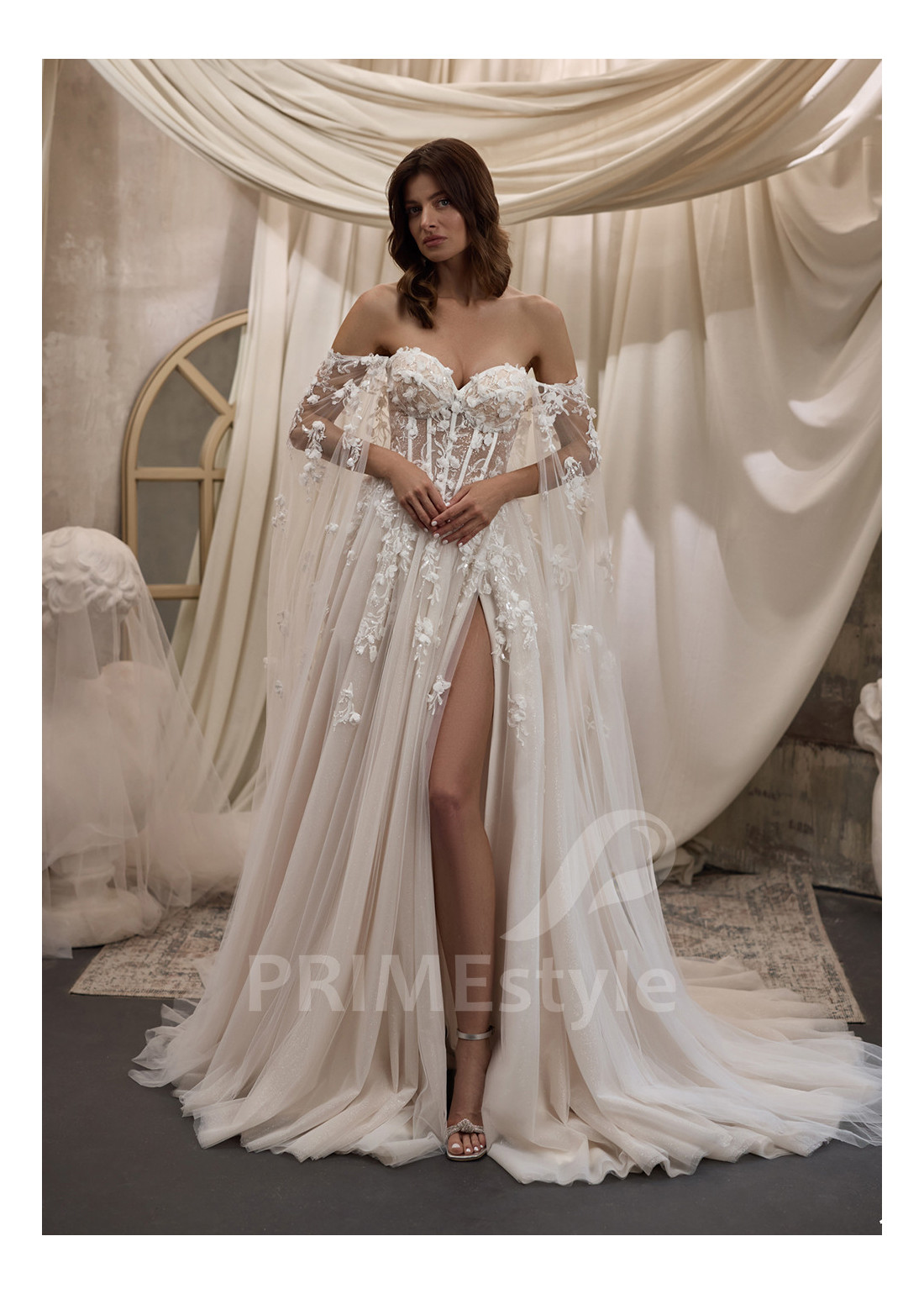 Luxusné tylové svadobné šaty s otvoreným dekoltom, trendovým srdiečkovým výstrihom na hrudi, odhaleným chrbtom a objemnou pekne tvarovanou tylovou sukňou s vrstvou trblietavého tylu. Súčasťou šiat sú aj odopinateľné tylové prehozové rukávy. Korzet, rukávy a horná časť sukne sú zdobené rozkošnou vyšívanou čipkou s 3D kvetmi.