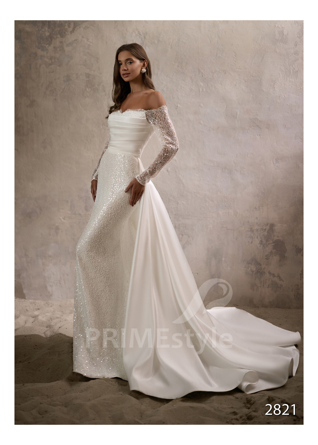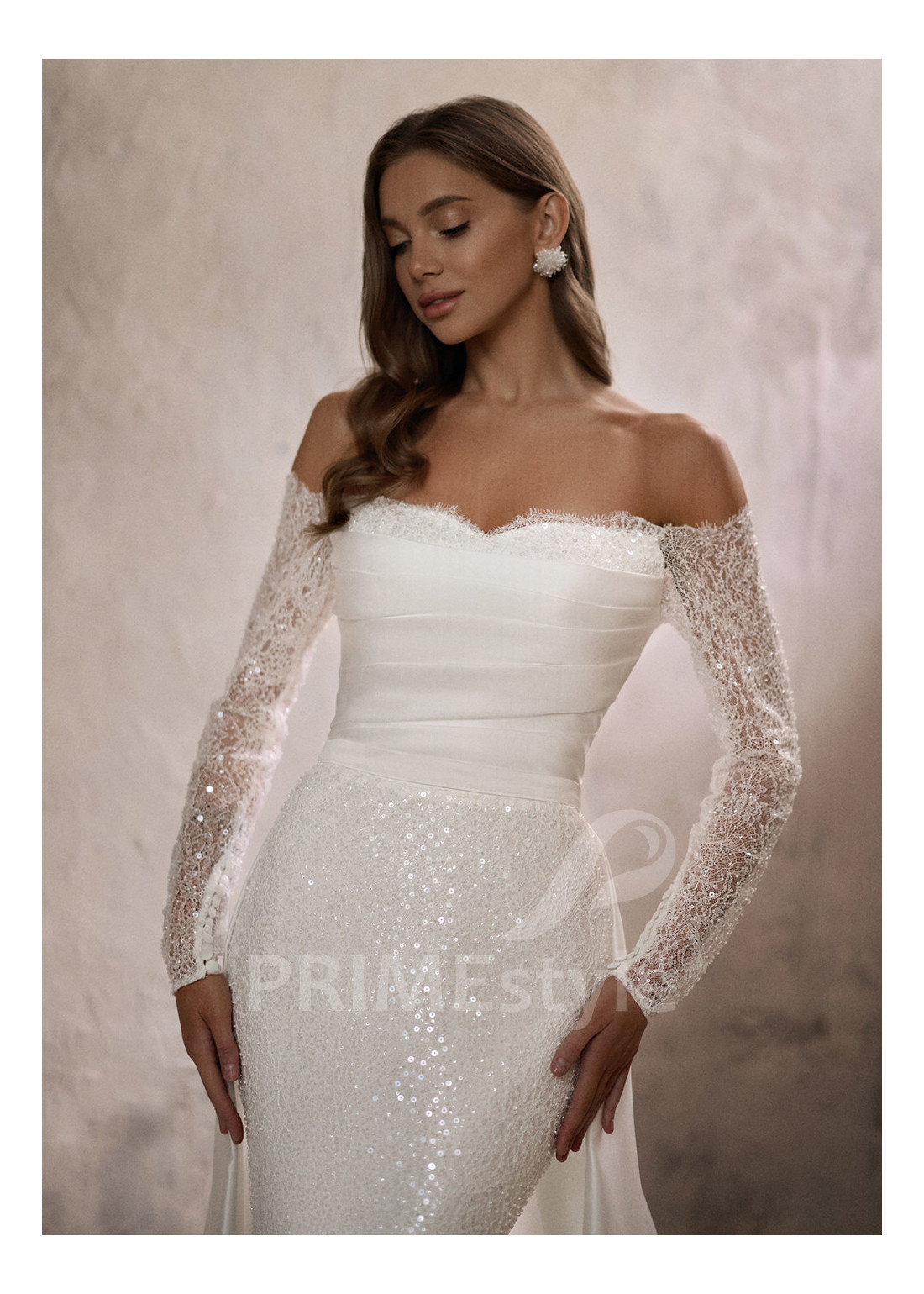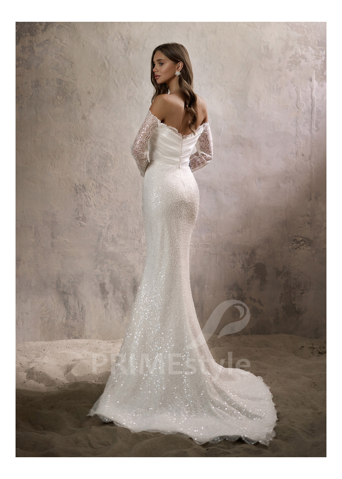 Graciózne úzke svadobné šaty s otvoreným dekoltom, výstrihom do jemného V-čka, odhalenými ramenami a chrbtom, dlhými čipkovanými rukávmi a efektnou trblietavou sukňou strihu "morská panna". Súčasťou šiat je aj elegantná odopínateľná saténová vlečka.
