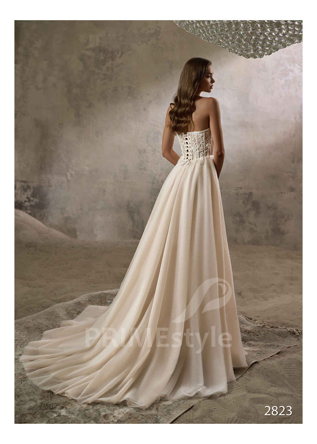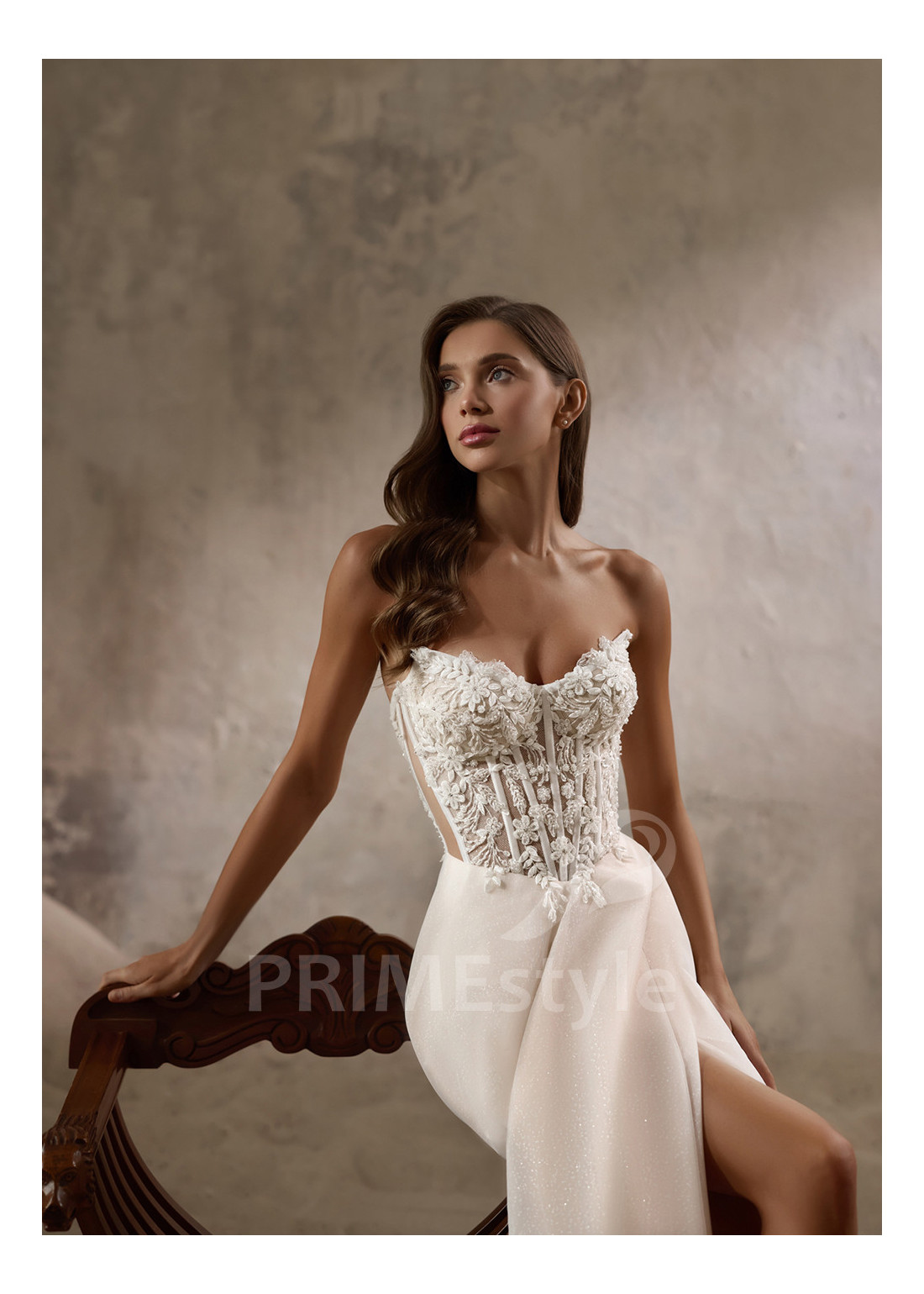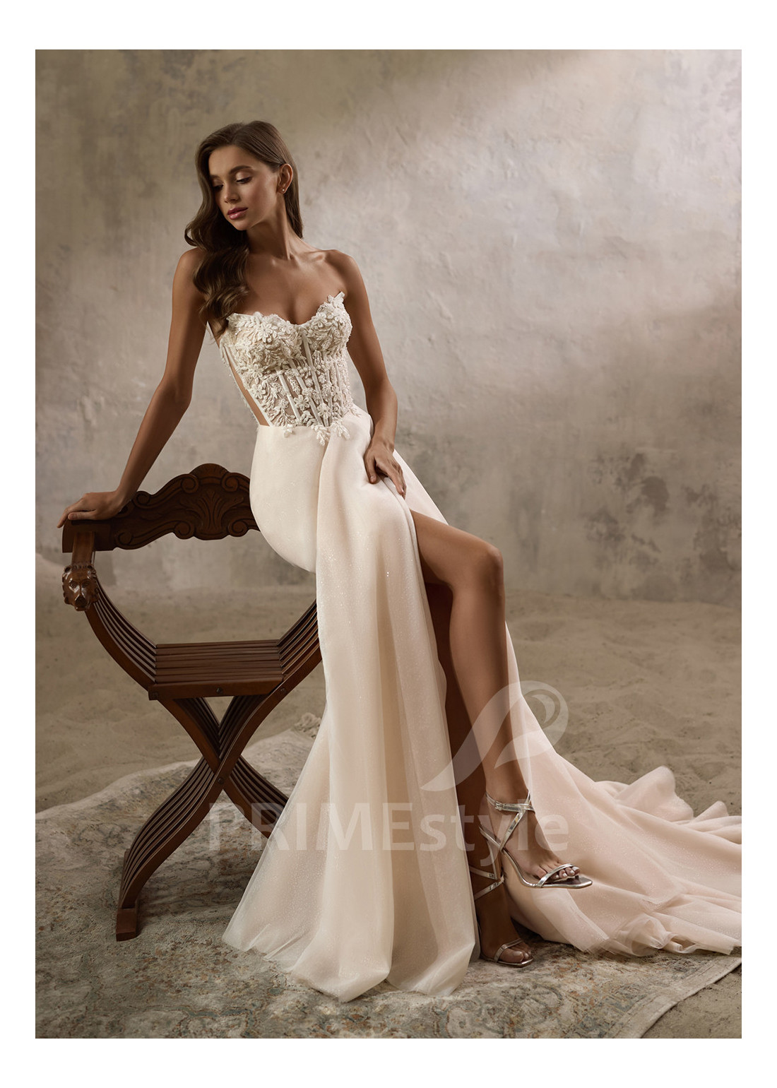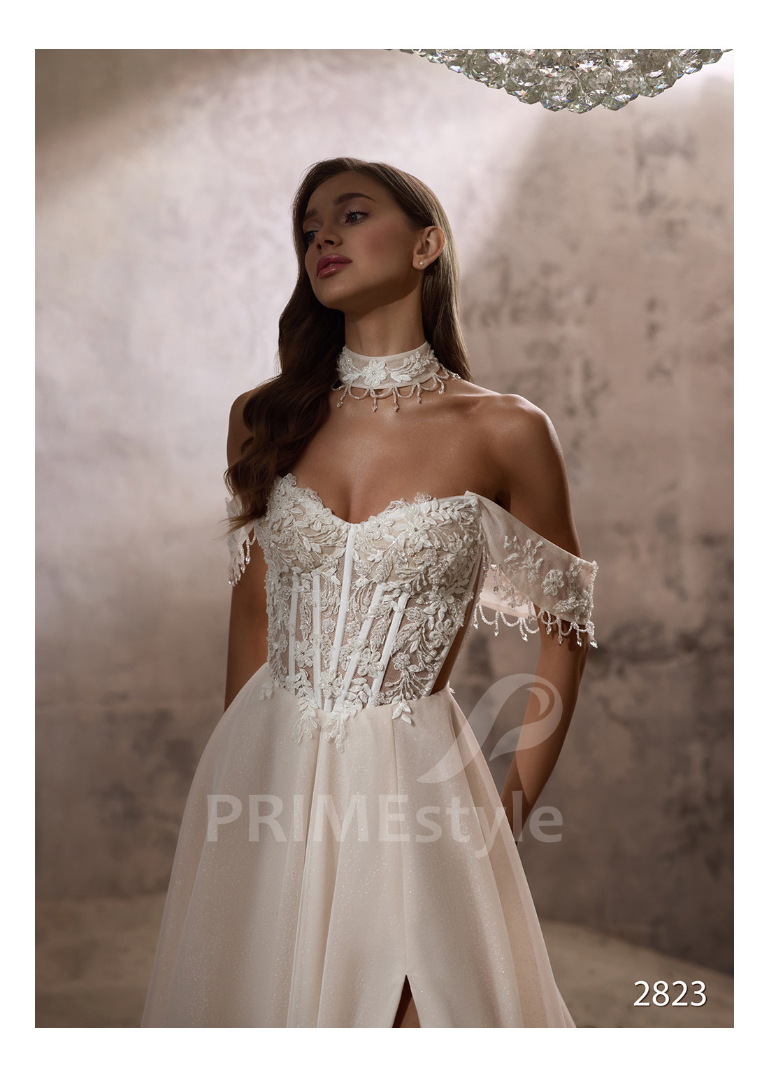 Trendové svadobné šaty s padnutými ramienkami s otvoreným dekoltom, výstrihom do V-čka, odhaleným chrbtom a ľahkou padavou tylovou sukňou s rozparkom. Korzet a ramienka sú zdobené rozkošnou vyšívanou čipkou.