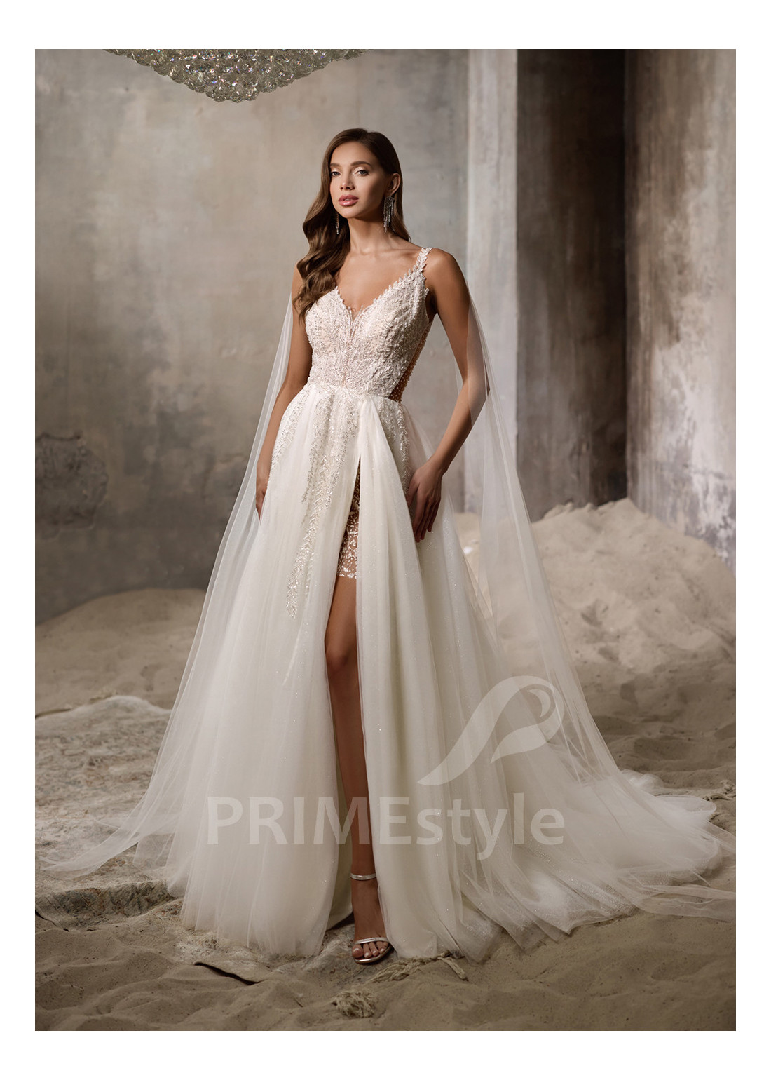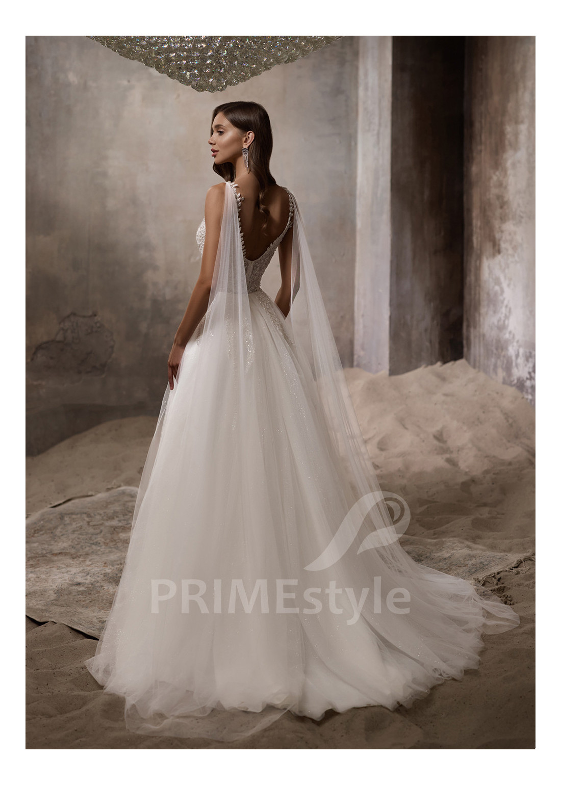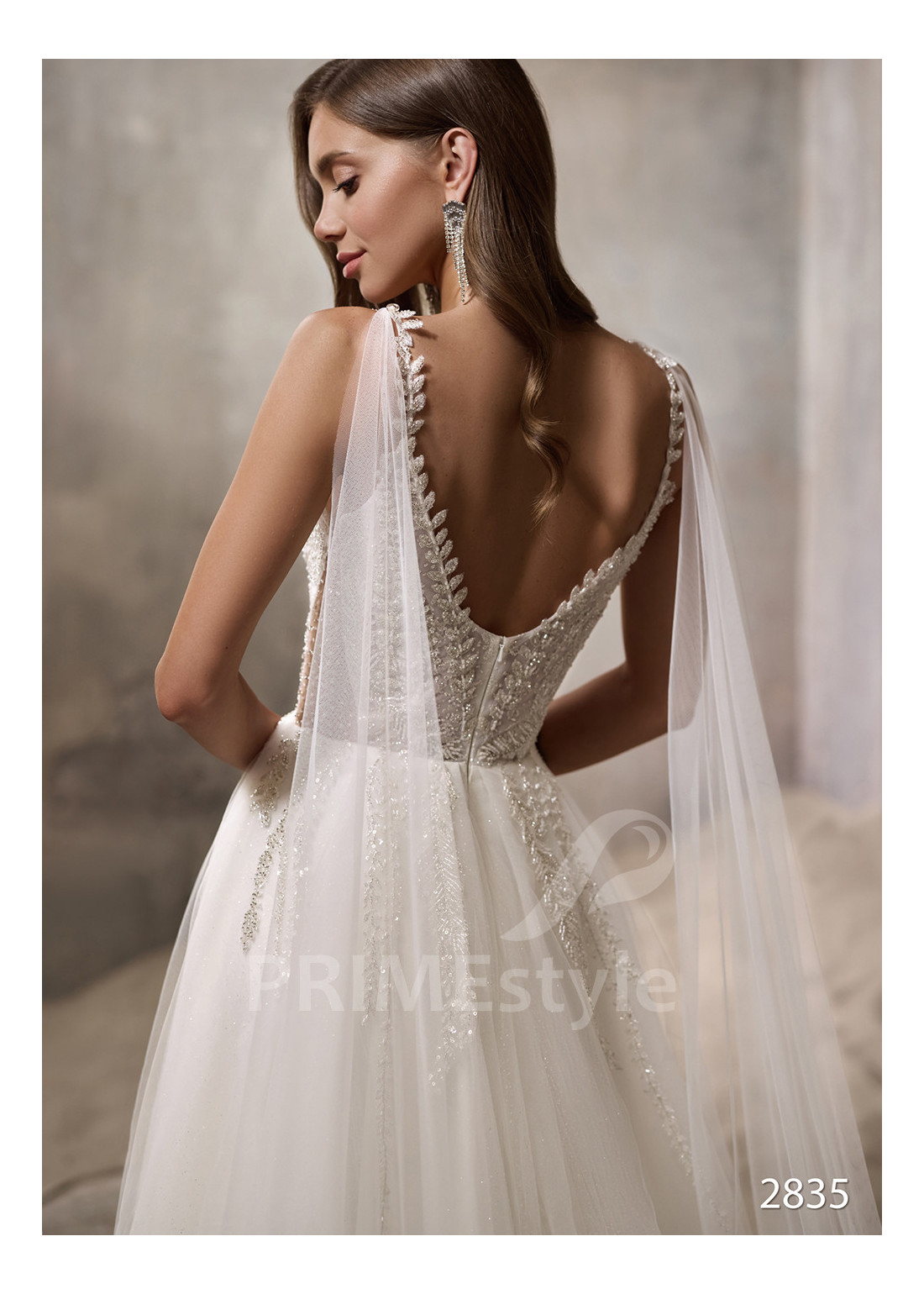 Roztomilé čipkované svadobné šaty na ramienka s otvoreným dekoltom, výstrihom v tvare V, odhaleným chrbtom a objemnou pekne tvarovanou tylovou sukňou s vrstvou trblietavého tylu. Korzet a horná časť sukne sú zdobené rozkošnou vyšívanou čipkou.