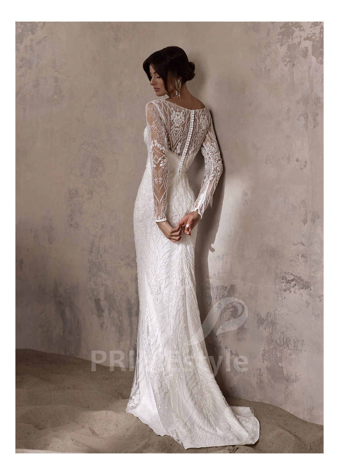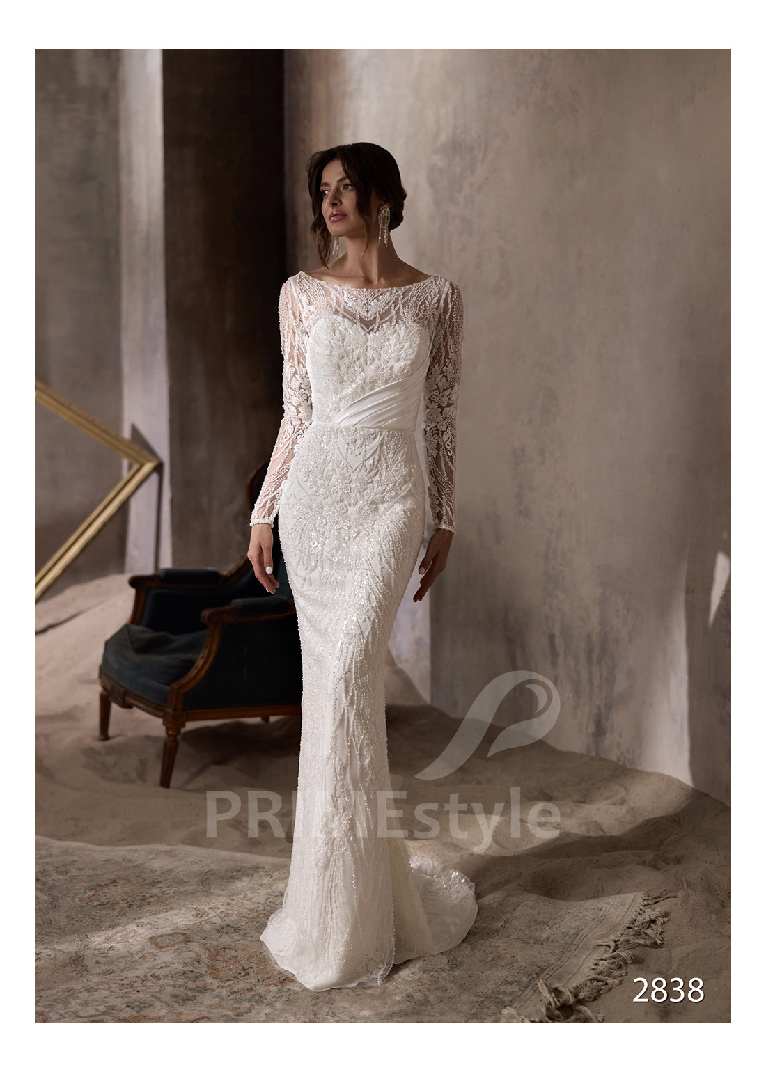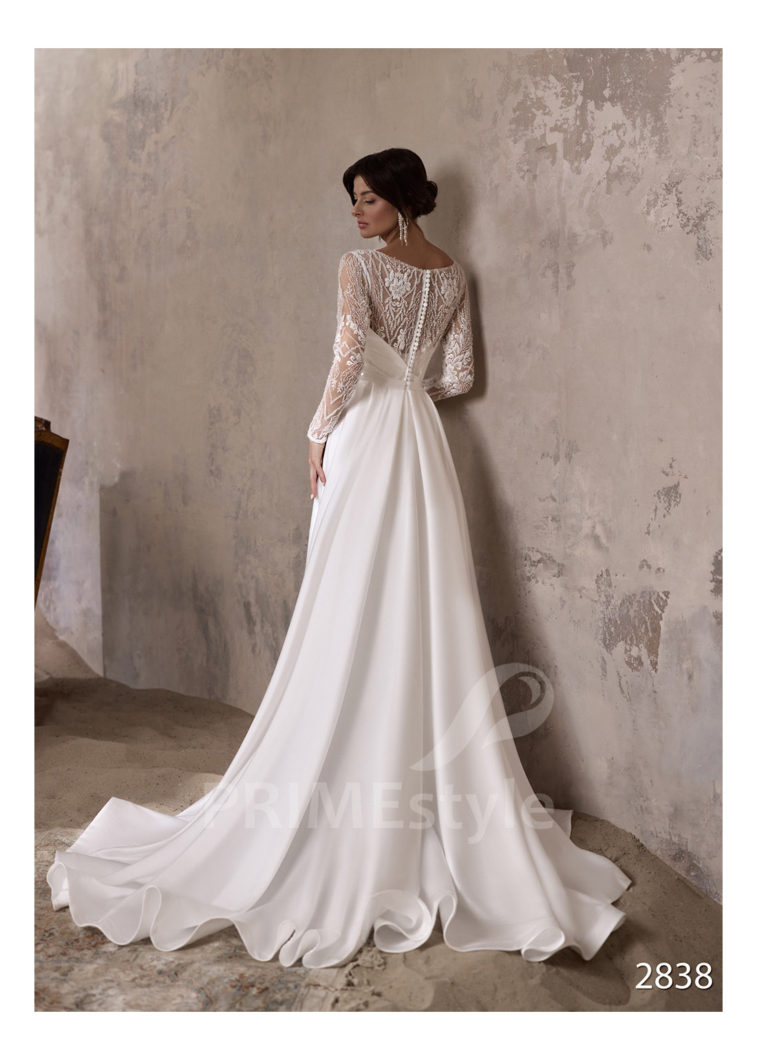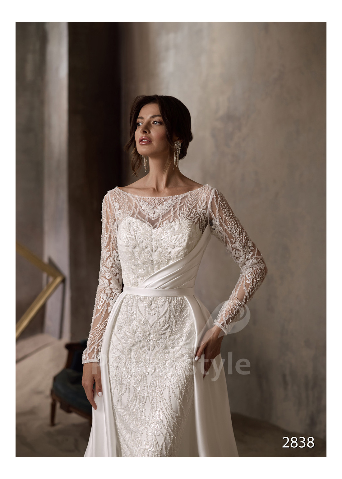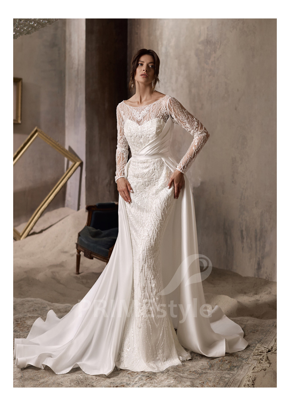 Orignálne celočipkované svadobné šaty s dlhými čipkovanými rukávmi s prekrytým dekoltom, lodičkovým výstrihom na hrudi, prekrytým chrbtom a efektnou úzkou krásne tvarovanou sukňou strihu "morská panna". Súčasťou šiat je aj bohatá odopínateľná saténová vlečka.