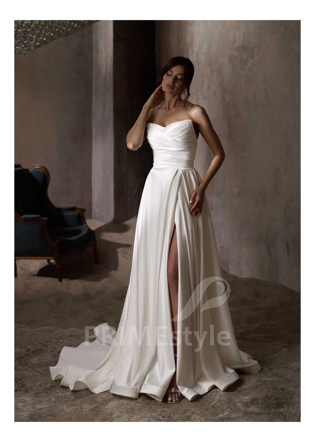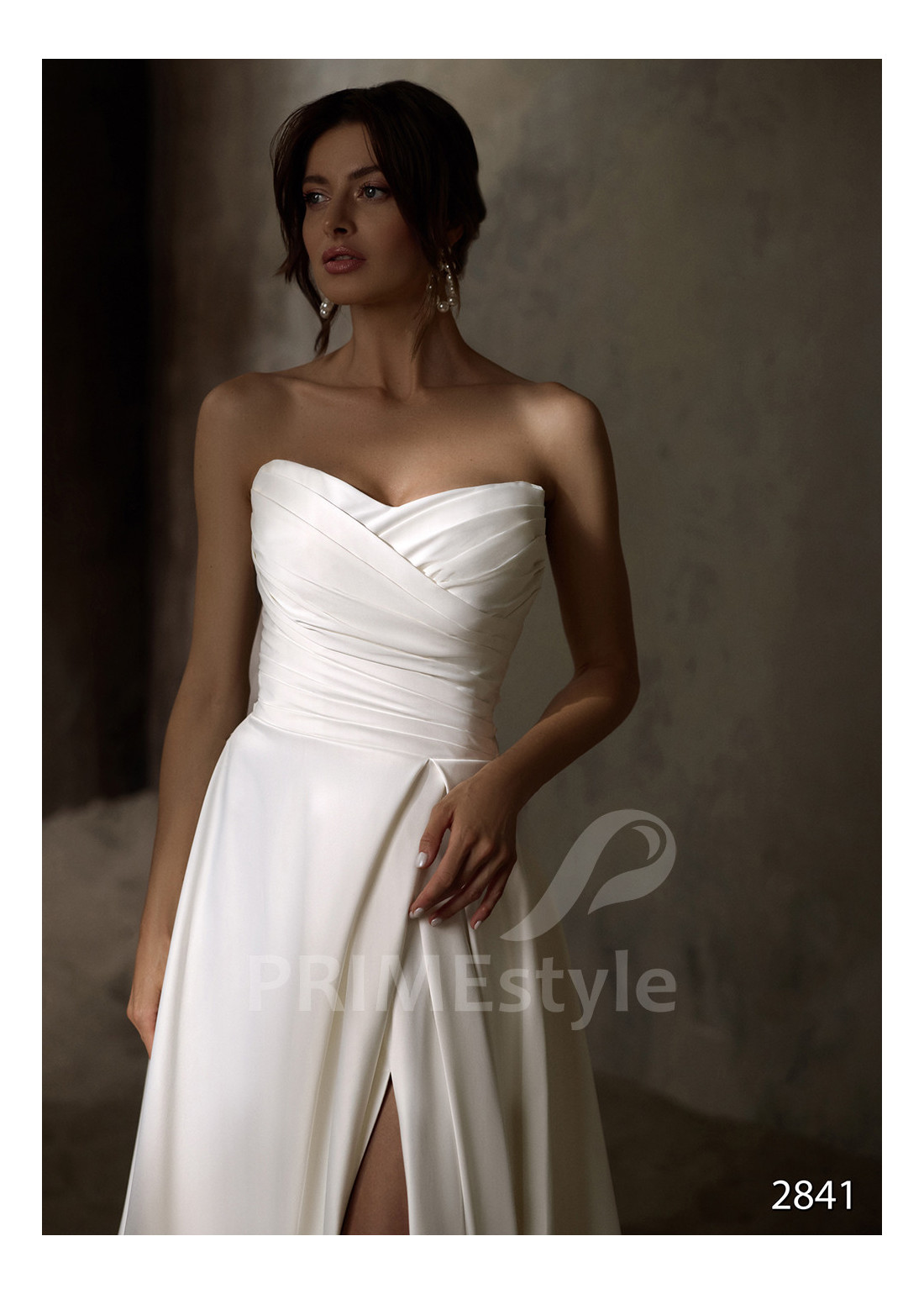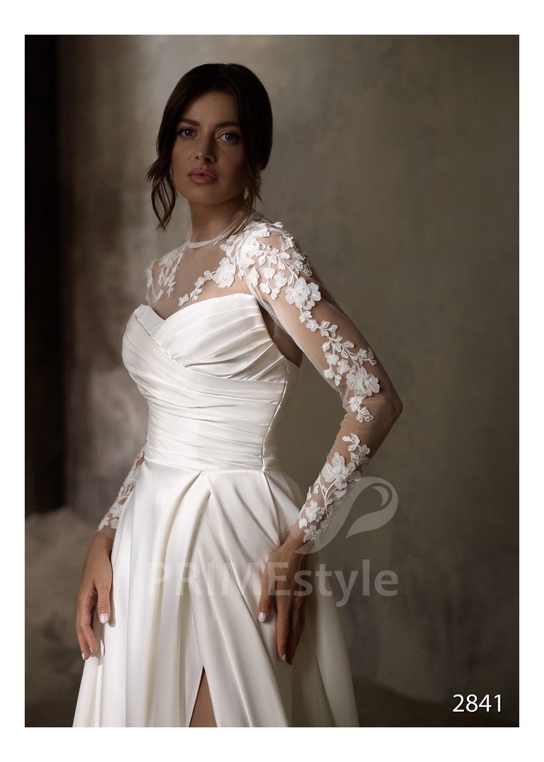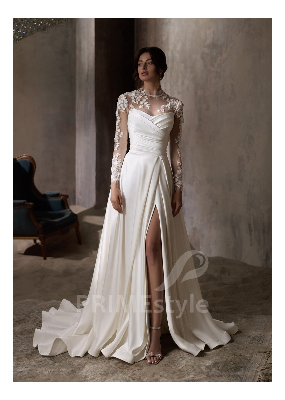 Decentné dvojdielne svadobné šaty s otvoreným dekoltom, výstrihom do jemného V-čka, odhalenými ramenami a chrbtom a padavou pekne tvarovanou A-čkovou sukňou s rozparkom. Súčasťou šiat je aj bohato zdobené bolerko s dlhým rukávom.