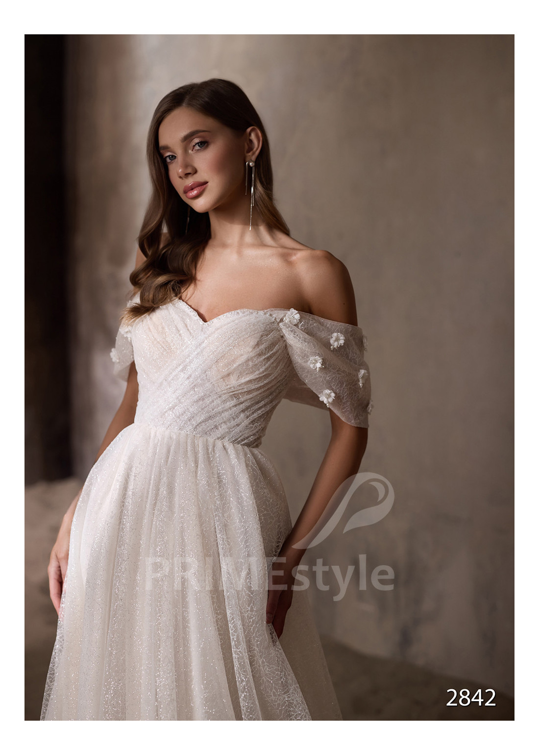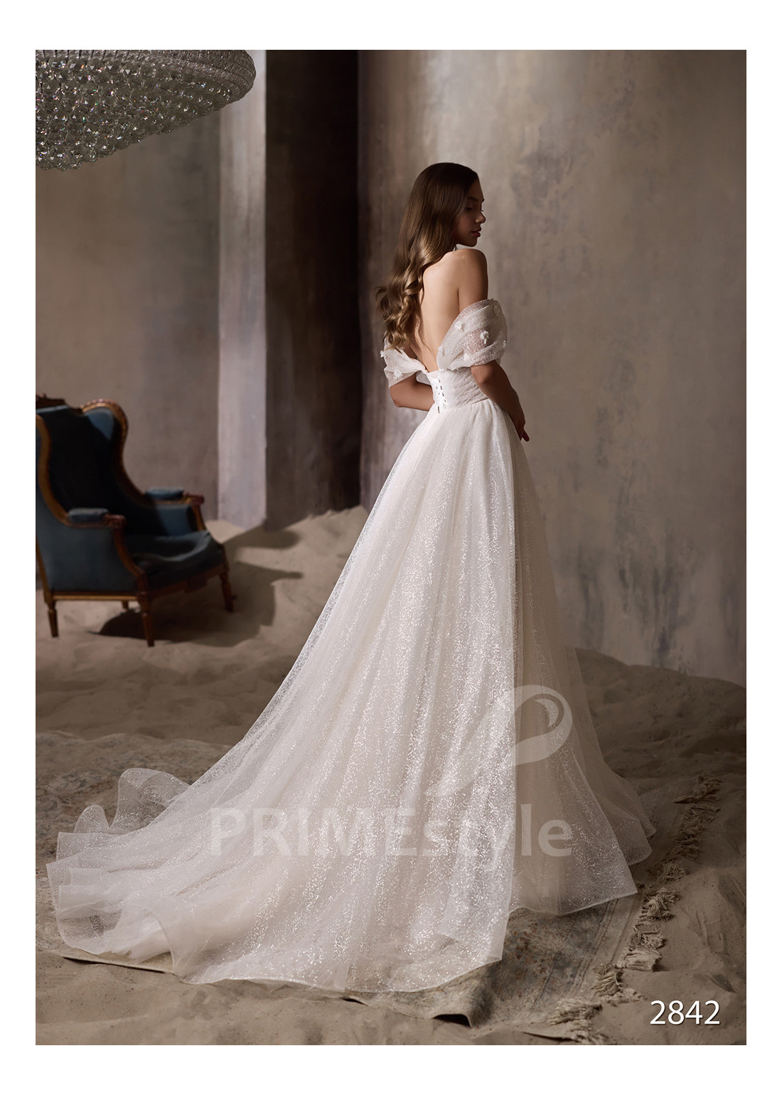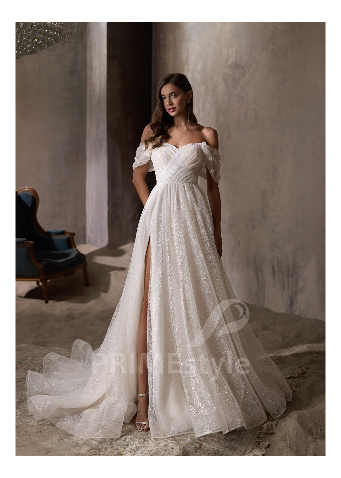 Roztomilé tylové svadobné šaty s padnutými ramienkami s otvoreným dekoltom, výstrihom do jemného V-čka, odhalenými ramenami a chrbtom a objemnou pekne tvarovanou tylovou sukňou s rozparkom a s vrstvou trblietavého tylu.