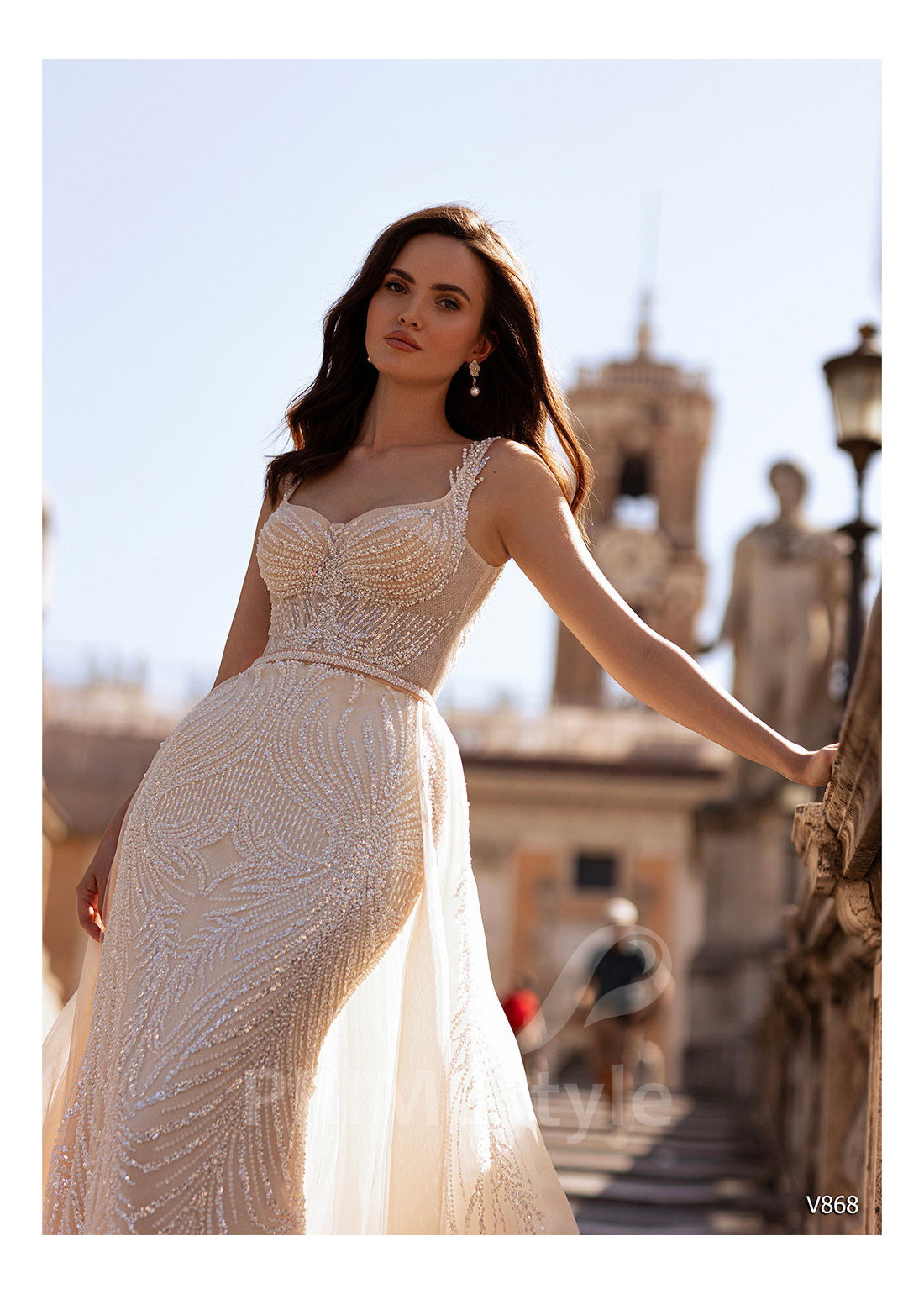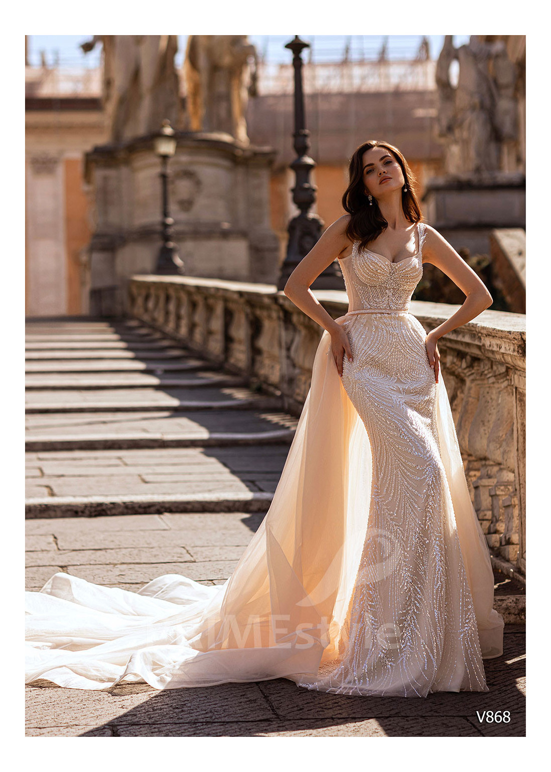 Tento model si môžete objednať v rôznych konfekčných veľkostiach buď s vlečkou alebo bez. Ak máte atypickú postavu, pri výbere veľkosti odporúčame zvoliť opciu "Šitie na mieru" (za šitie svadobných šiat na mieru účtujeme príplatok 50 Eur).
