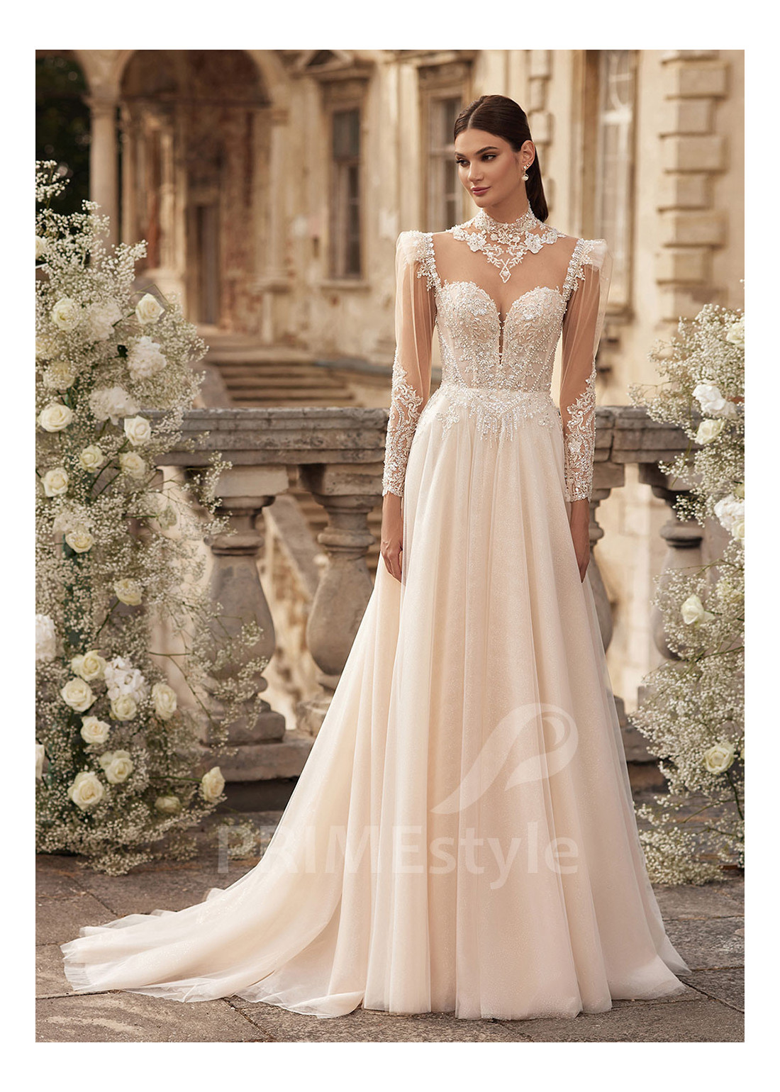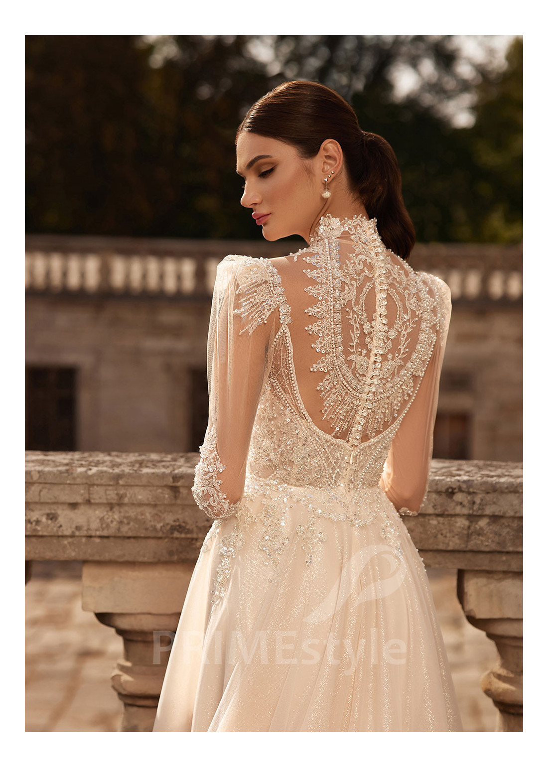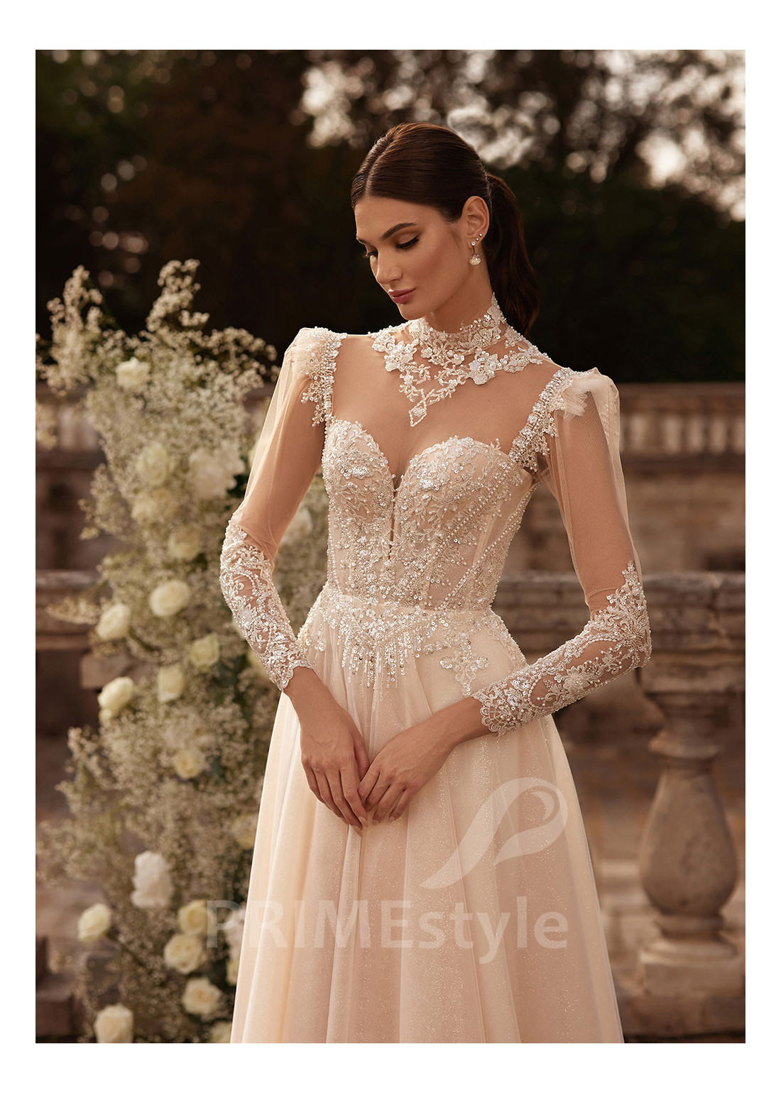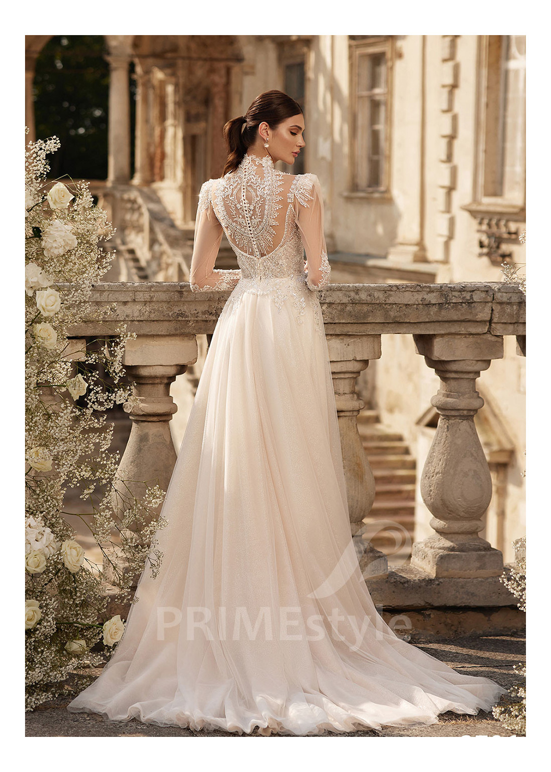 Luxusné padavé svadobné šaty s dlhým rukávom s prekrytým dekoltom až pod krk, trendovým V-výstrihom na hrudi, prekrytým chrbtom a objemnou padavou tylovou sukňou s vrstvou trblietavého tylu. Korzet, rukávy a horná časť sukne sú zdobené rozkošnou vyšívanou čipkou. Vhodné aj ako svadobné šaty pre staršie nevesty.