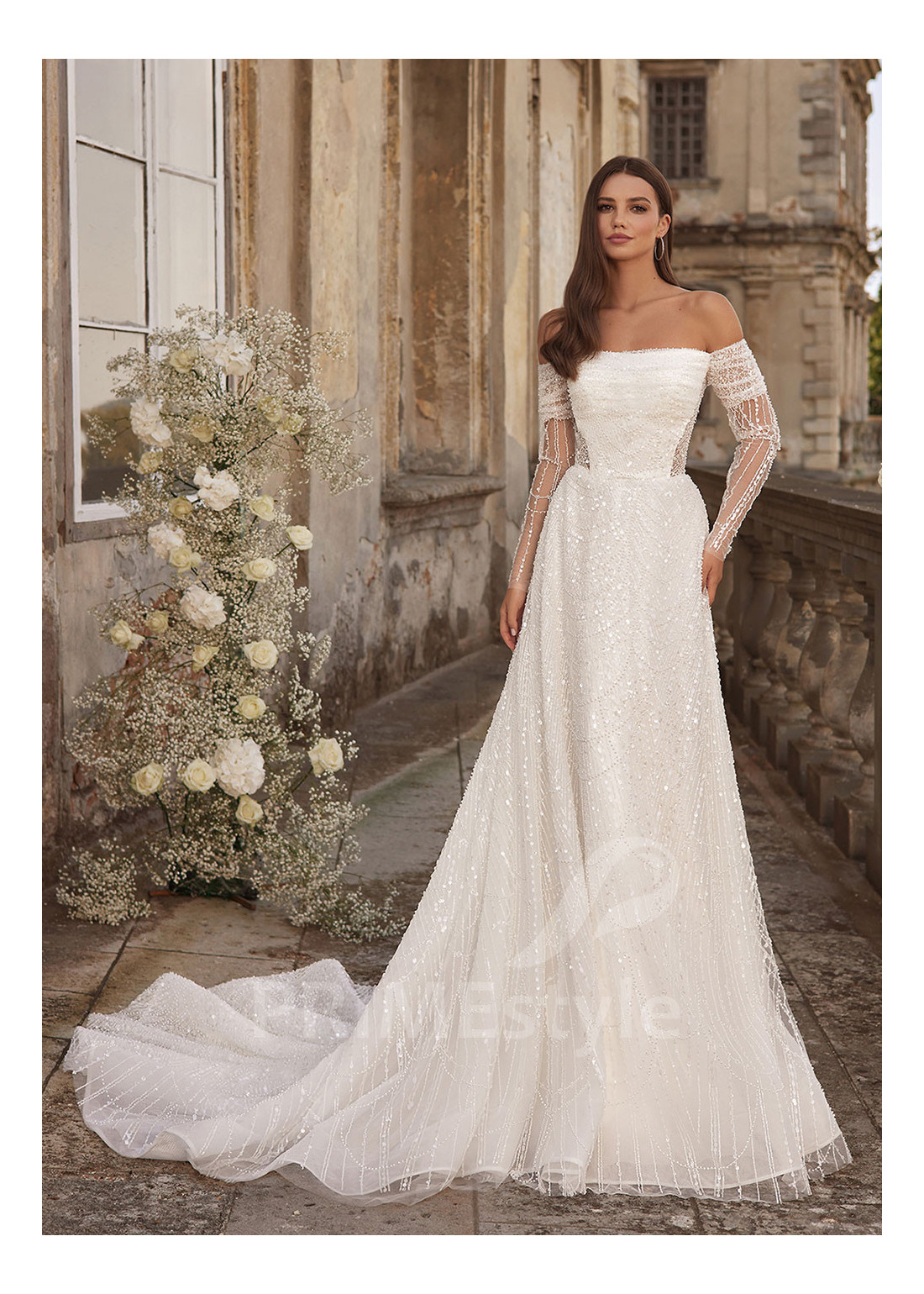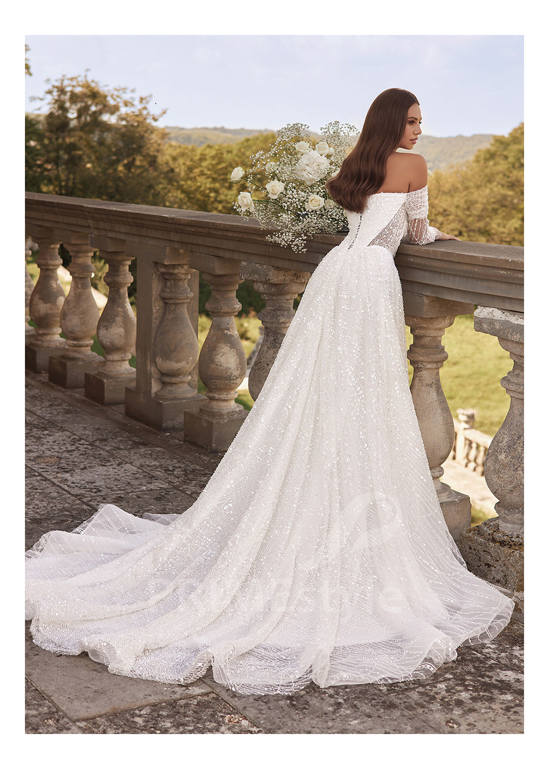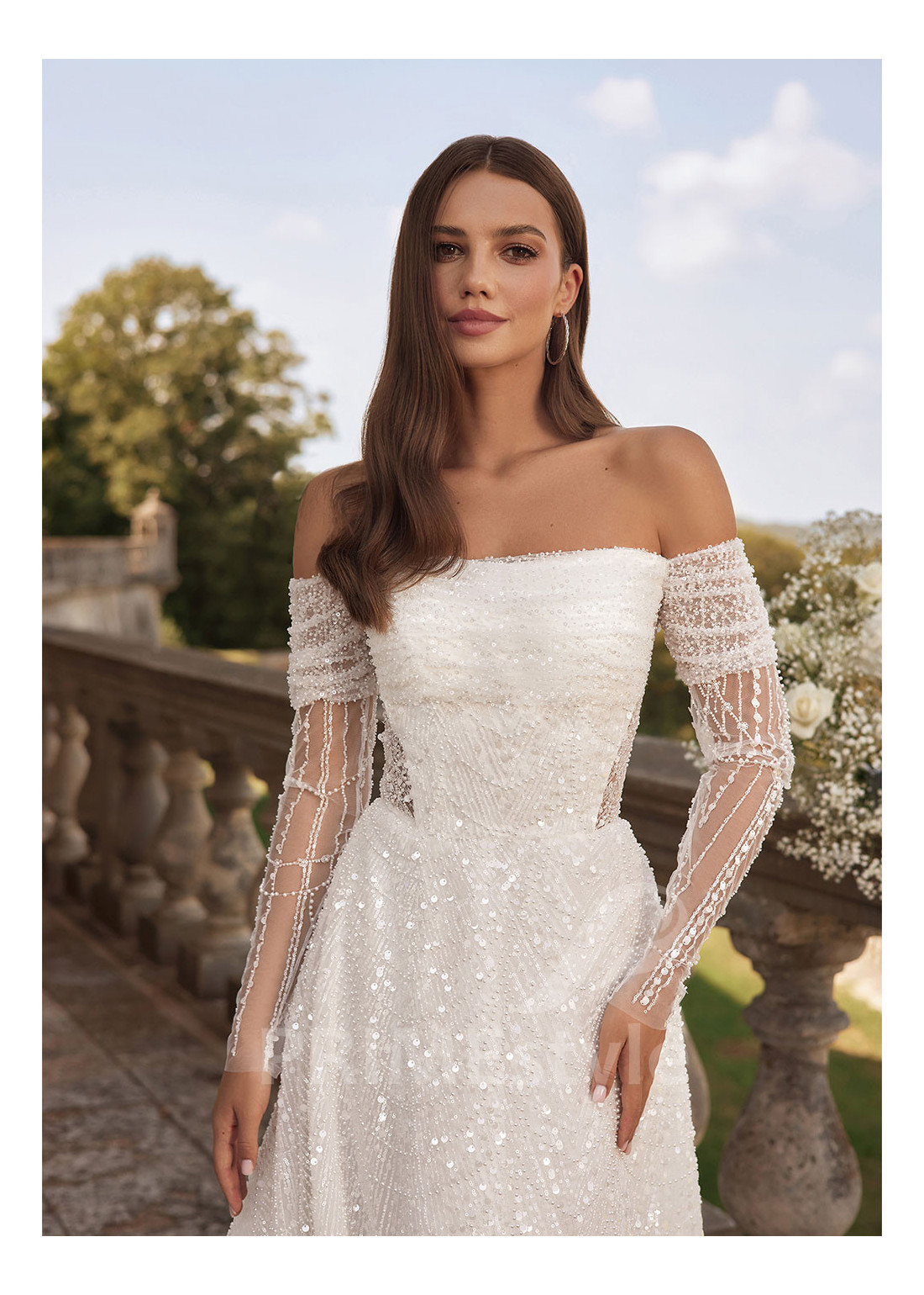 Šarmantné svadobné šaty s otvoreným dekoltom, trendovým rovným výstrihom, odhalenými ramenami a chrbtom, samostatnými originálne tvarovanými čipkovanými rukávmi a rozkošnou tylovou sukňou. Celé šaty sú zdobené nádhernou čipkou, vyšívanou flitrami a korálkami.