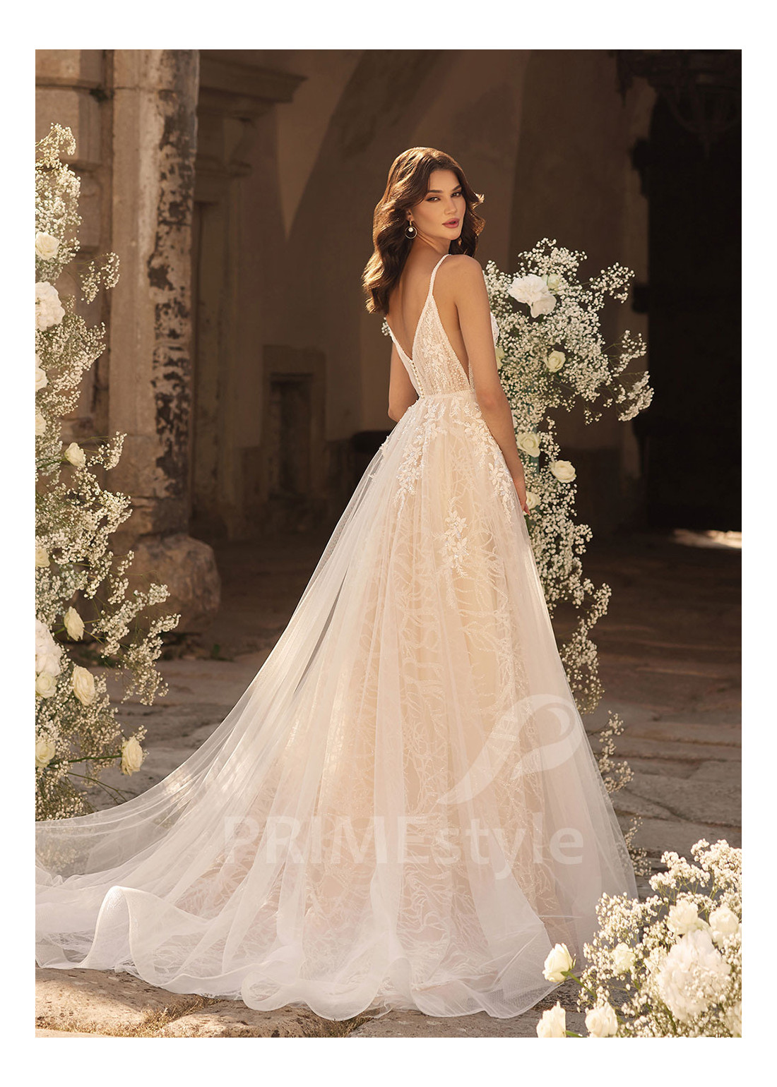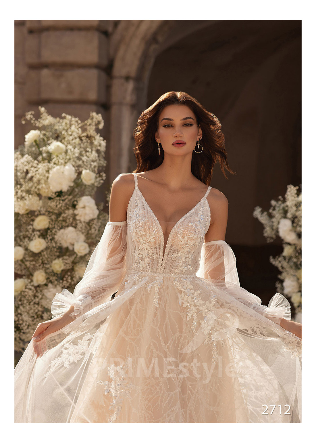 Šarmantné svadobné šaty na ramienka so samostatnými balónovými rukávmi, otvoreným dekoltom, hlbokým výstrihom do V-čka, odhaleným chrbtom a objemnou krásne tvarovanou tylovou sukňou s vrstvou trblietavého vyorovaného tylu. Korzet a horná časť sukne sú zdobené bohatou vyšívanou čipkou.