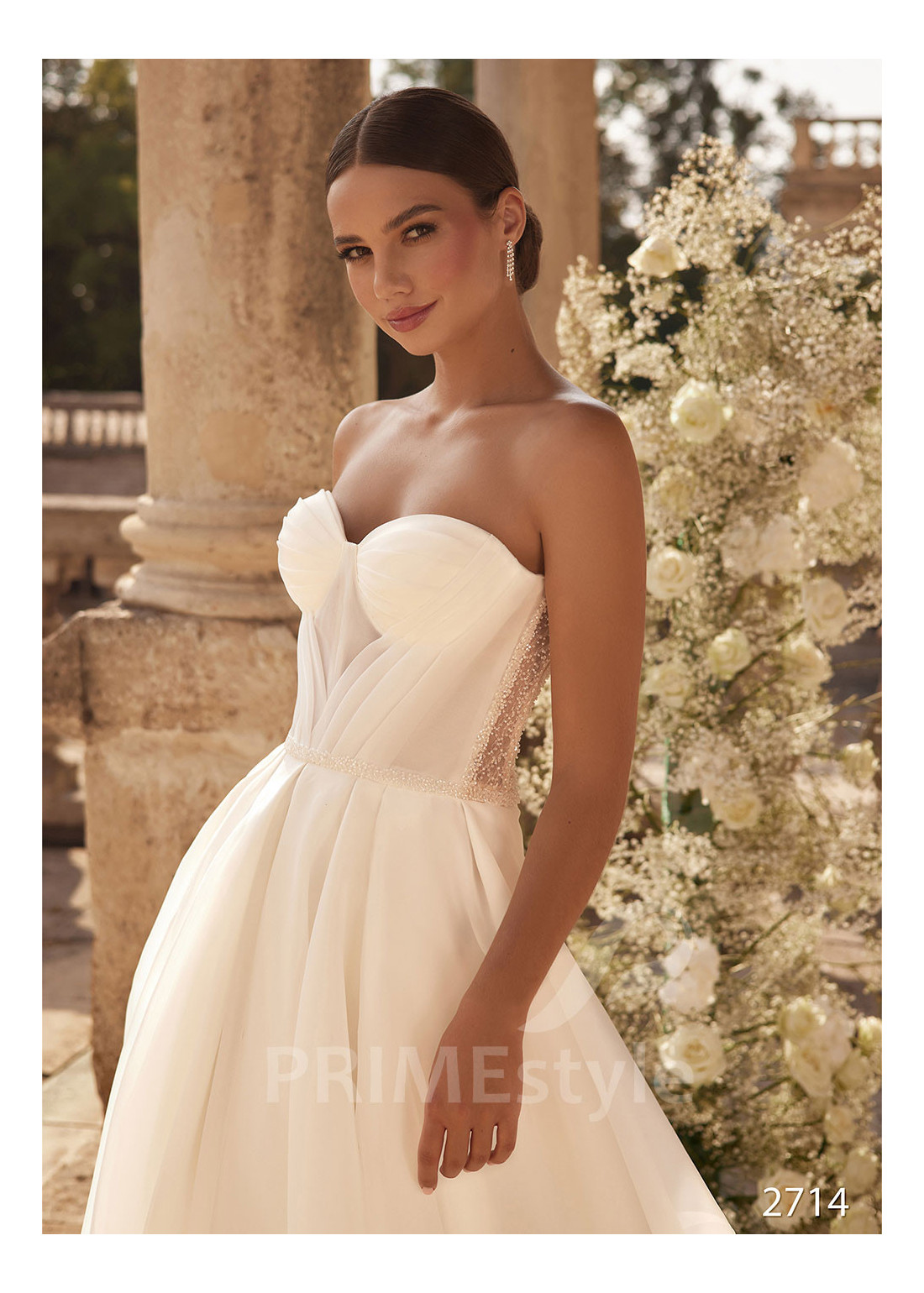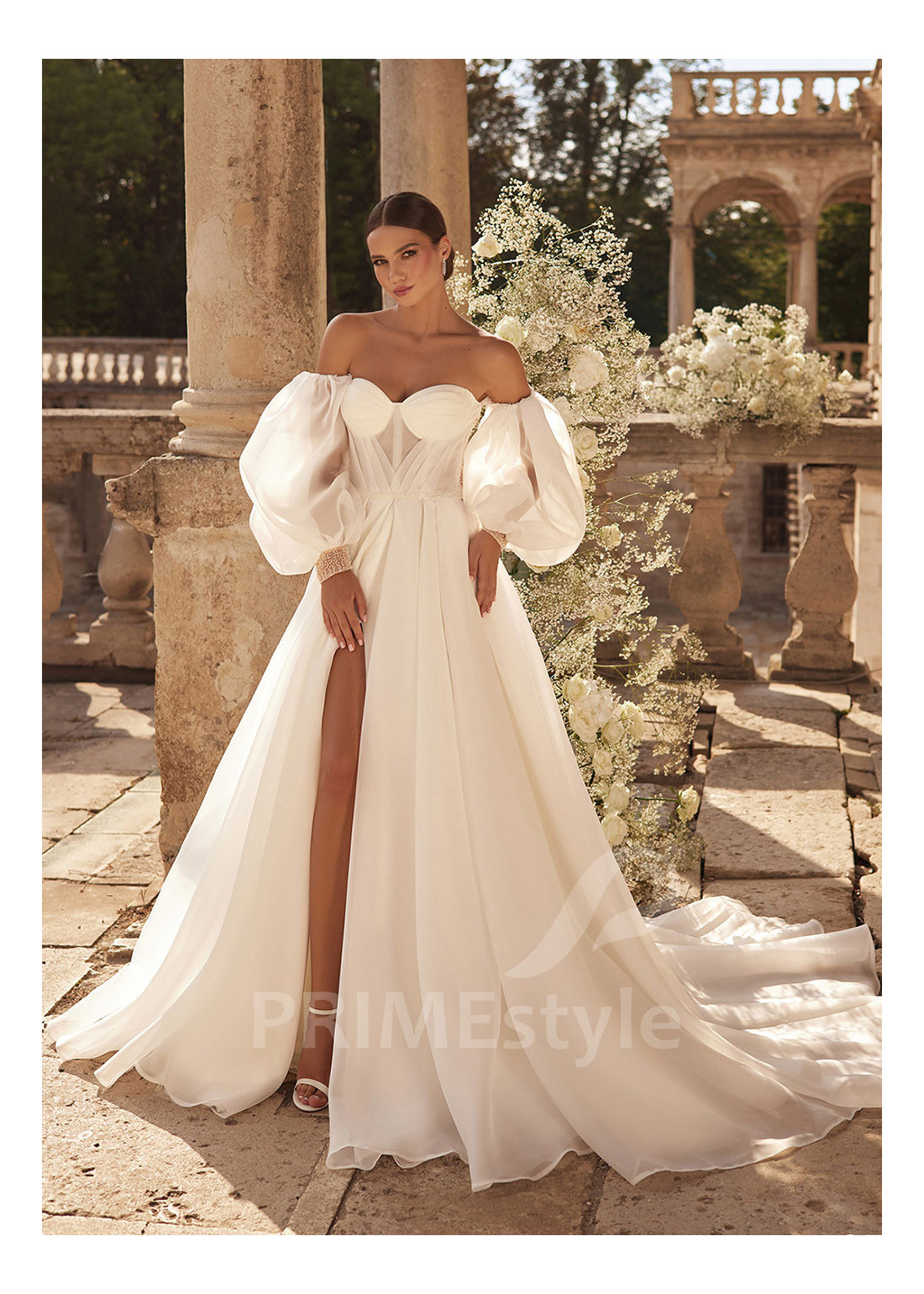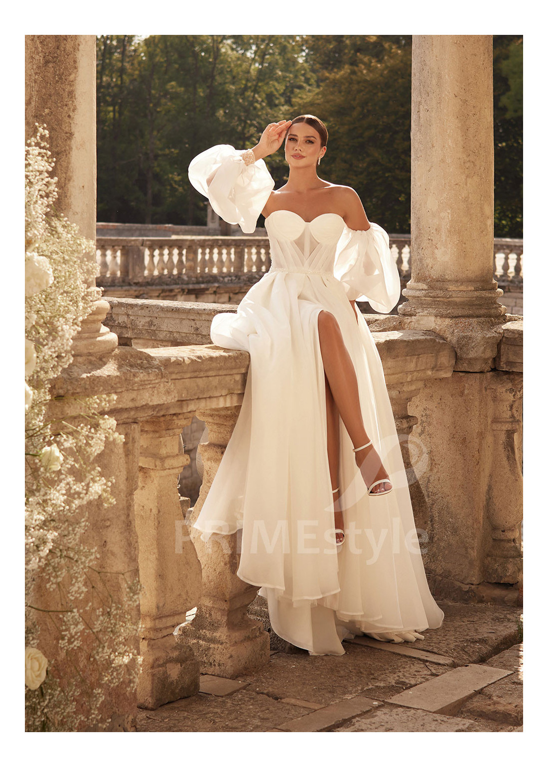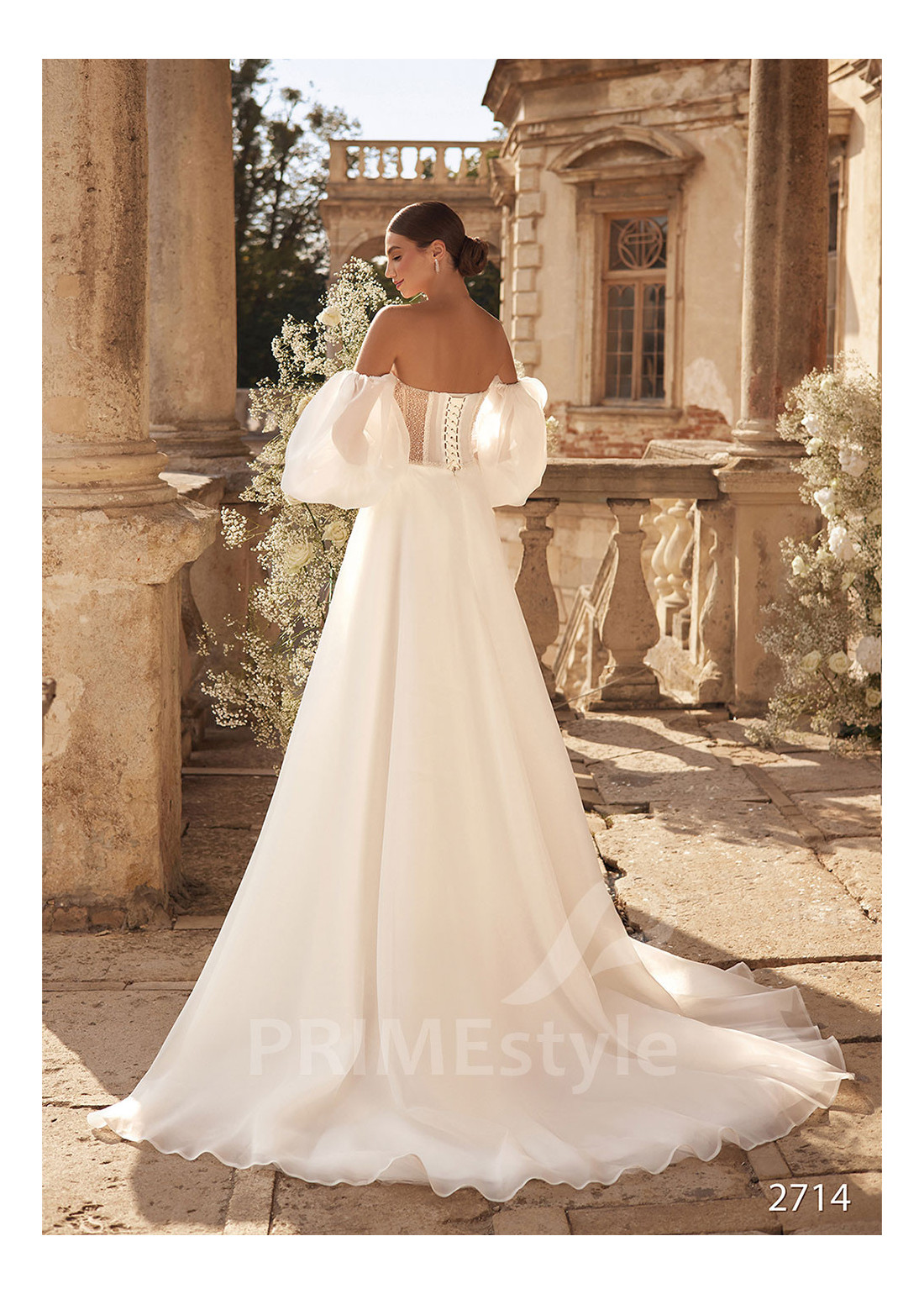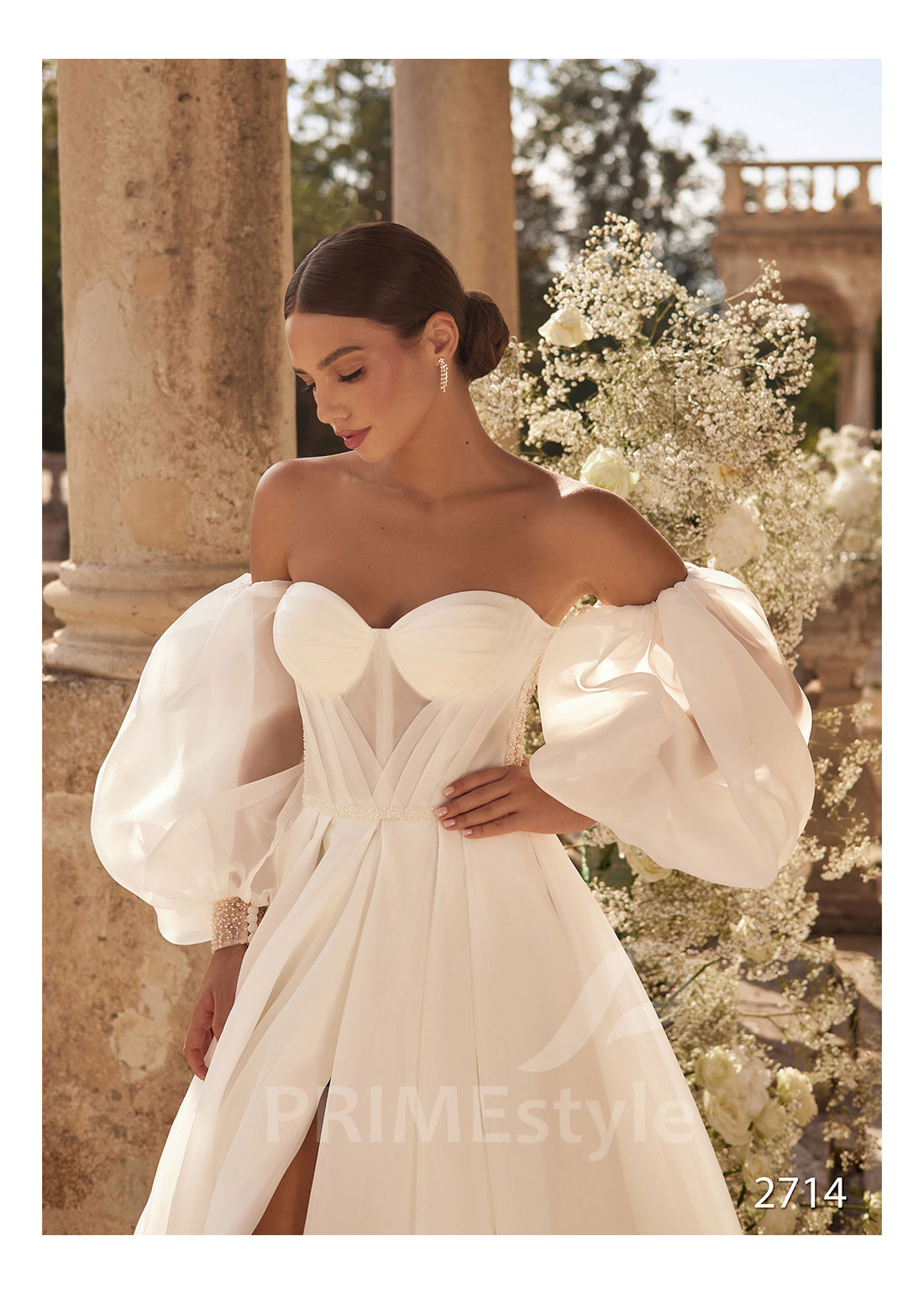 Rozkošné hladké svadobné šaty so samostatnými balónovými rukávmi, otvoreným dekoltom, odhalenými ramenami a chrbtom a objemnou pekne tvarovanou sukňou s rázporkom. Manžety sú dekorované vyšívaným perličkovým pásom.