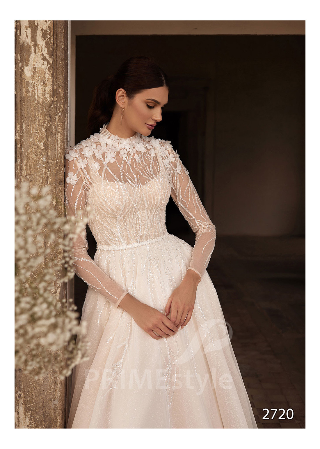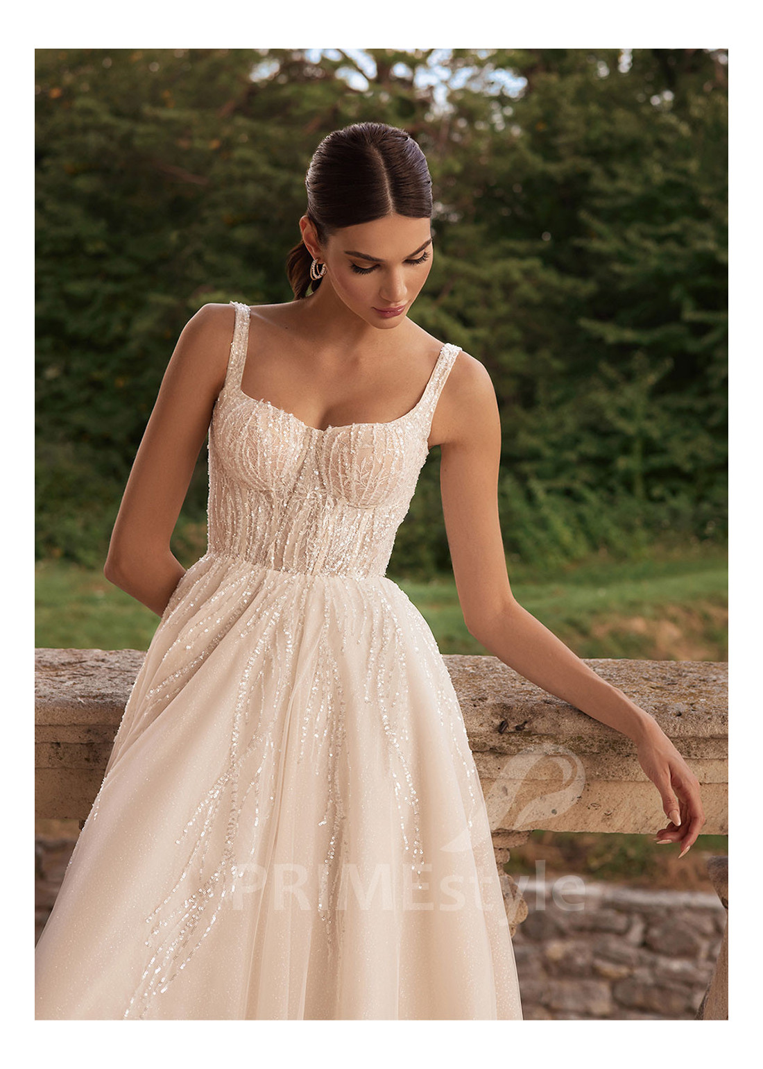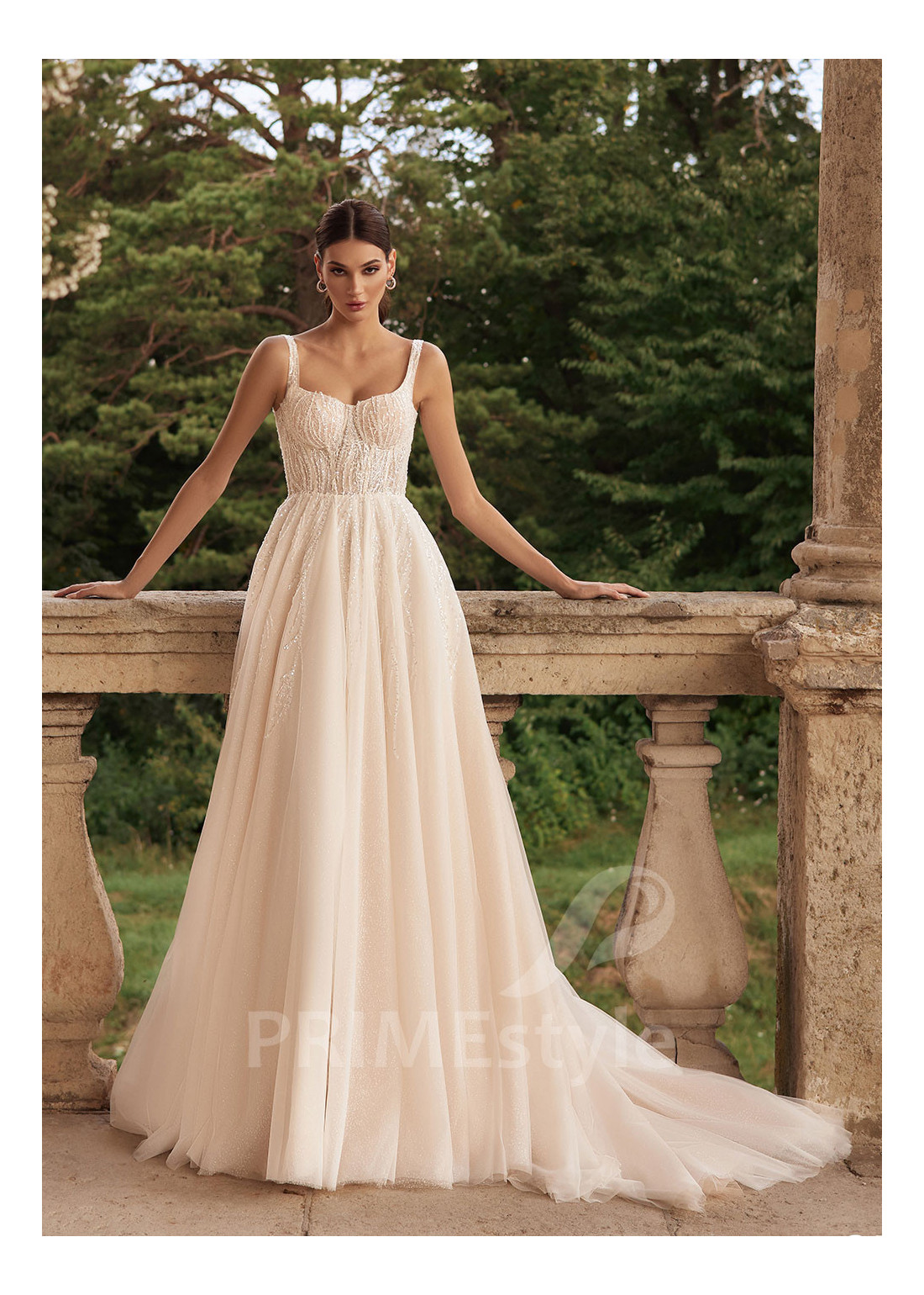 Vkusné trbliertavé svadobné šaty na ramienka s trendovým štvorcovým výstrihom na hrudi, odhaleným chrbtom a objemnou padavou tylovou sukňou s vrstvou trblietavého tylu. Korzet a horná časť sukne sú zdobené bohatou vyšívanou čipkou. Súčasťou šiat je aj bohato zdobené bolerko s dlhým rukávom. Vhodné aj ako svadobné šaty pre staršie nevesty.