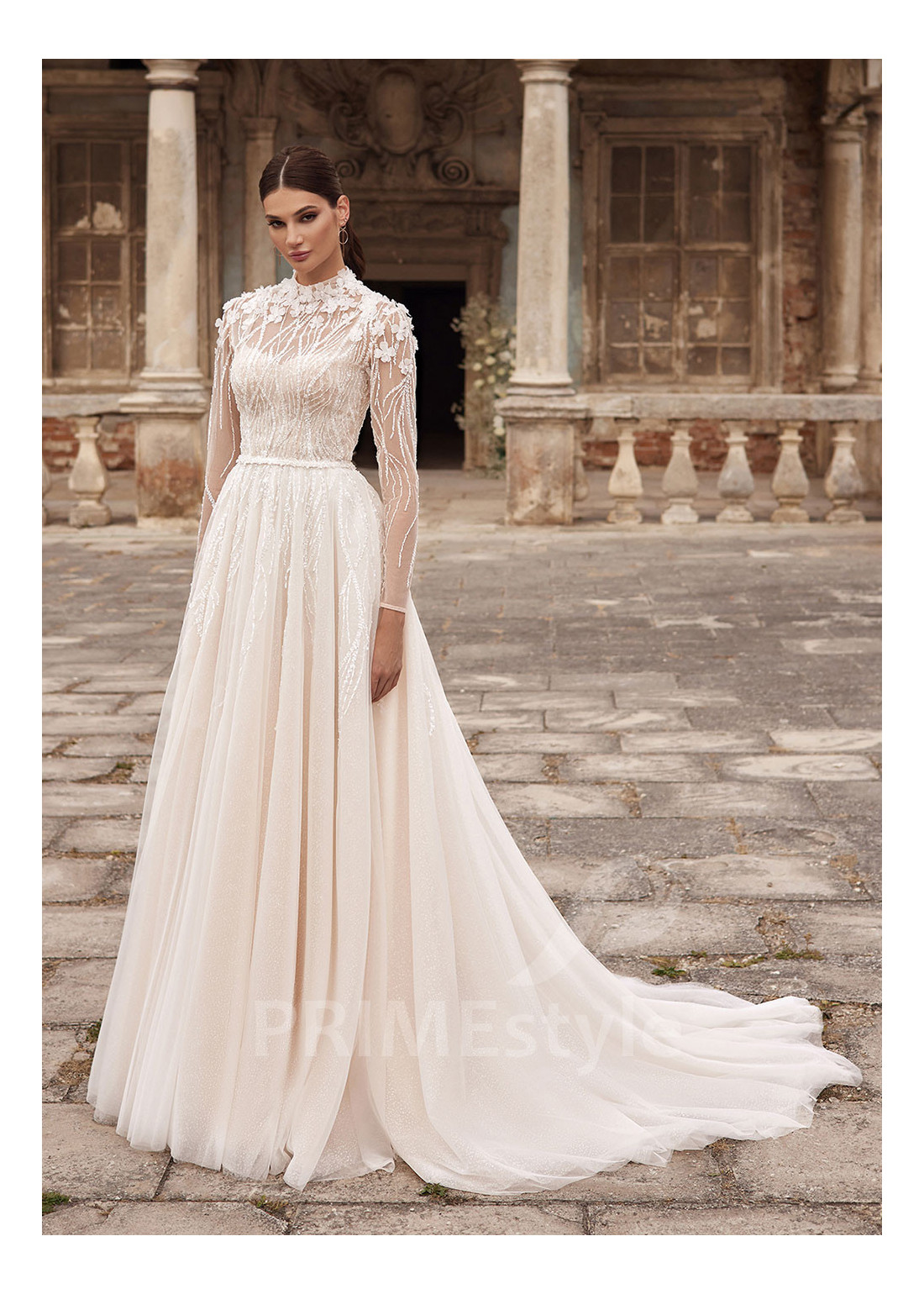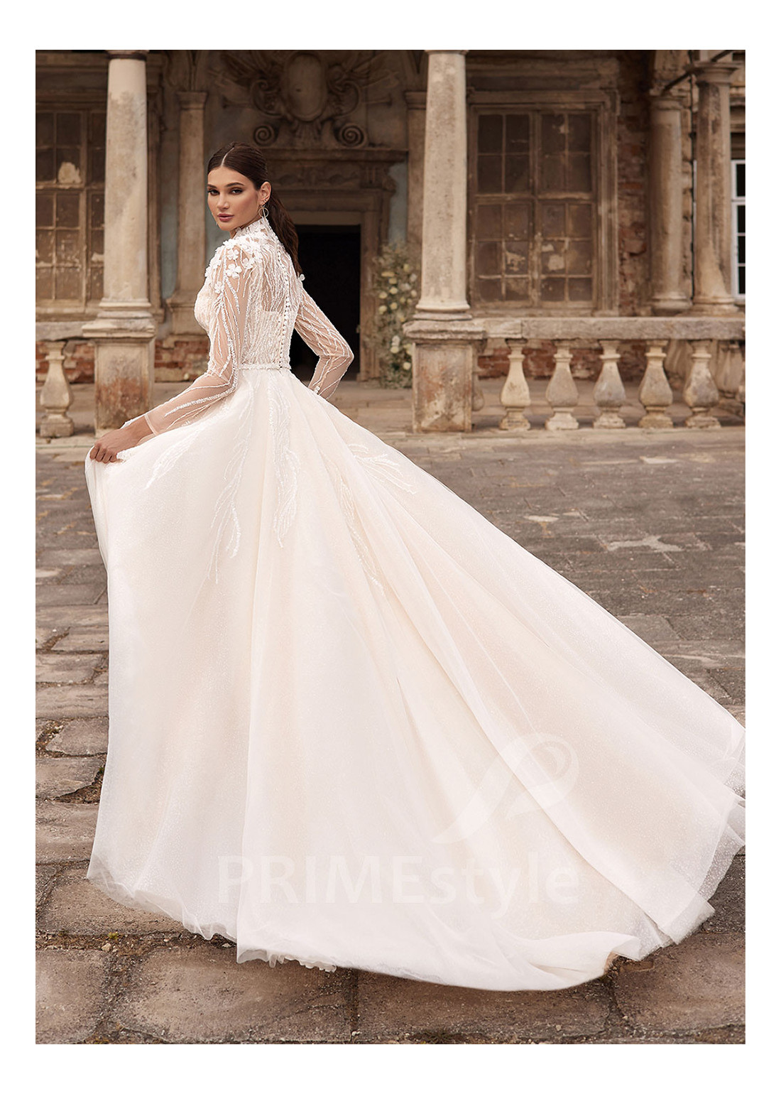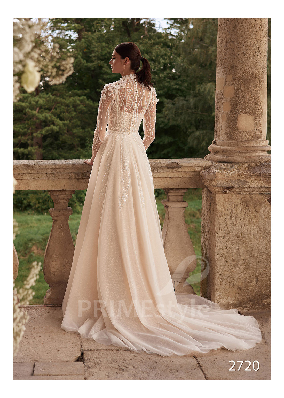 Vkusné trbliertavé svadobné šaty na ramienka s trendovým štvorcovým výstrihom na hrudi, odhaleným chrbtom a objemnou padavou tylovou sukňou s vrstvou trblietavého tylu. Korzet a horná časť sukne sú zdobené bohatou vyšívanou čipkou. Súčasťou šiat je aj bohato zdobené bolerko s dlhým rukávom. Vhodné aj ako svadobné šaty pre staršie nevesty.