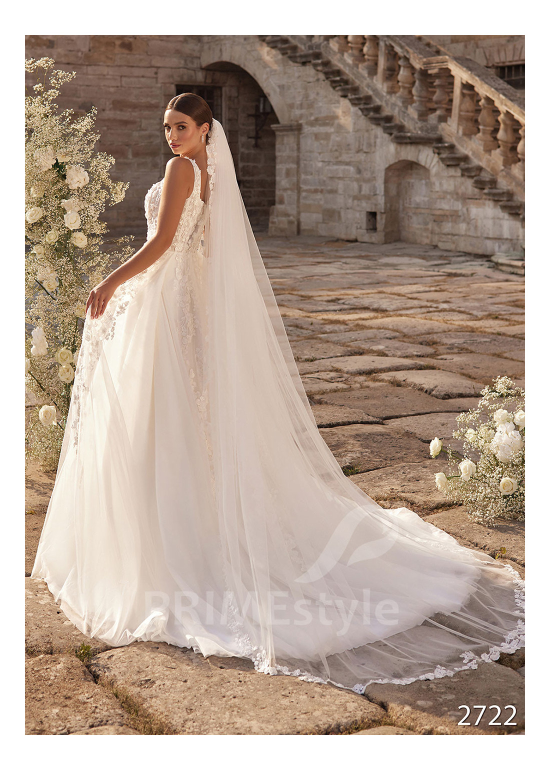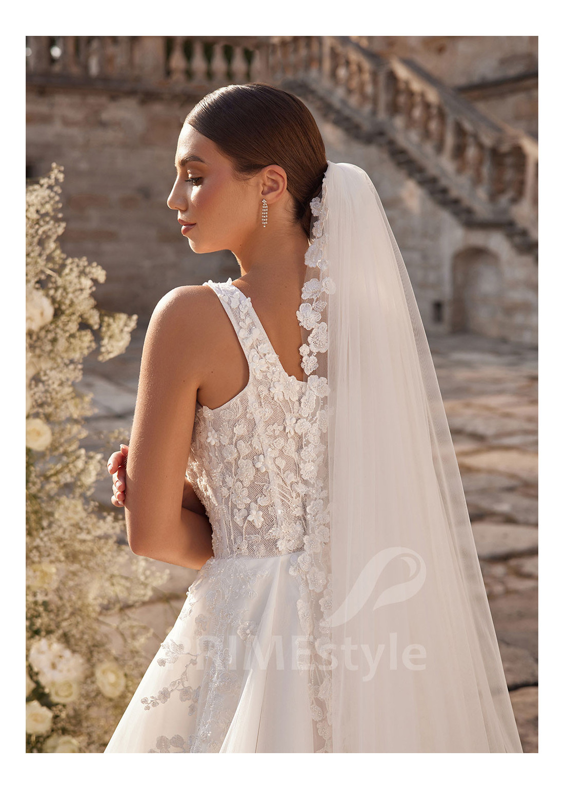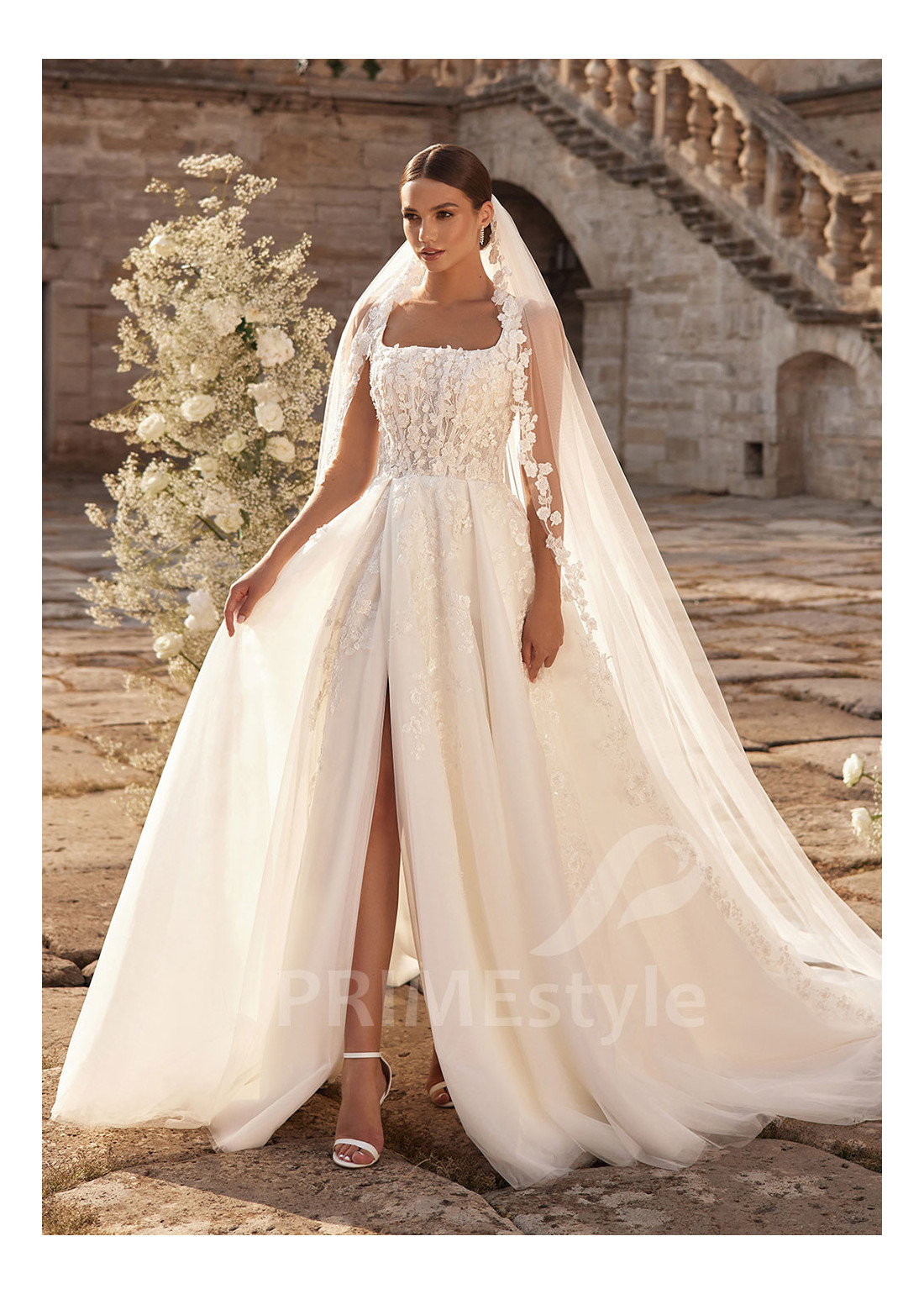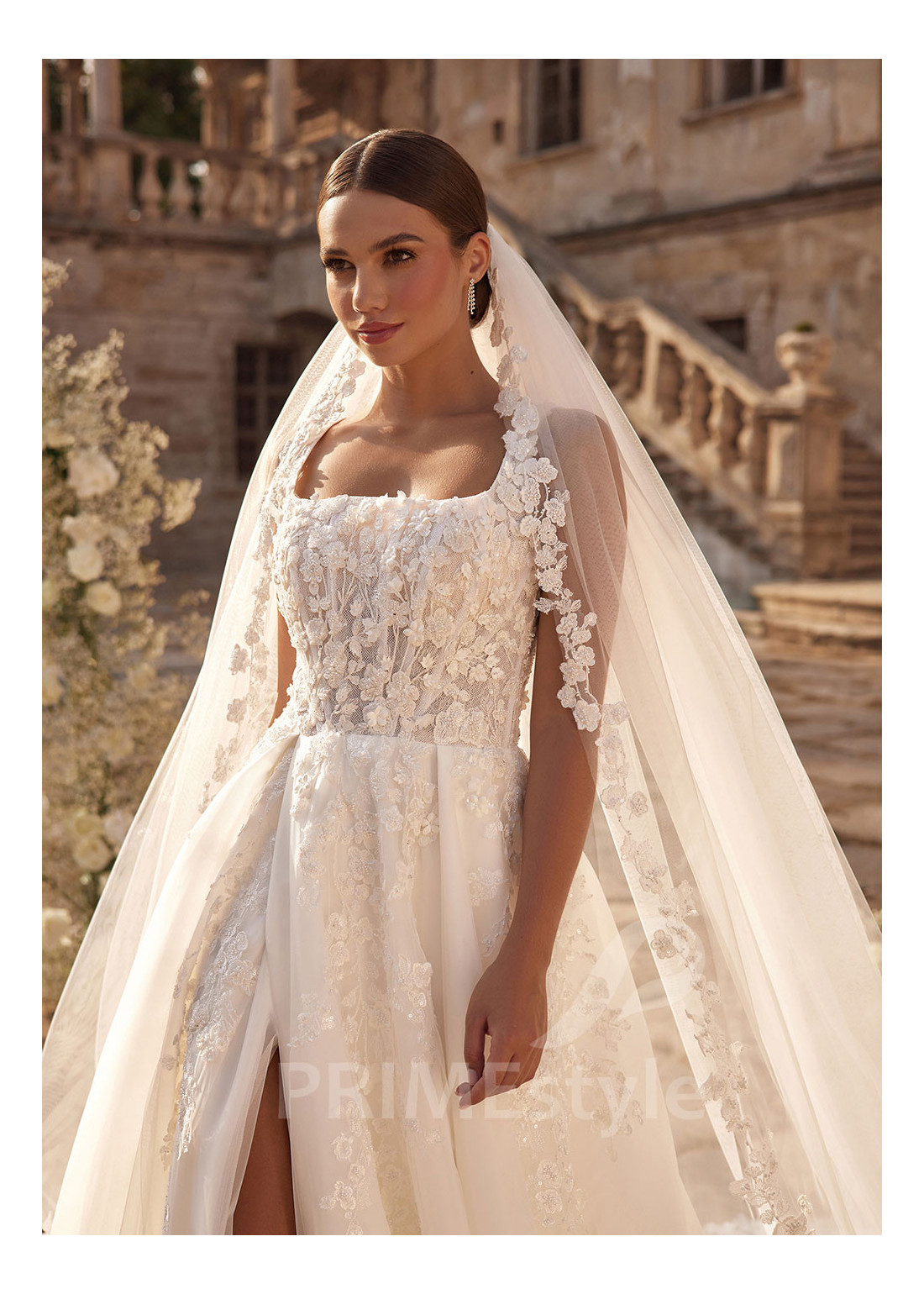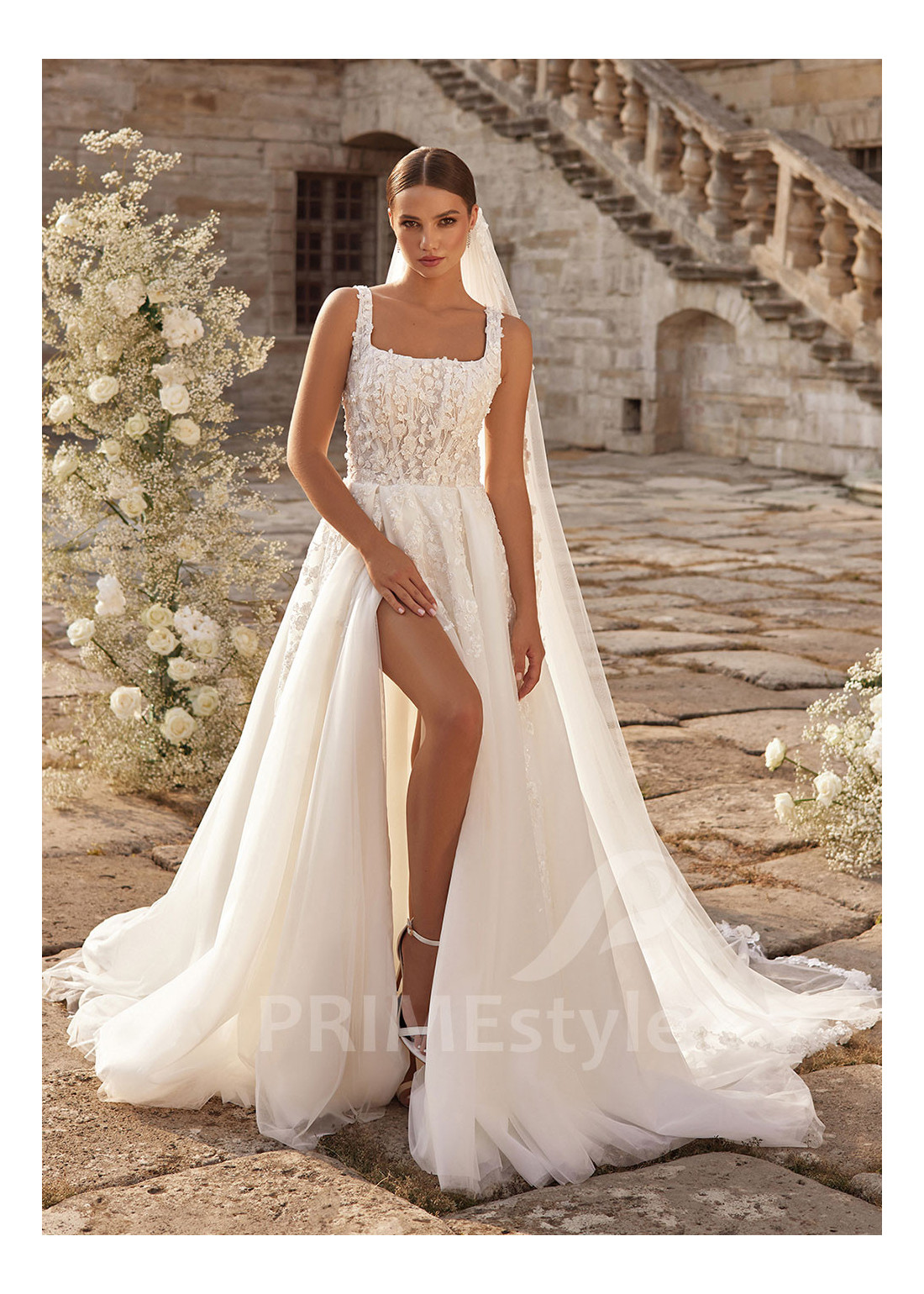 Honosné padavé svadobné šaty na širšie ramienka s trendovým štvorcovým výstrihom na hrudi, mierne odhaleným chrbtom a ľahkou padavou tylovou sukňou. Korzet a horná časť sukne sú zdobené bohatou vyšívanou čipkou s 3D kvetmi.